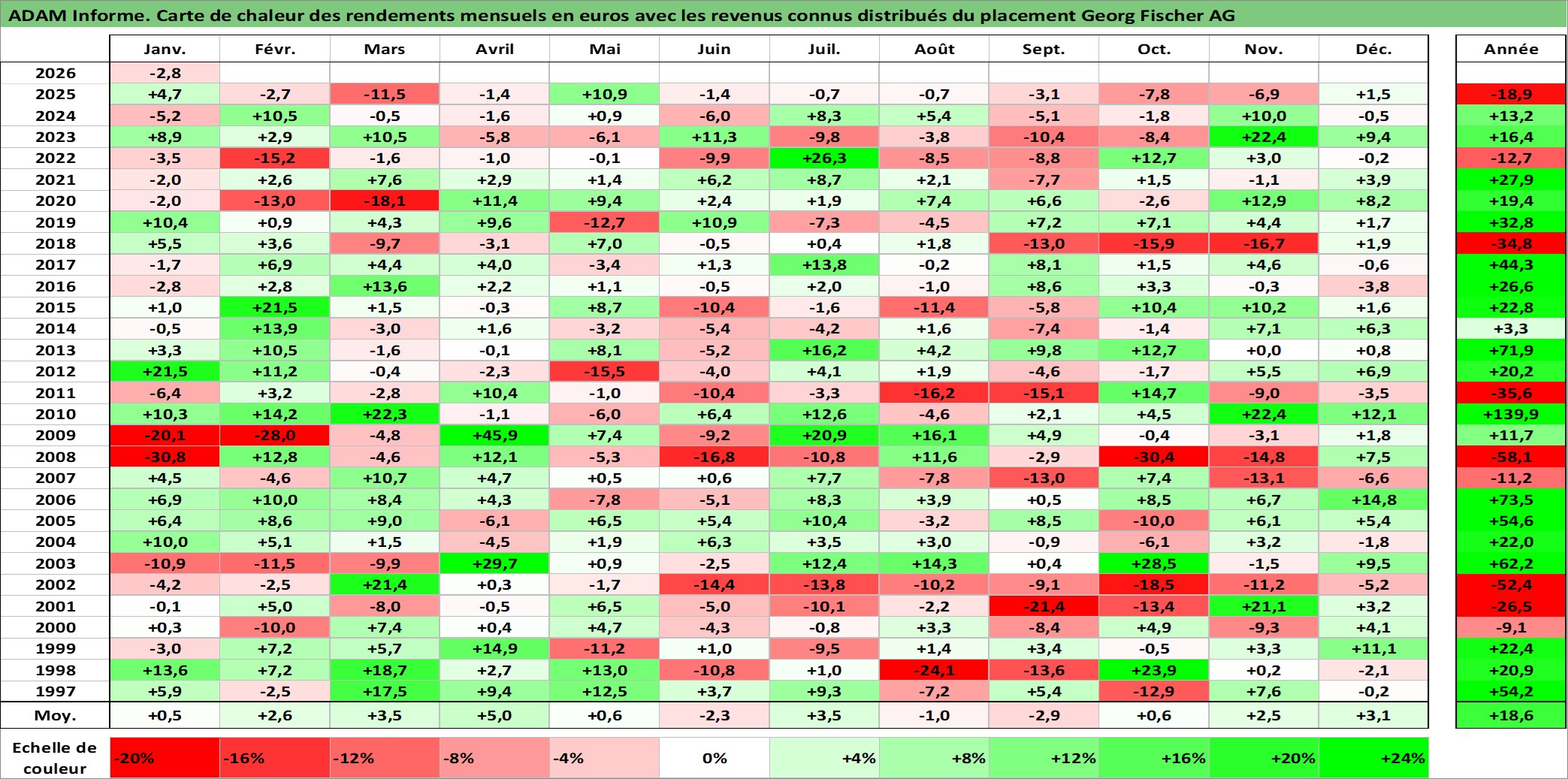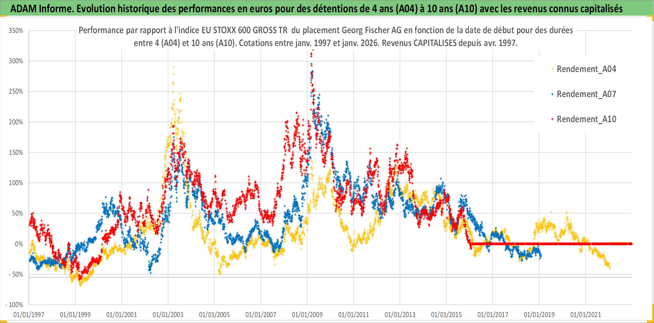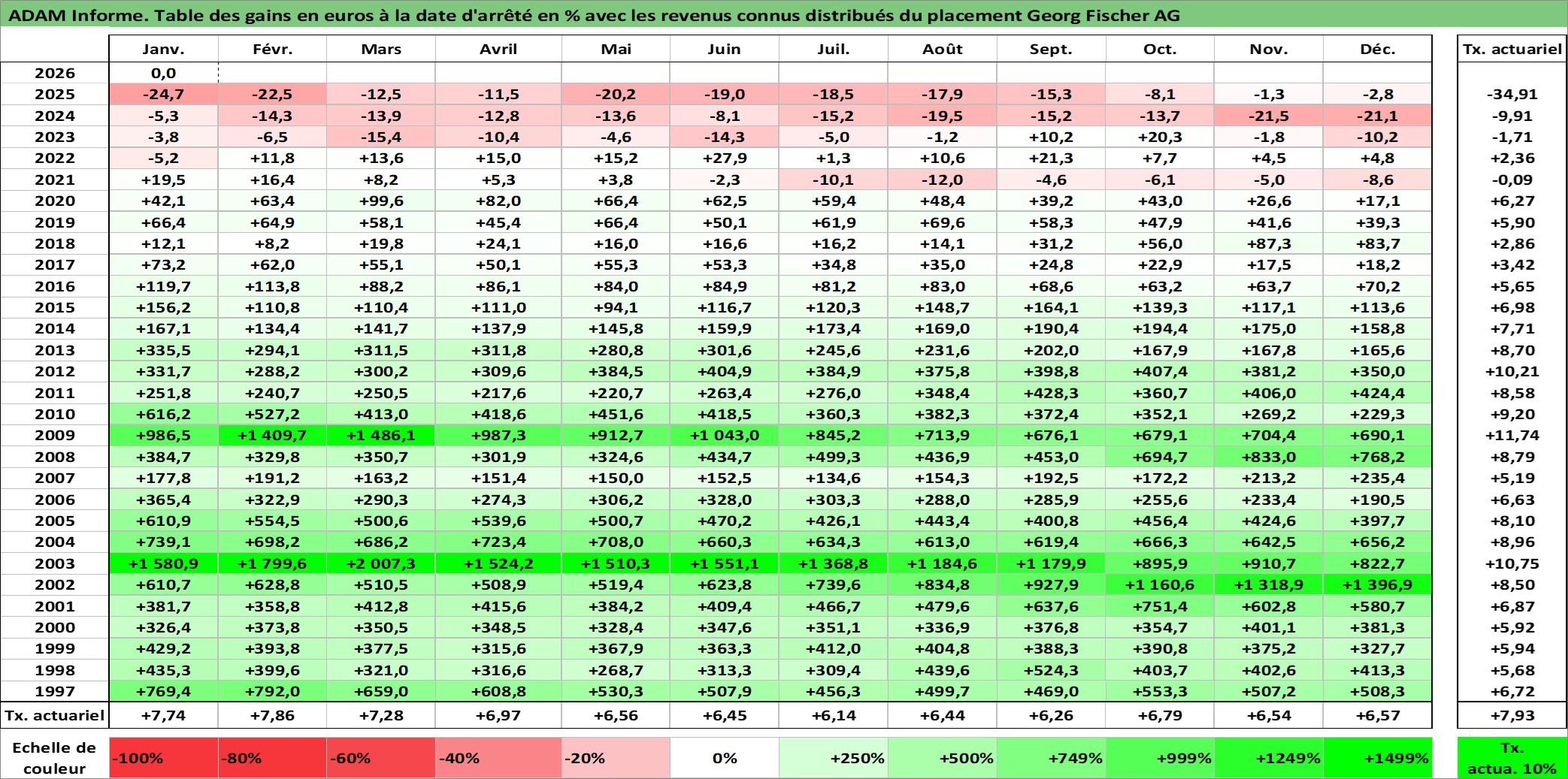 Site dédié aux investisseursPage dédiée sur site financeAnalyse des valorisations hebdomadaires de l'action Georg Fischer AG. Cet actif est cote en CHF. Les valorisations sont en contrevaleur EURO et couvrent les semaines 1997W01 a 2026W05. Les revenus de cet actif financier sont pris en compte depuis la semaine 1997W15. La note ESG de cet actif n'est pas connue.