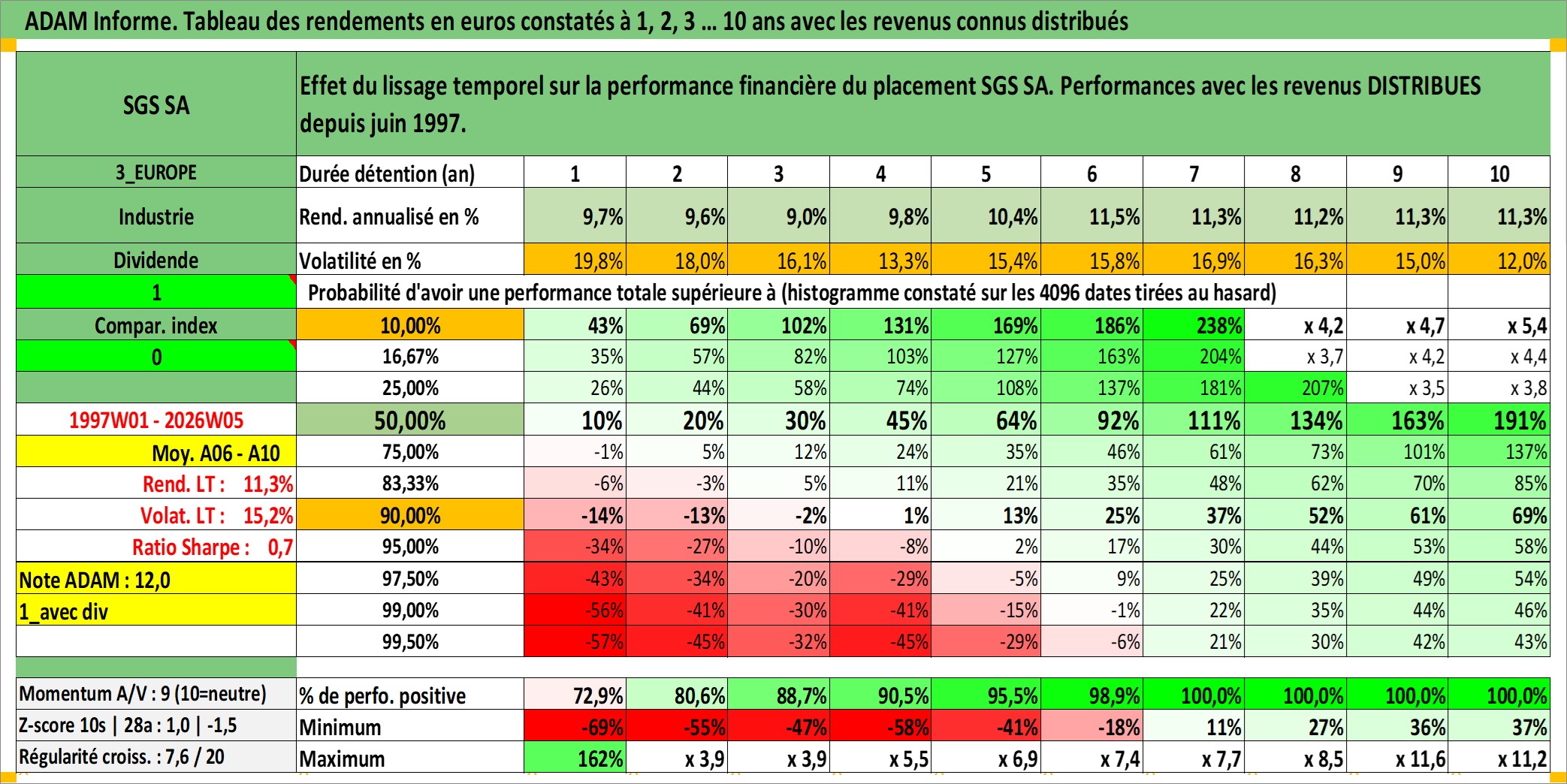Site dédié aux investisseursPage dédiée sur site financeAnalyse des valorisations hebdomadaires de l'action SGS SA. Cet actif est cote en CHF. Les valorisations sont en contrevaleur EURO et couvrent les semaines 1997W01 a 2026W05. Les revenus de cet actif financier sont pris en compte depuis la semaine 1997W24. La note globale ESG de cet actif est estimee a 11.0 (apres rebasage entre 0 et 20).