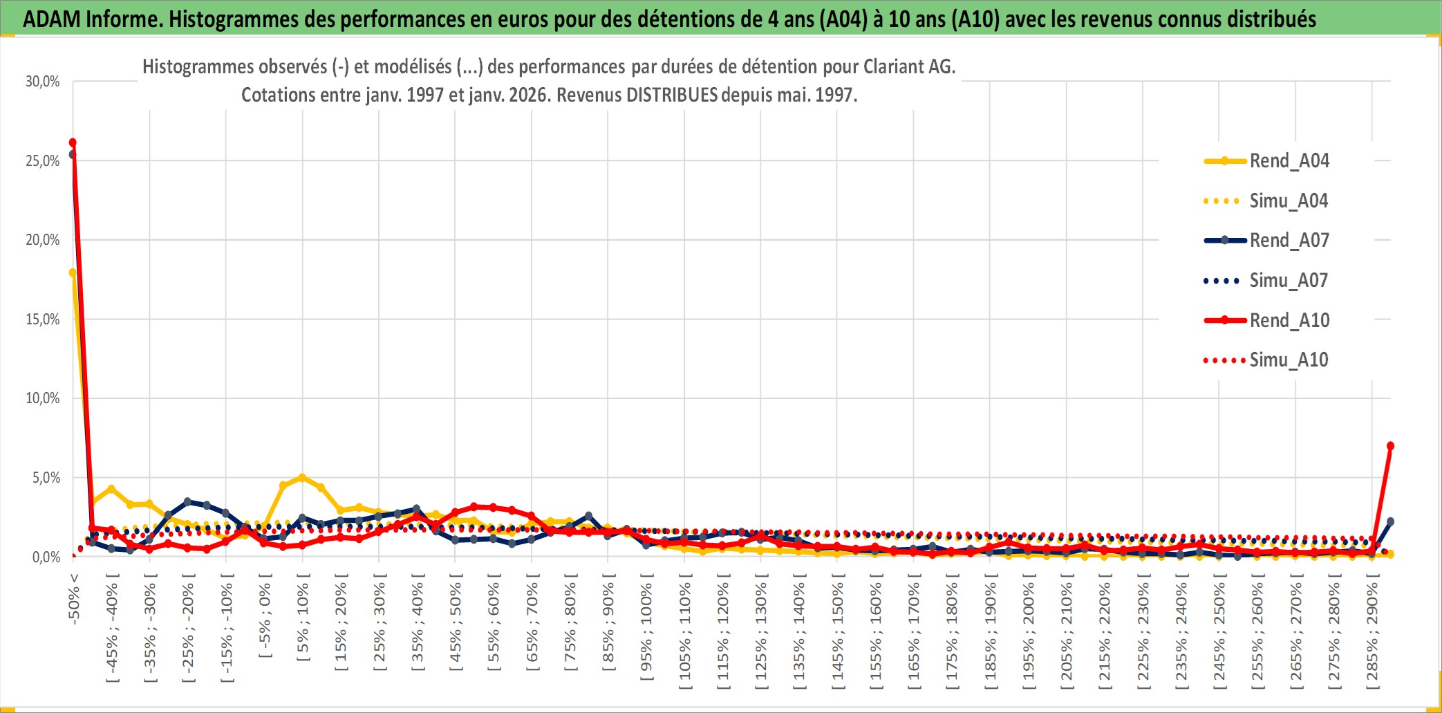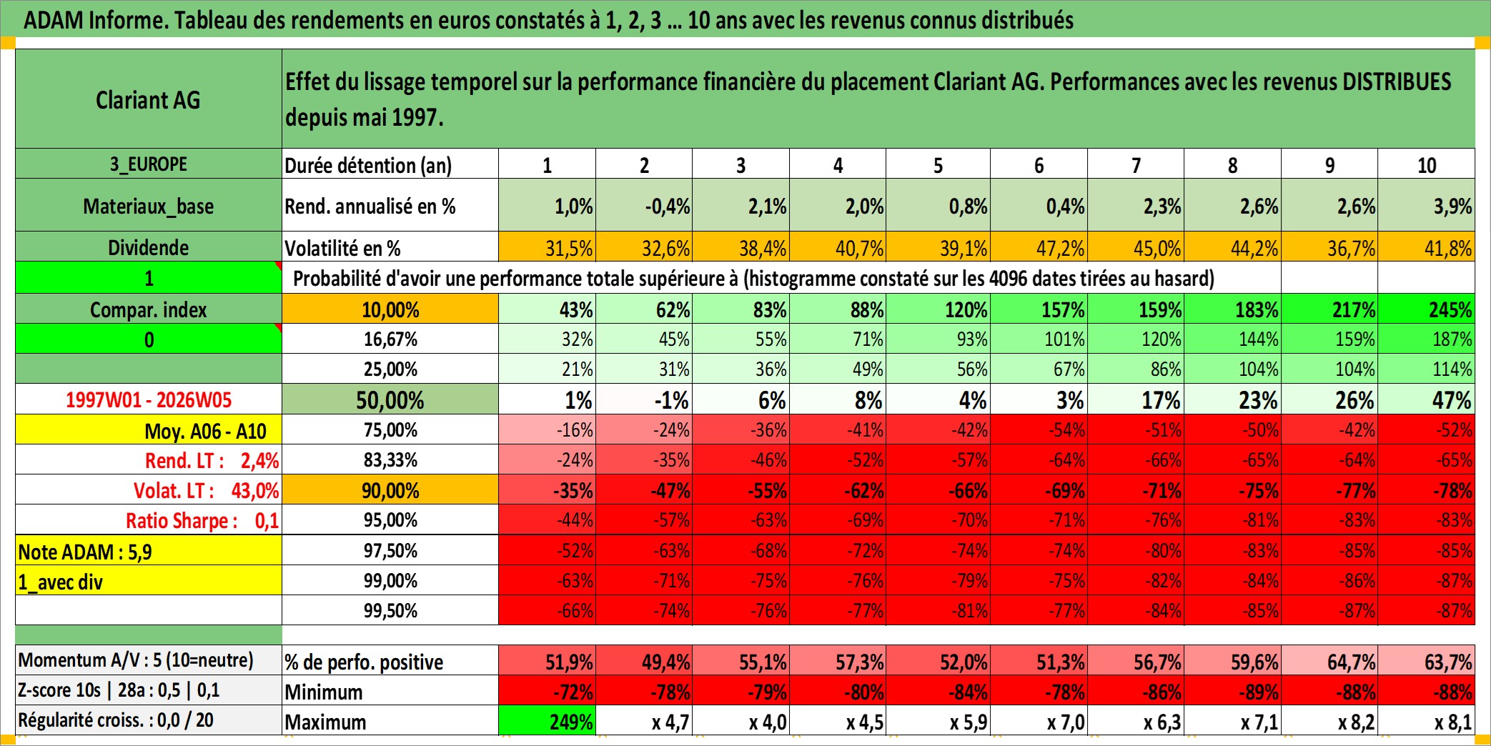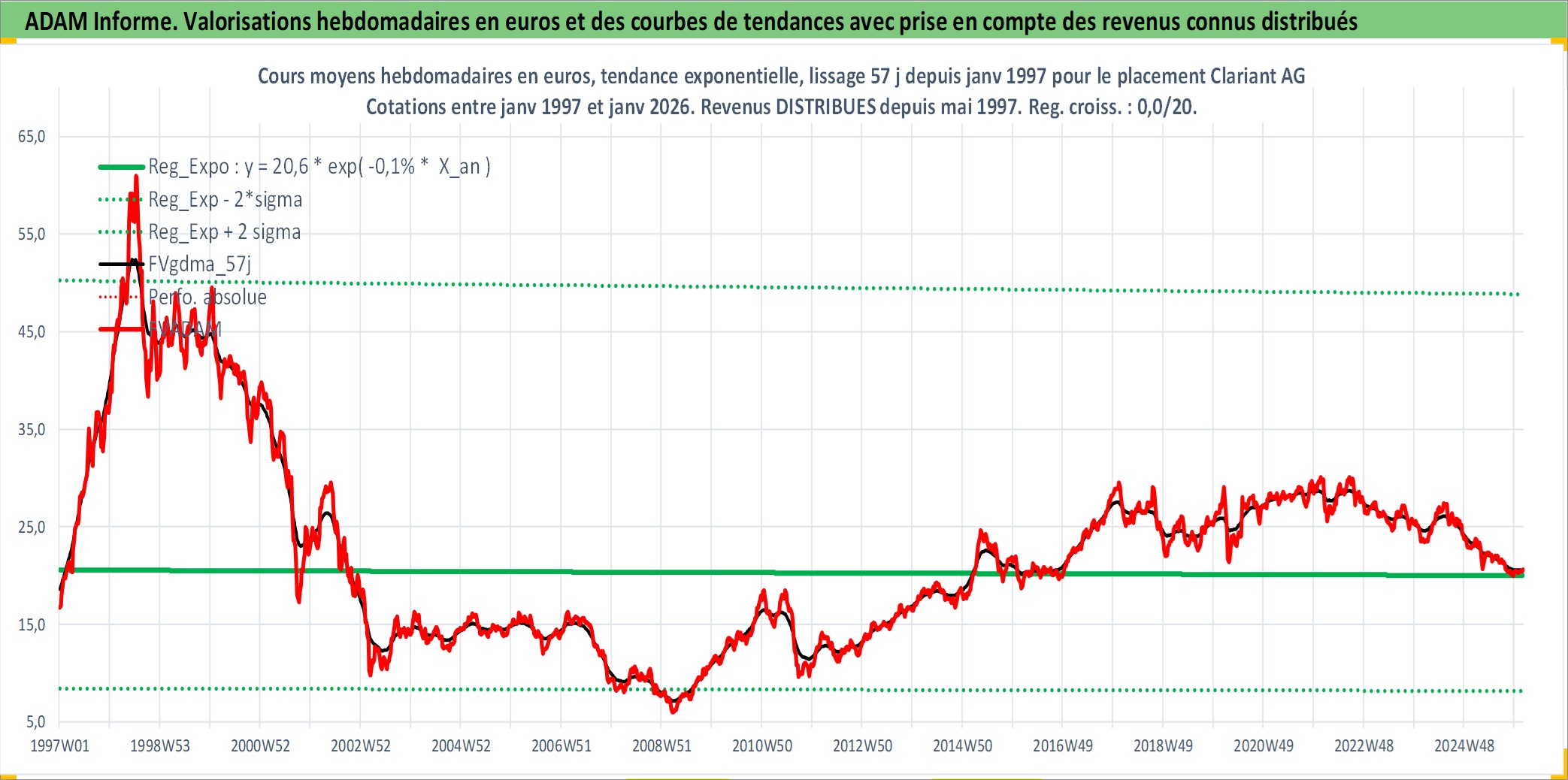 Site dédié aux investisseursPage dédiée sur site financeAnalyse des valorisations hebdomadaires de l'action Clariant AG. Cet actif est cote en CHF. Les valorisations sont en contrevaleur EURO et couvrent les semaines 1997W01 a 2026W05. Les revenus de cet actif financier sont pris en compte depuis la semaine 1997W19. La note globale ESG de cet actif est estimee a 10.0 (apres rebasage entre 0 et 20).