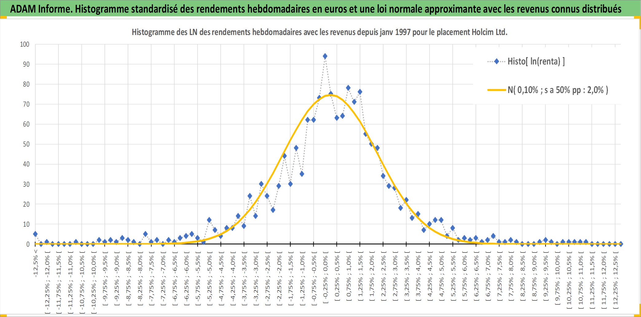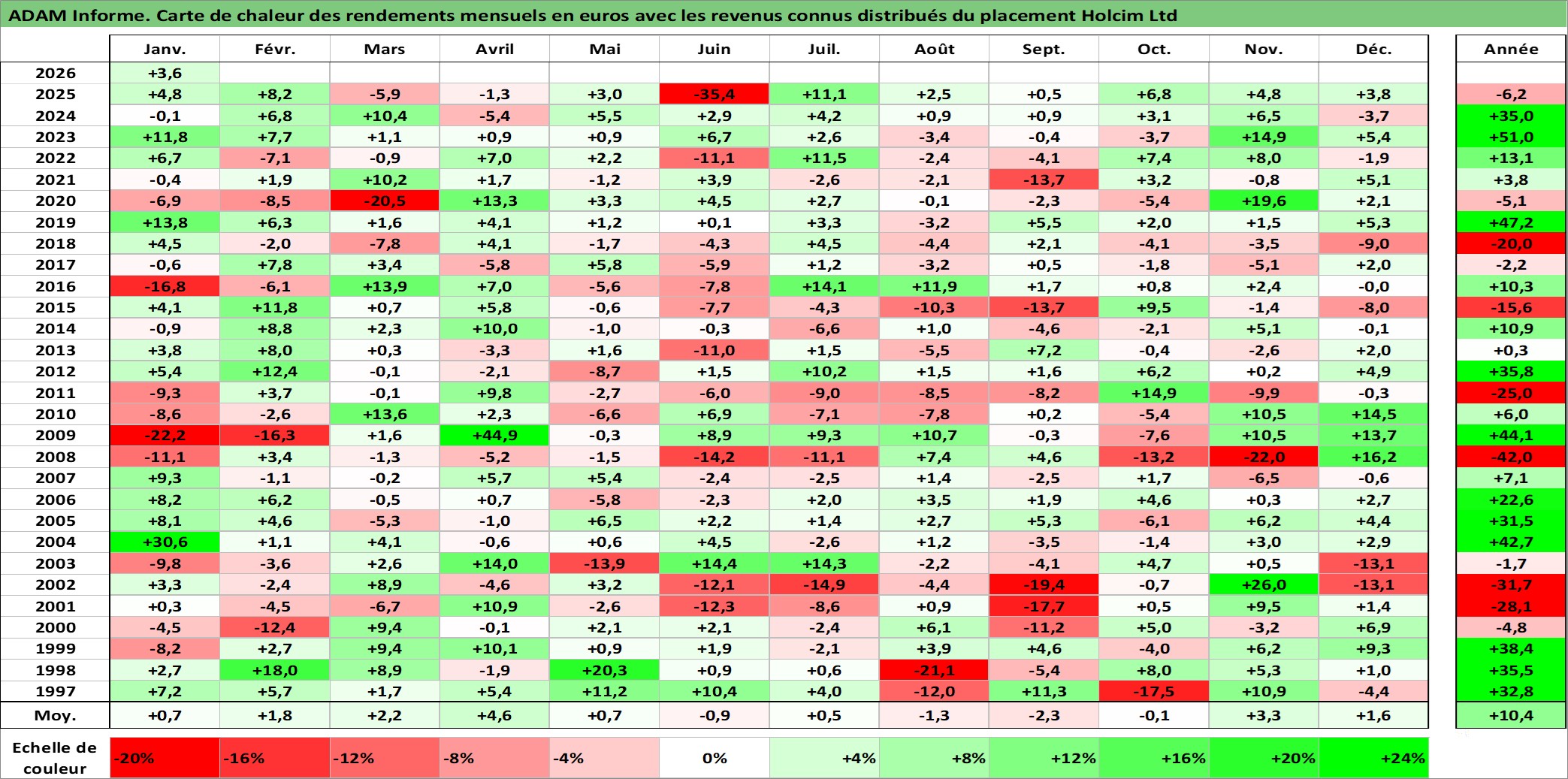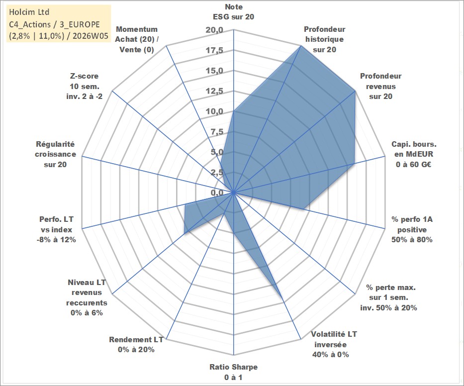 Site dédié aux investisseursPage dédiée sur site financeAnalyse des valorisations hebdomadaires de l'action Holcim Ltd. Cet actif est cote en CHF. Les valorisations sont en contrevaleur EURO et couvrent les semaines 1997W01 a 2026W05. Les revenus de cet actif financier sont pris en compte depuis la semaine 1997W24. La note globale ESG de cet actif est estimee a 10.0 (apres rebasage entre 0 et 20).