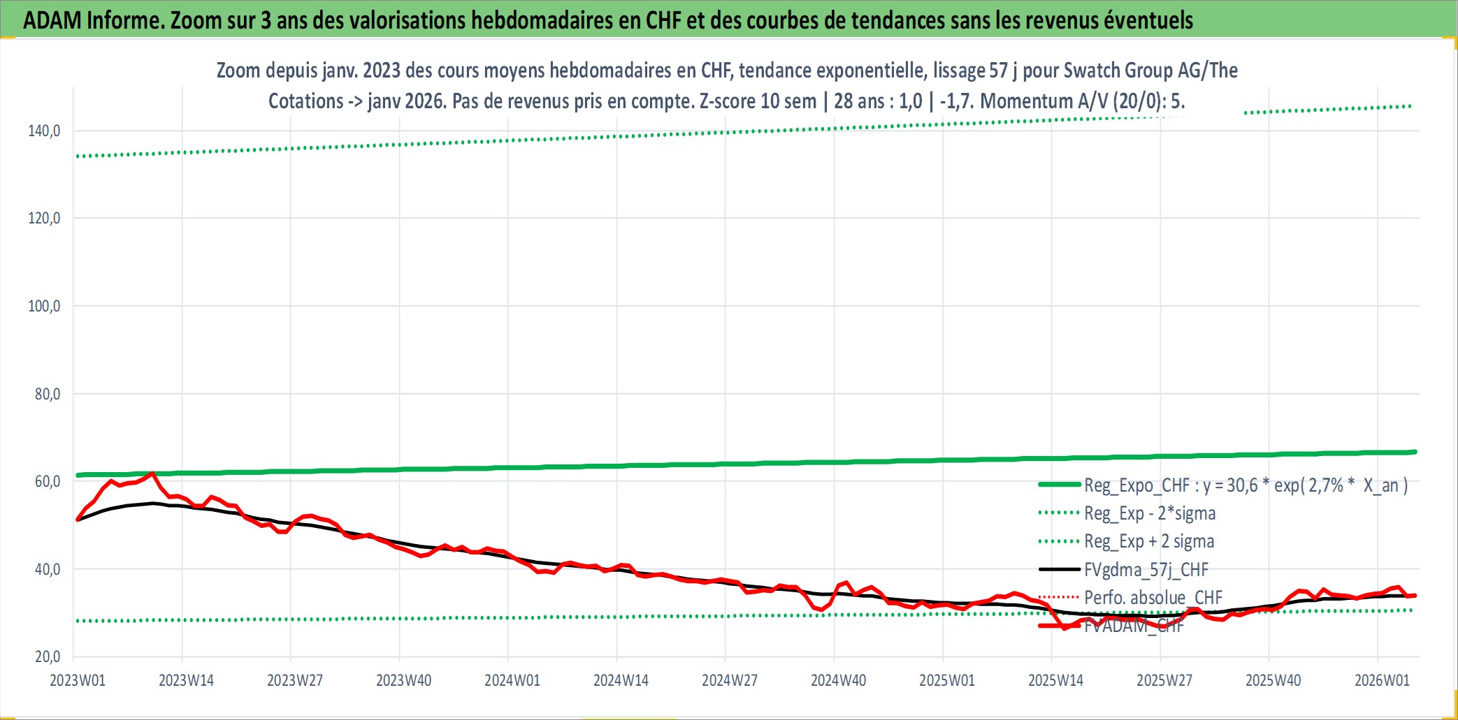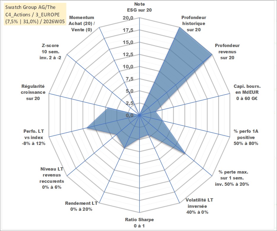Site dédié aux investisseursPage dédiée sur site financeAnalyse des valorisations hebdomadaires de l'action Swatch Group AG/The. Cet actif est cote en CHF. Les valorisations sont en contrevaleur EURO et couvrent les semaines 1997W01 a 2026W05. Les revenus de cet actif financier sont pris en compte depuis la semaine 1997W26. La note ESG de cet actif n'est pas connue.