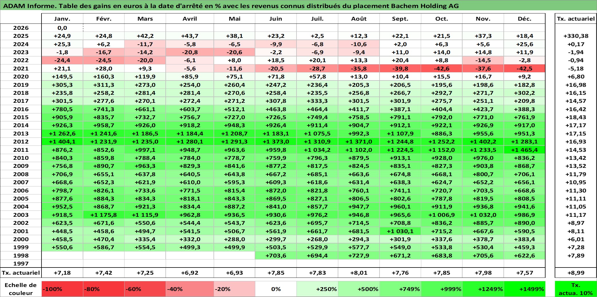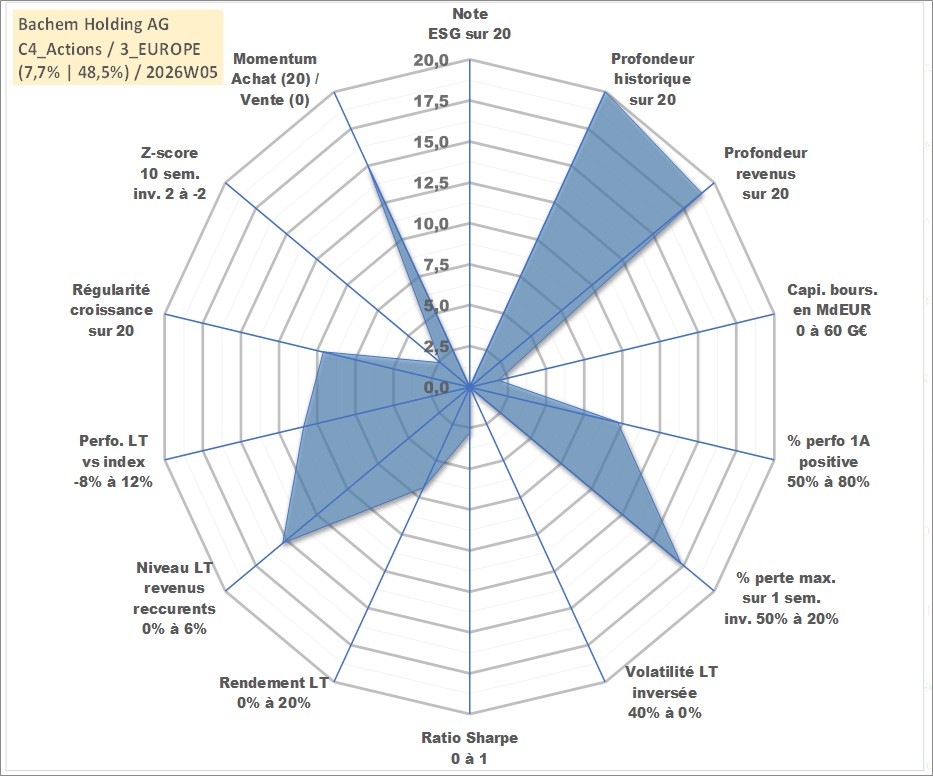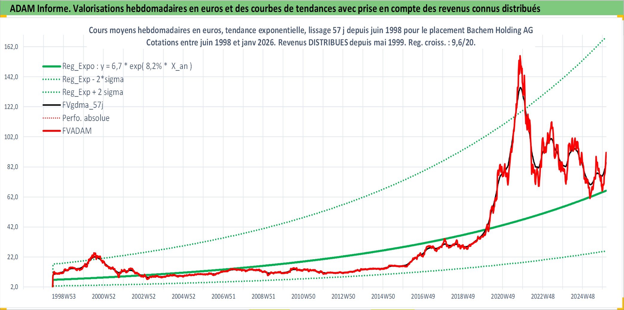 Site dédié aux investisseursPage dédiée sur site financeAnalyse des valorisations hebdomadaires de l'action Bachem Holding AG. Cet actif est cote en CHF. Les valorisations sont en contrevaleur EURO et couvrent les semaines 1998W25 a 2026W05. Les revenus de cet actif financier sont pris en compte depuis la semaine 1999W18. La note ESG de cet actif n'est pas connue.