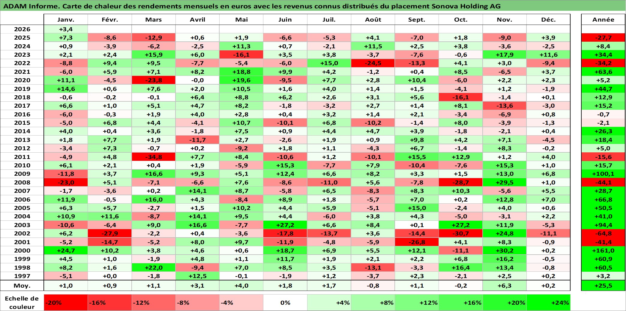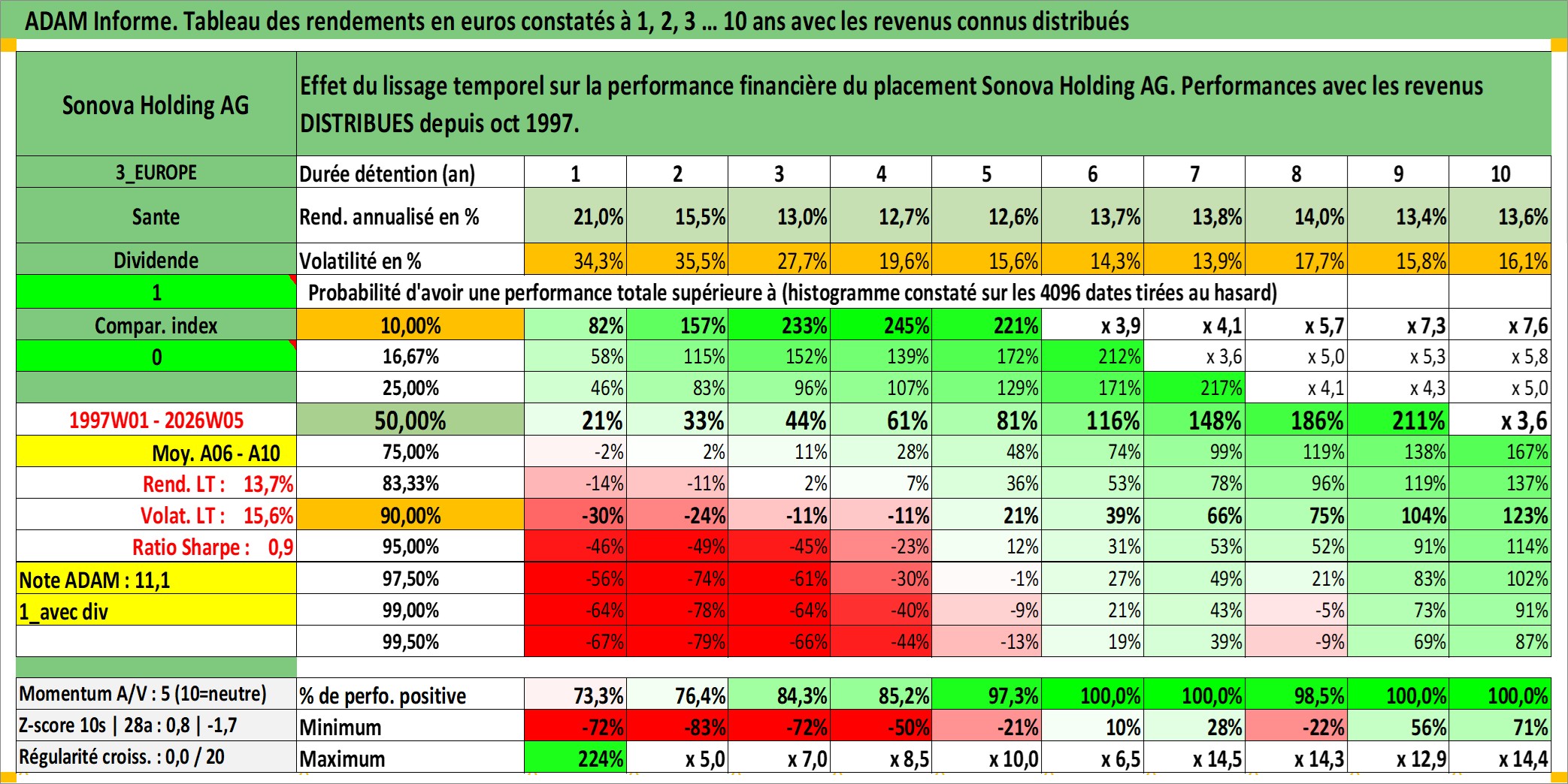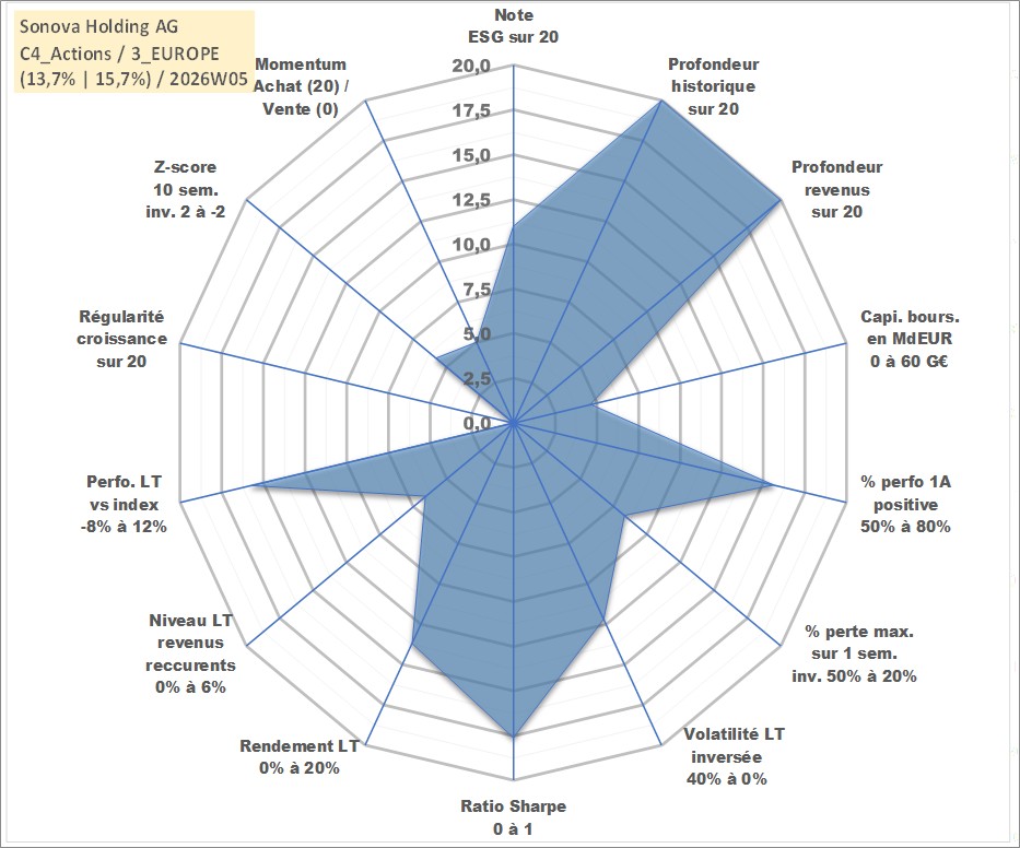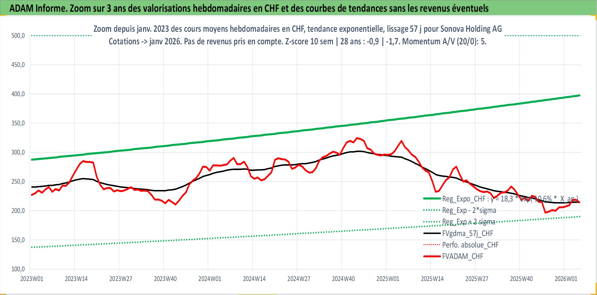 Site dédié aux investisseursPage dédiée sur site financeAnalyse des valorisations hebdomadaires de l'action Sonova Holding AG. Cet actif est cote en CHF. Les valorisations sont en contrevaleur EURO et couvrent les semaines 1997W01 a 2026W05. Les revenus de cet actif financier sont pris en compte depuis la semaine 1997W40. La note globale ESG de cet actif est estimee a 11.0 (apres rebasage entre 0 et 20).
