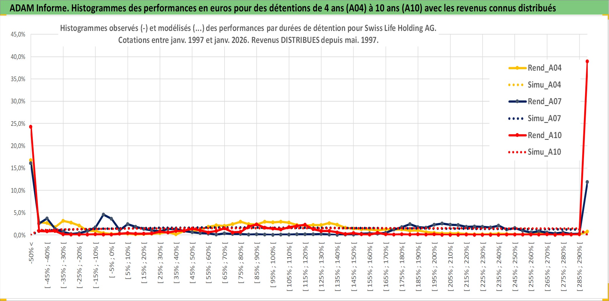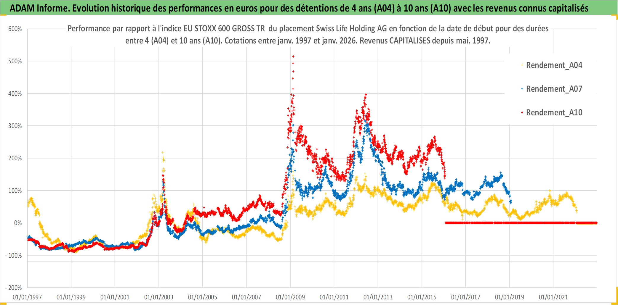 Site dédié aux investisseursPage dédiée sur site financeAnalyse des valorisations hebdomadaires de l'action Swiss Life Holding AG. Cet actif est cote en CHF. Les valorisations sont en contrevaleur EURO et couvrent les semaines 1997W01 a 2026W05. Les revenus de cet actif financier sont pris en compte depuis la semaine 1997W22. La note globale ESG de cet actif est estimee a 13.0 (apres rebasage entre 0 et 20).