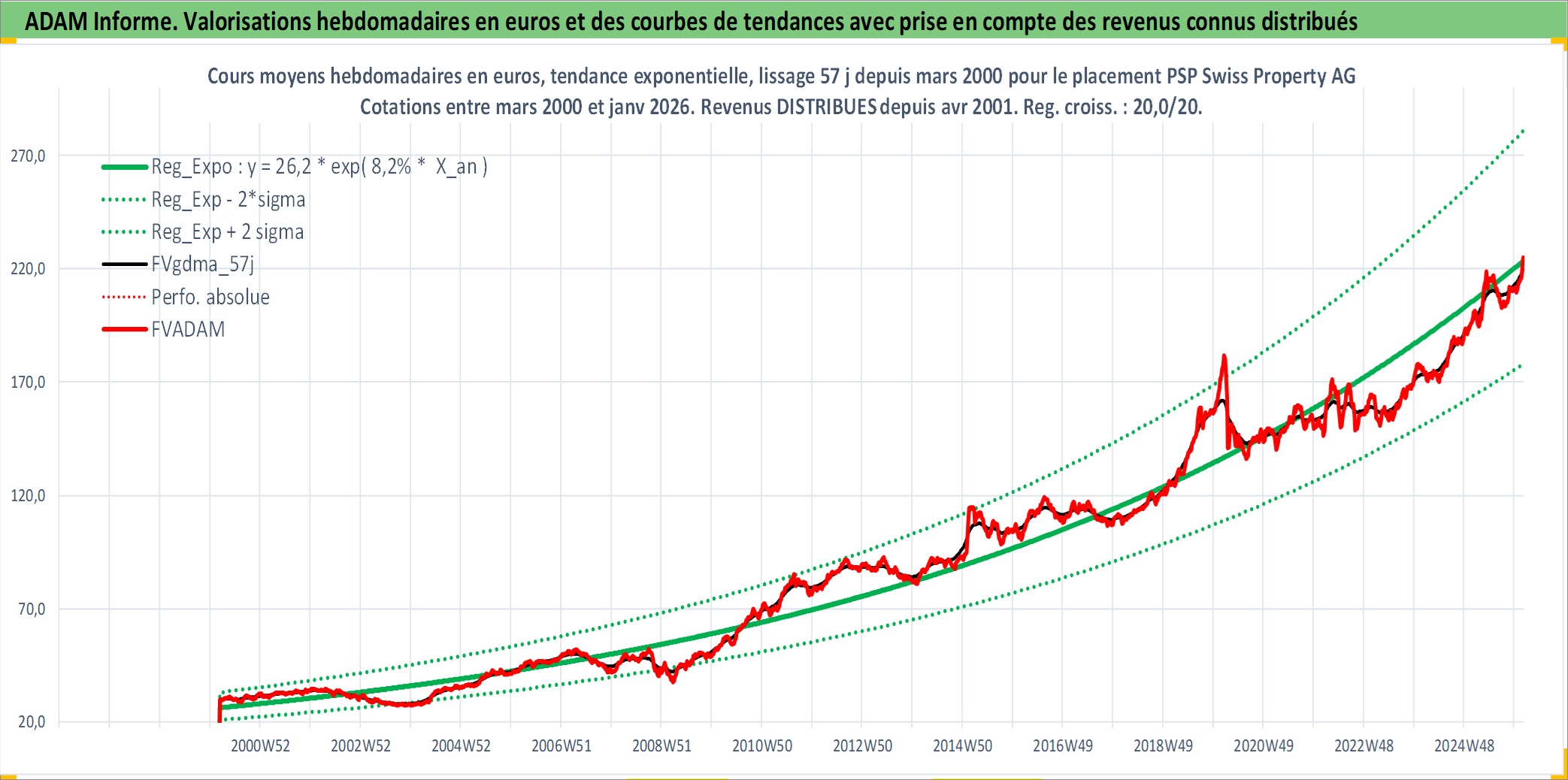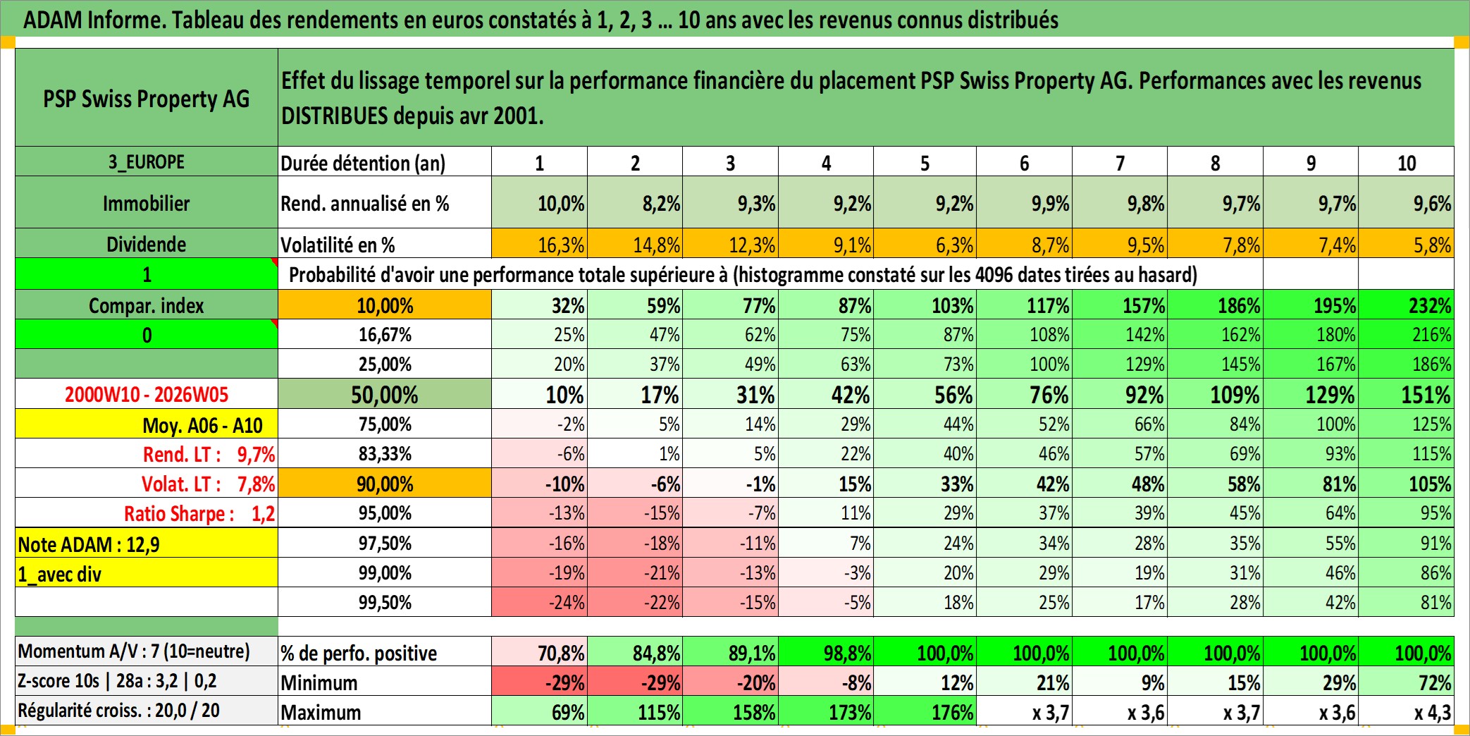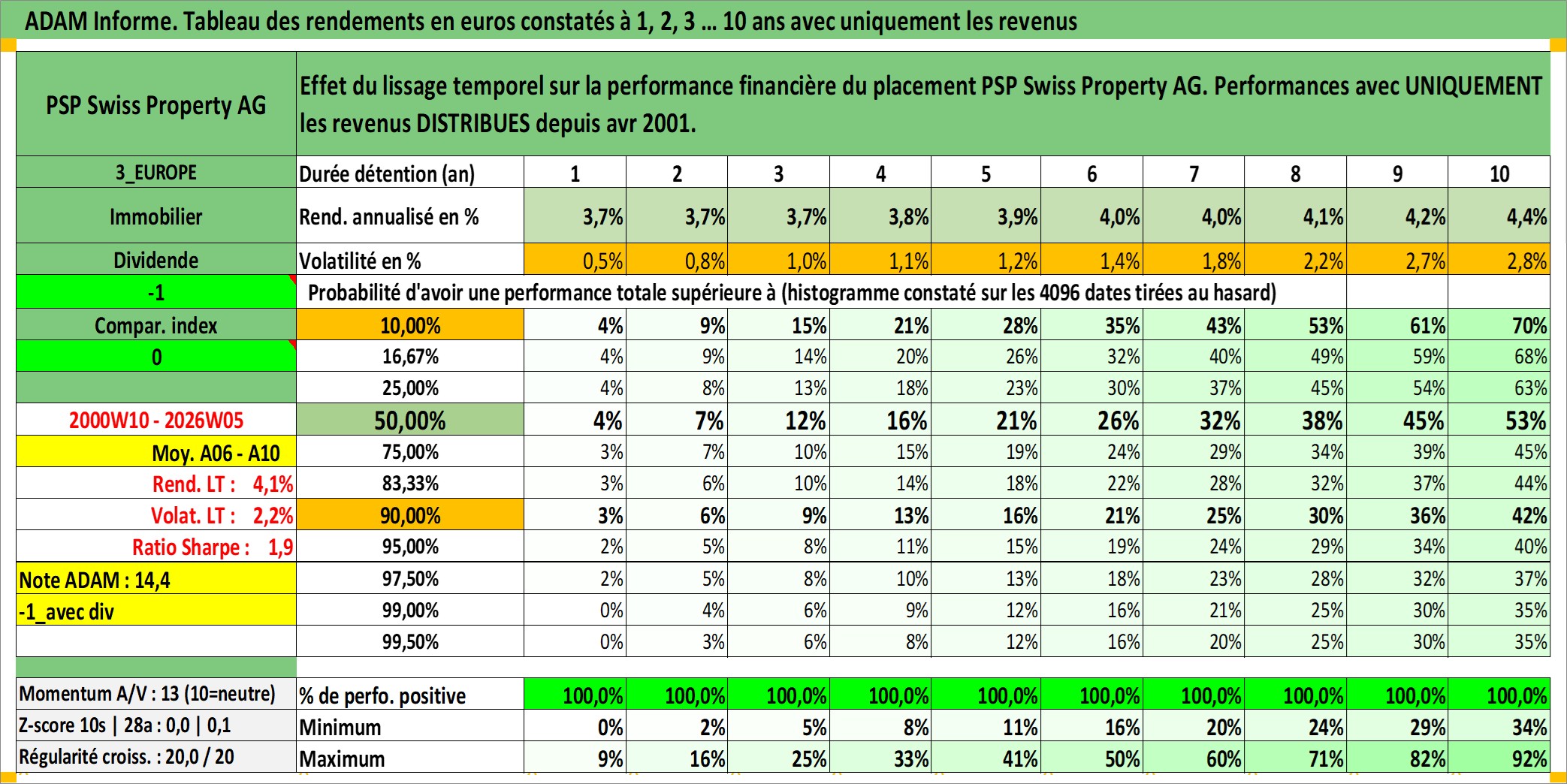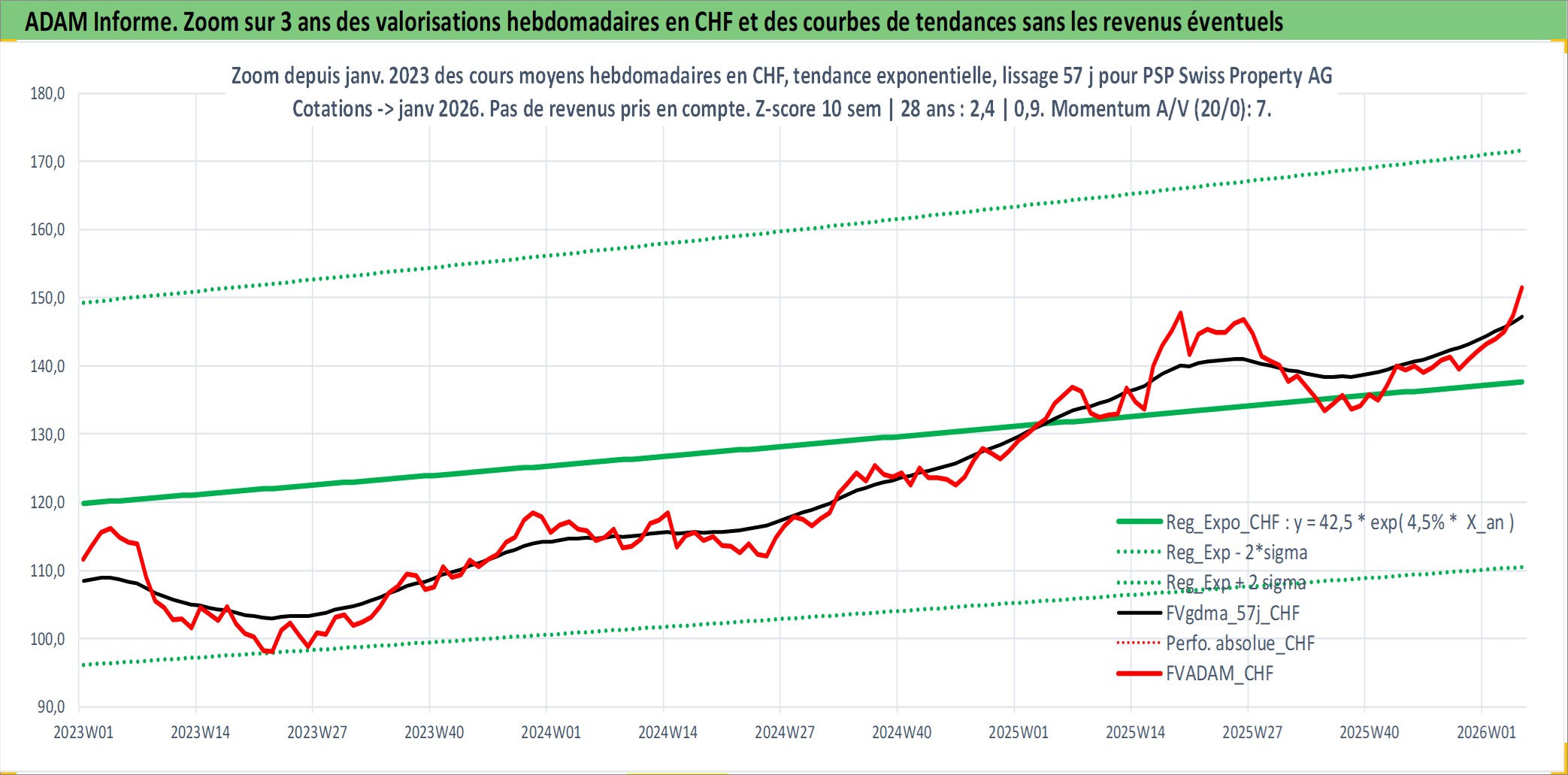 Site dédié aux investisseursPage dédiée sur site financeAnalyse des valorisations hebdomadaires de l'action PSP Swiss Property AG. Cet actif est cote en CHF. Les valorisations sont en contrevaleur EURO et couvrent les semaines 2000W10 a 2026W05. Les revenus de cet actif financier sont pris en compte depuis la semaine 2001W16. La note ESG de cet actif n'est pas connue.
