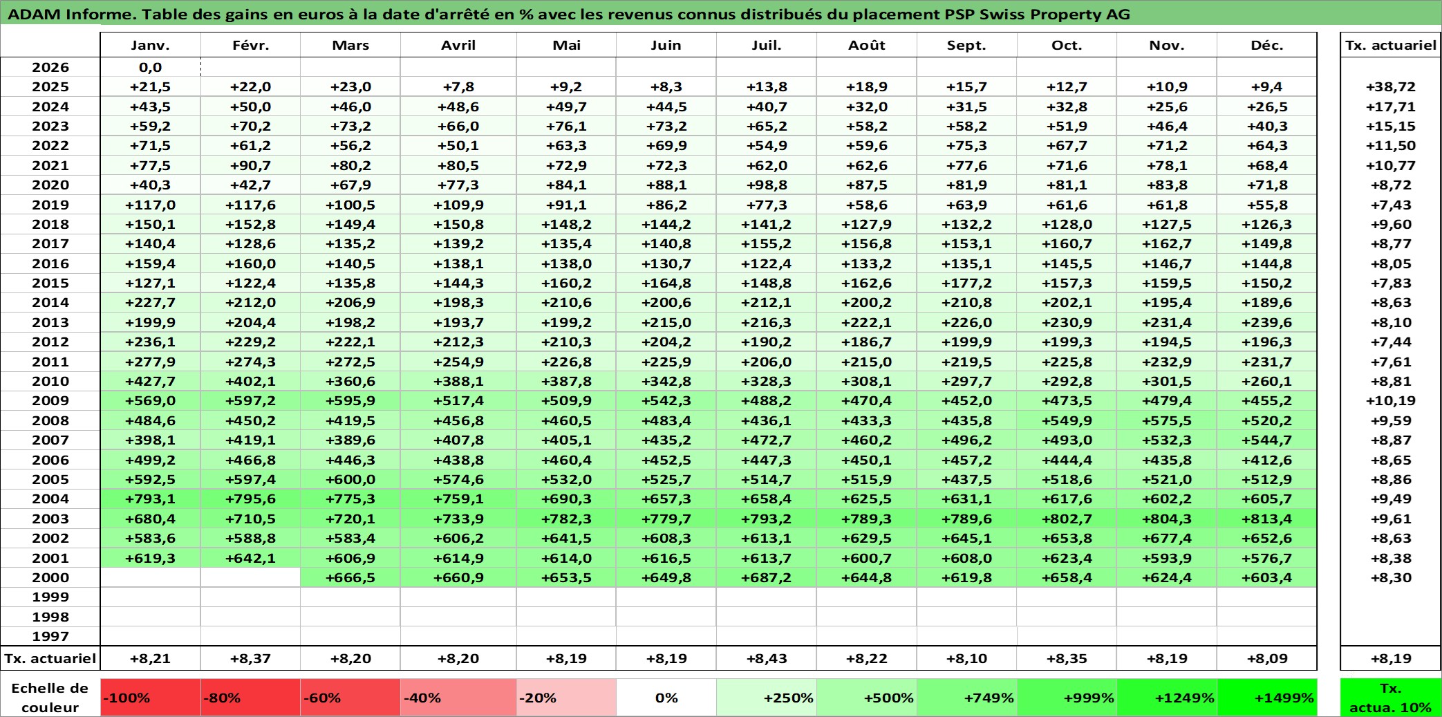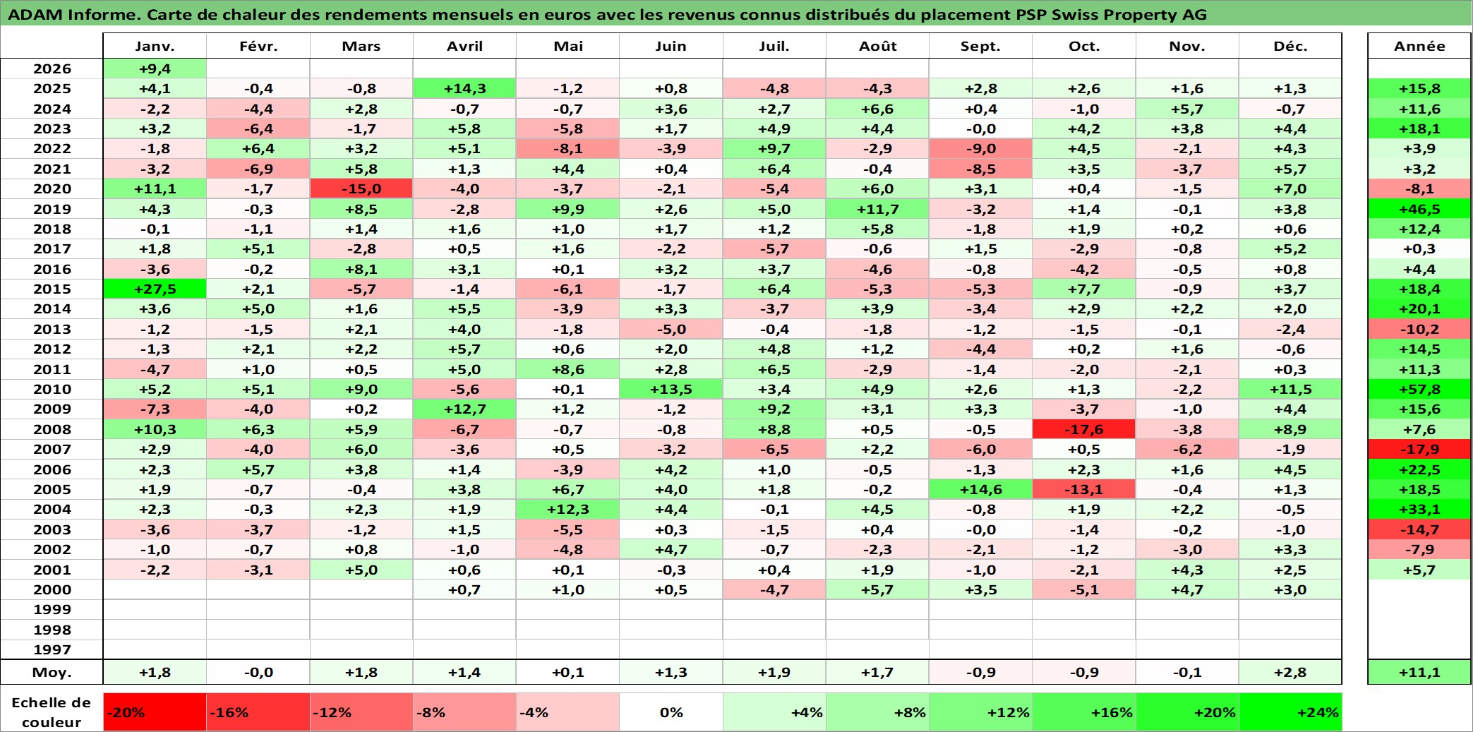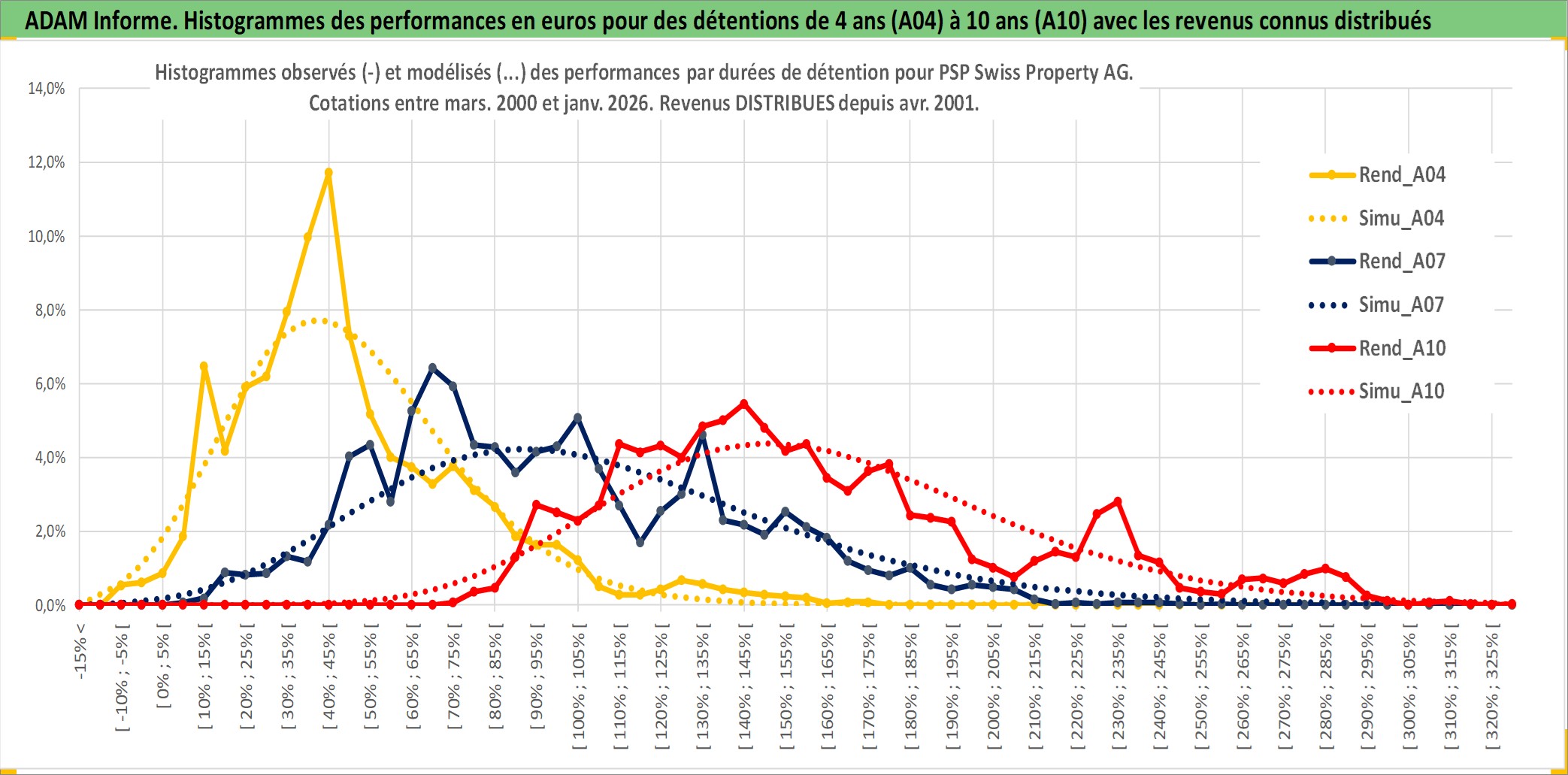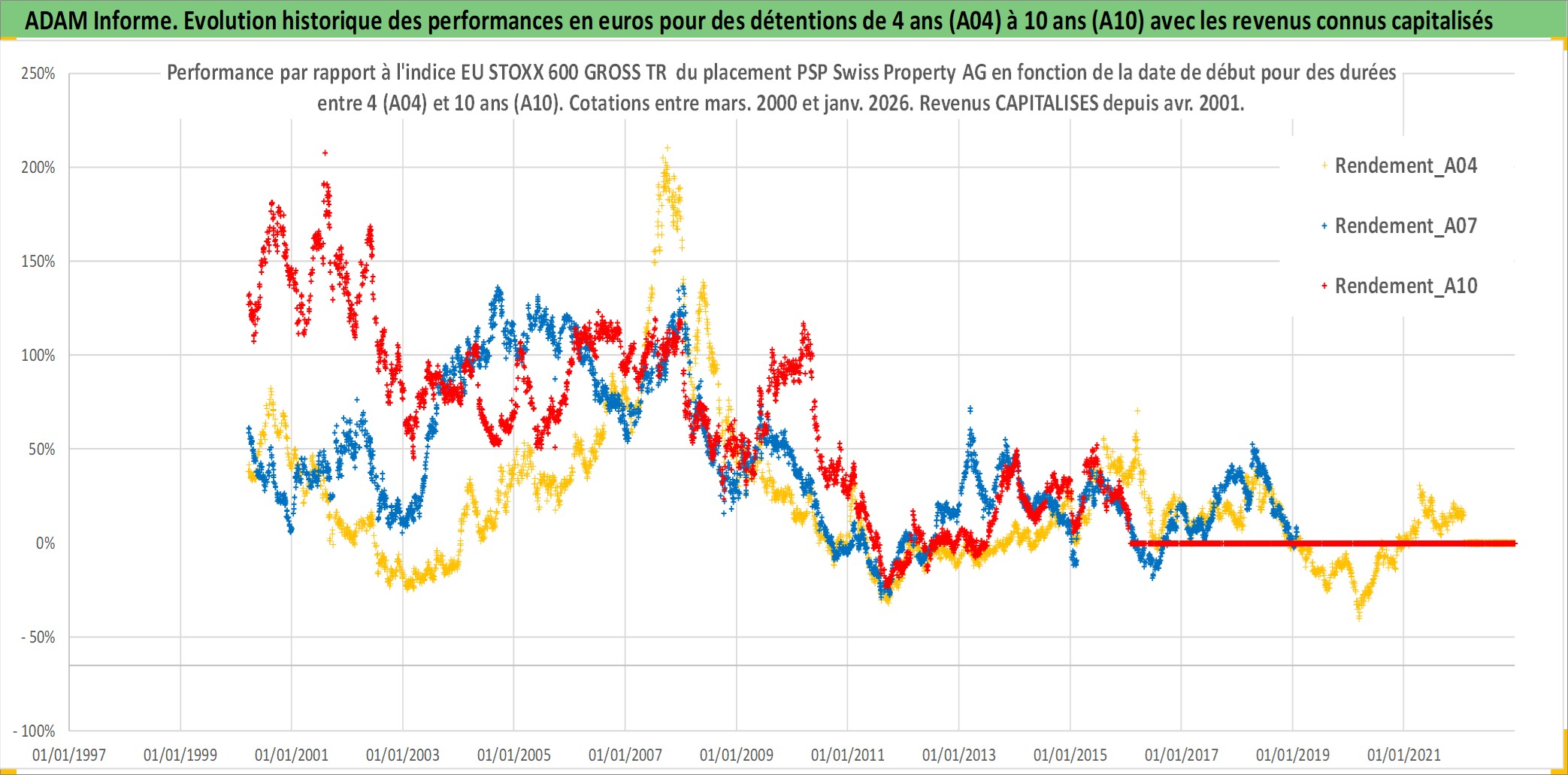 Site dédié aux investisseursPage dédiée sur site financeAnalyse des valorisations hebdomadaires de l'action PSP Swiss Property AG. Cet actif est cote en CHF. Les valorisations sont en contrevaleur EURO et couvrent les semaines 2000W10 a 2026W05. Les revenus de cet actif financier sont pris en compte depuis la semaine 2001W16. La note ESG de cet actif n'est pas connue.