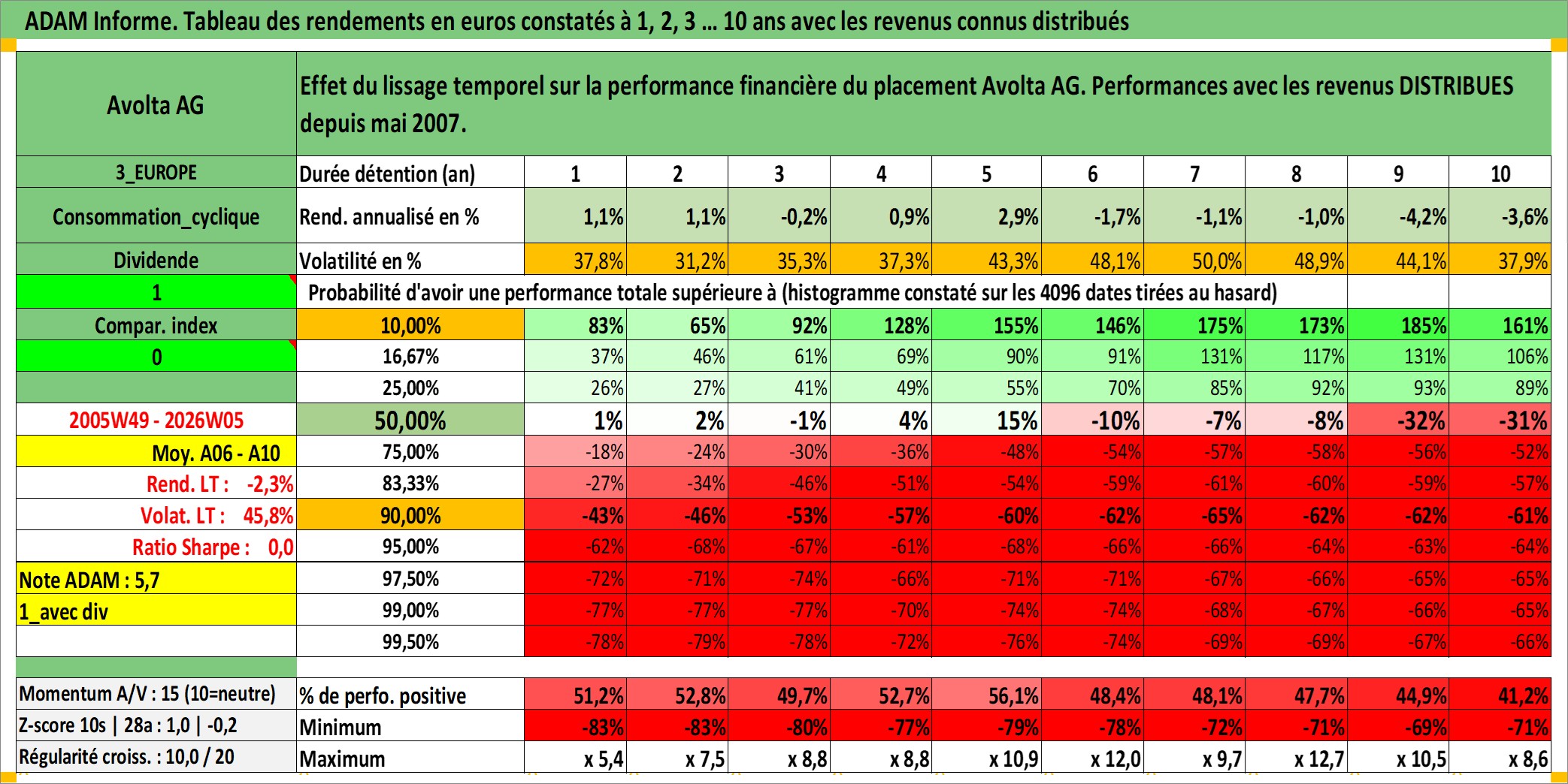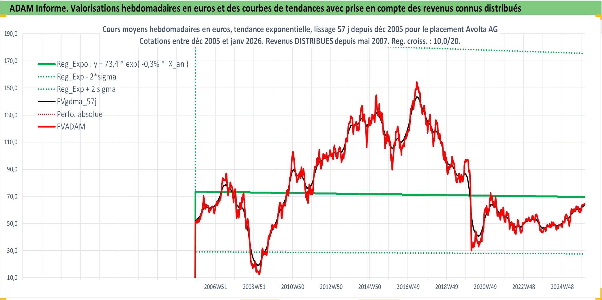 Site dédié aux investisseursPage dédiée sur site financeAnalyse des valorisations hebdomadaires de l'action Avolta AG. Cet actif est cote en CHF. Les valorisations sont en contrevaleur EURO et couvrent les semaines 2005W49 a 2026W05. Les revenus de cet actif financier sont pris en compte depuis la semaine 2007W21. La note globale ESG de cet actif est estimee a 15.0 (apres rebasage entre 0 et 20).
