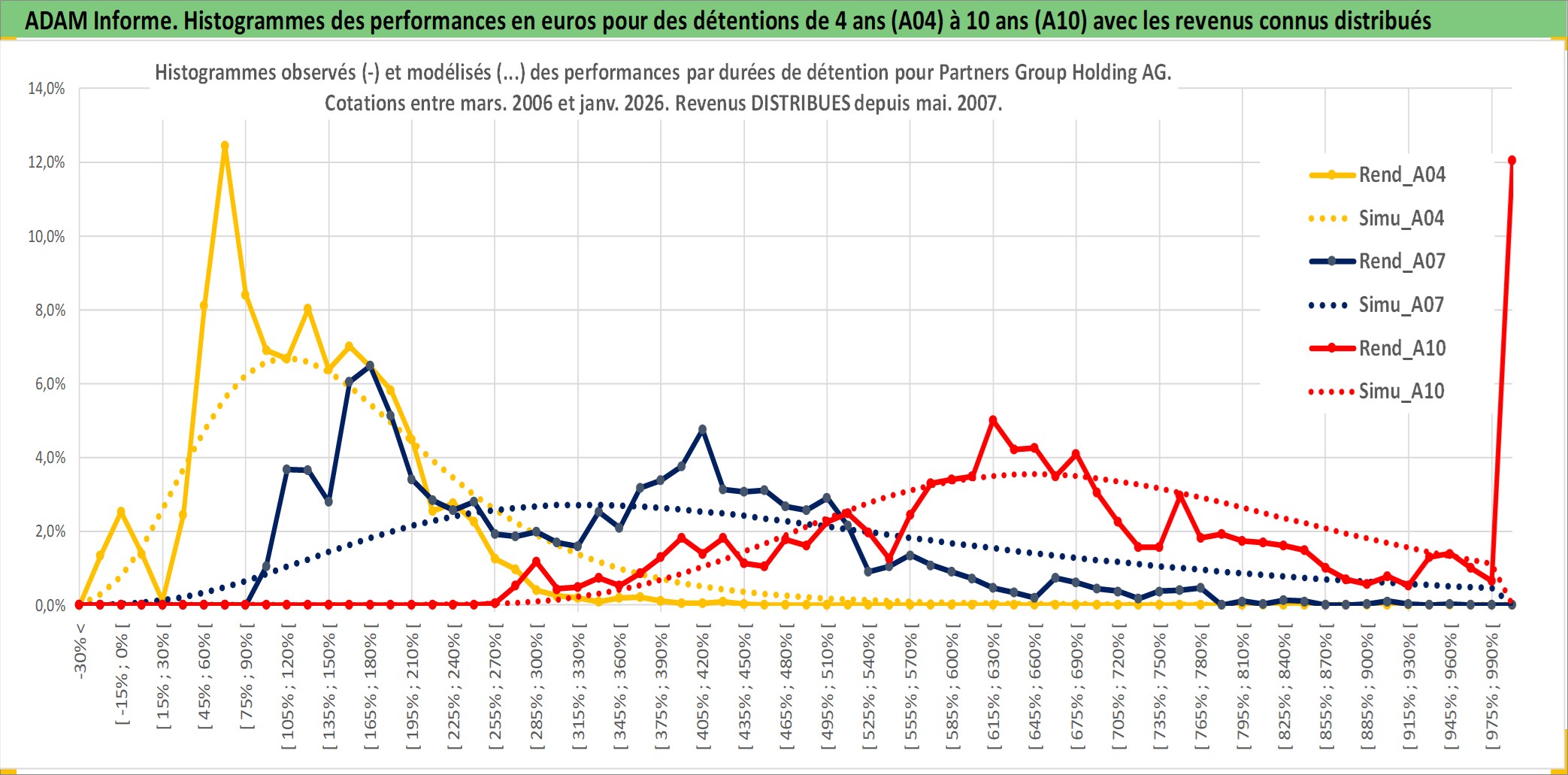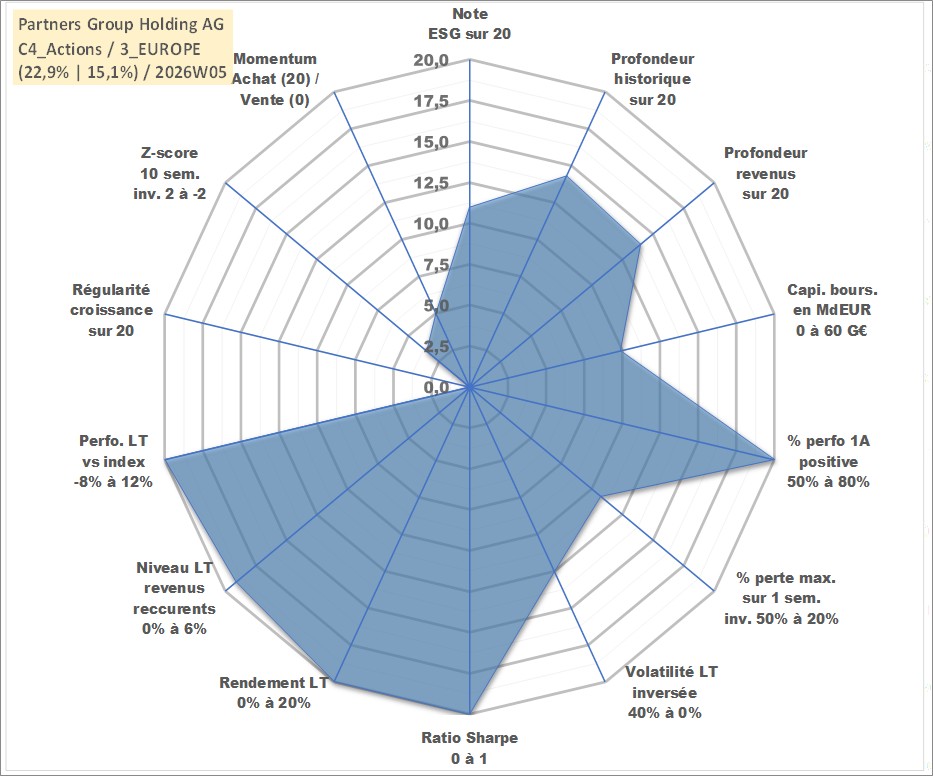Site dédié aux investisseursPage dédiée sur site financeAnalyse des valorisations hebdomadaires de l'action Partners Group Holding AG. Cet actif est cote en CHF. Les valorisations sont en contrevaleur EURO et couvrent les semaines 2006W12 a 2026W05. Les revenus de cet actif financier sont pris en compte depuis la semaine 2007W18. La note globale ESG de cet actif est estimee a 11.0 (apres rebasage entre 0 et 20).