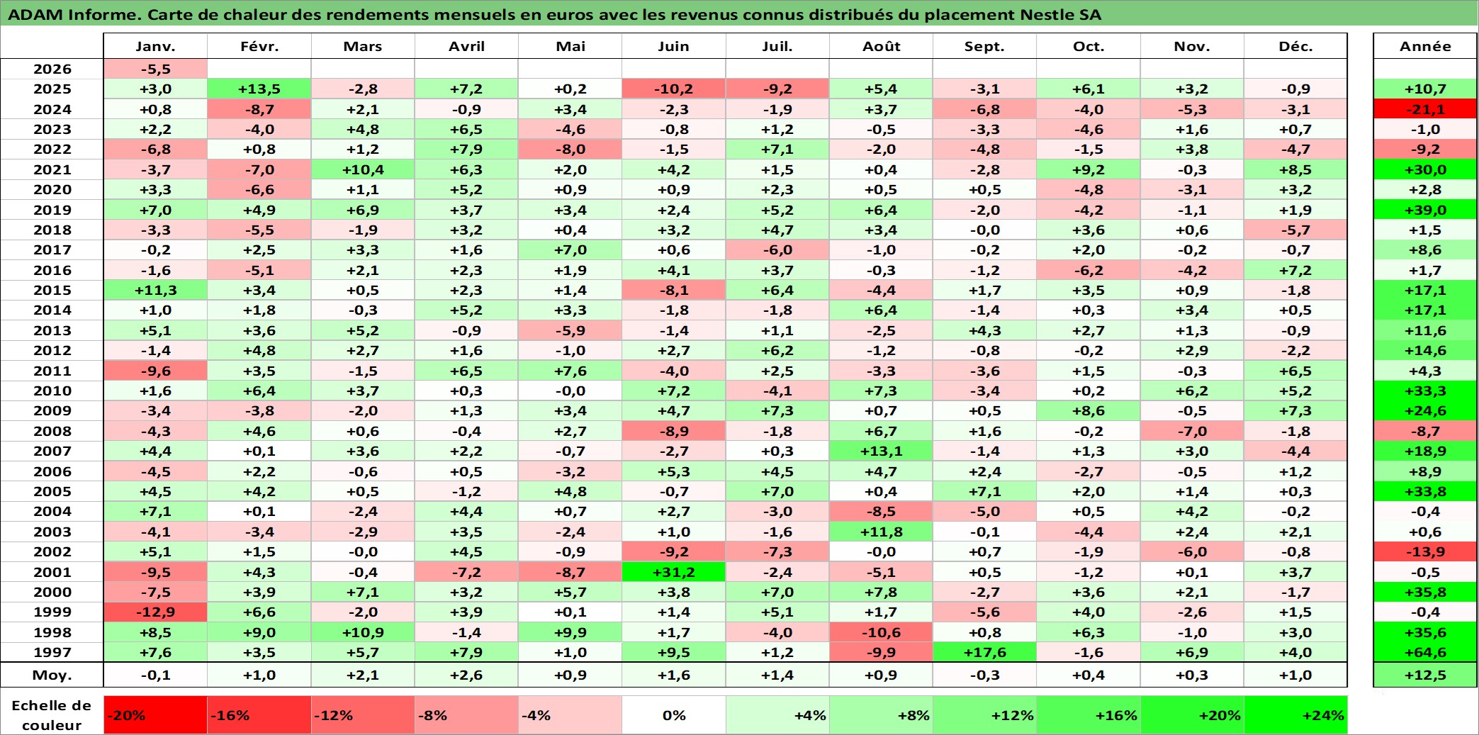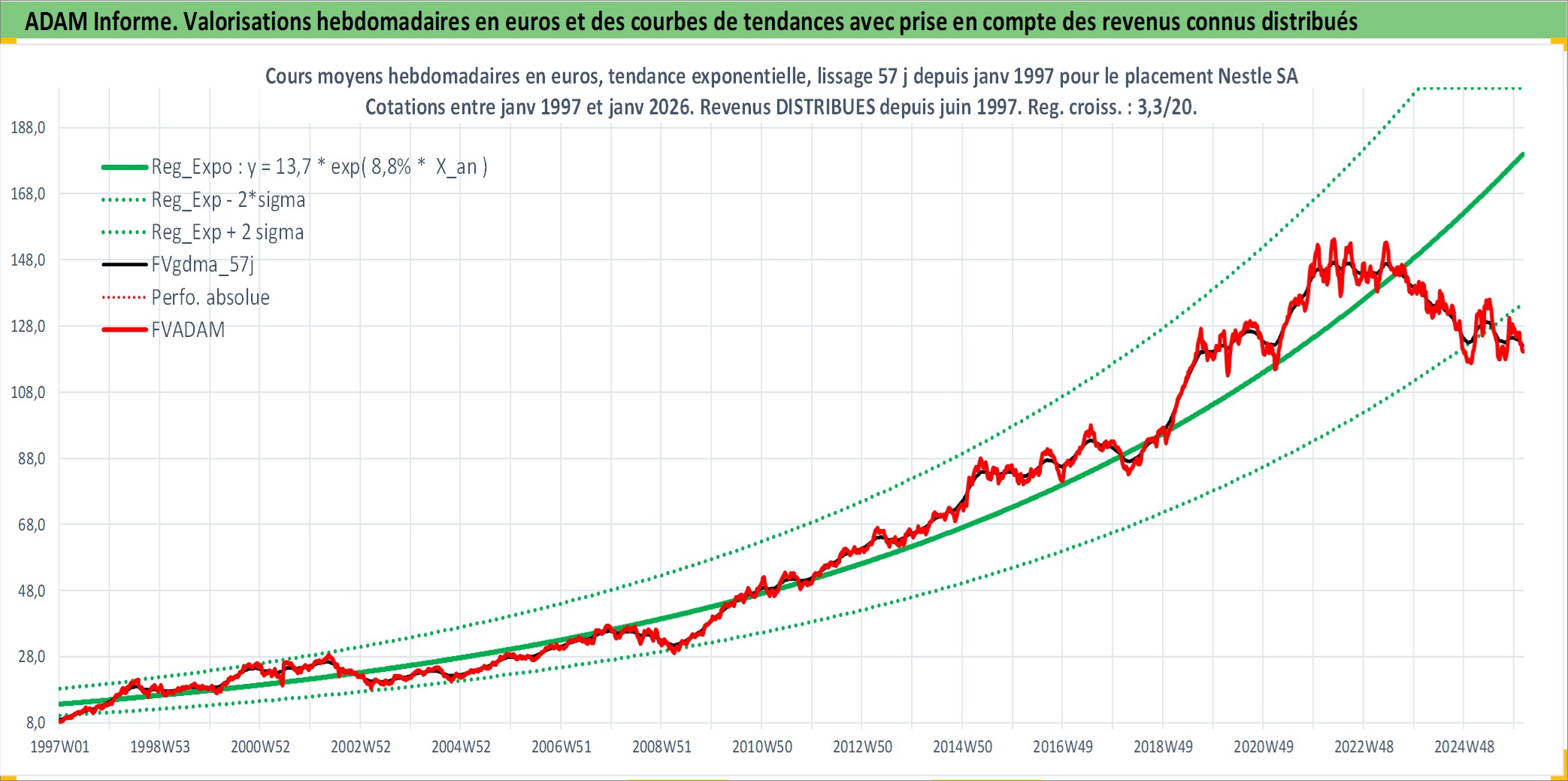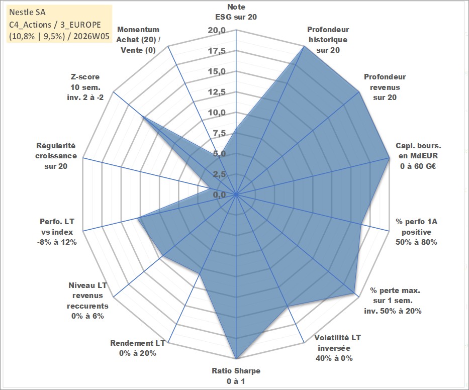 Site dédié aux investisseursPage dédiée sur site financeAnalyse des valorisations hebdomadaires de l'action Nestle SA. Cet actif est cote en CHF. Les valorisations sont en contrevaleur EURO et couvrent les semaines 1997W01 a 2026W05. Les revenus de cet actif financier sont pris en compte depuis la semaine 1997W24. La note globale ESG de cet actif est estimee a 8.0 (apres rebasage entre 0 et 20).