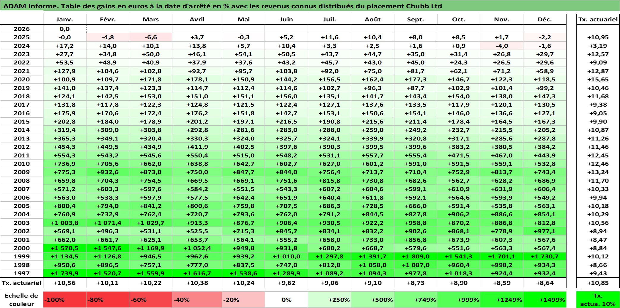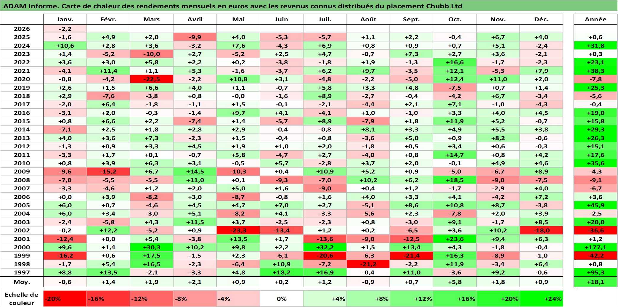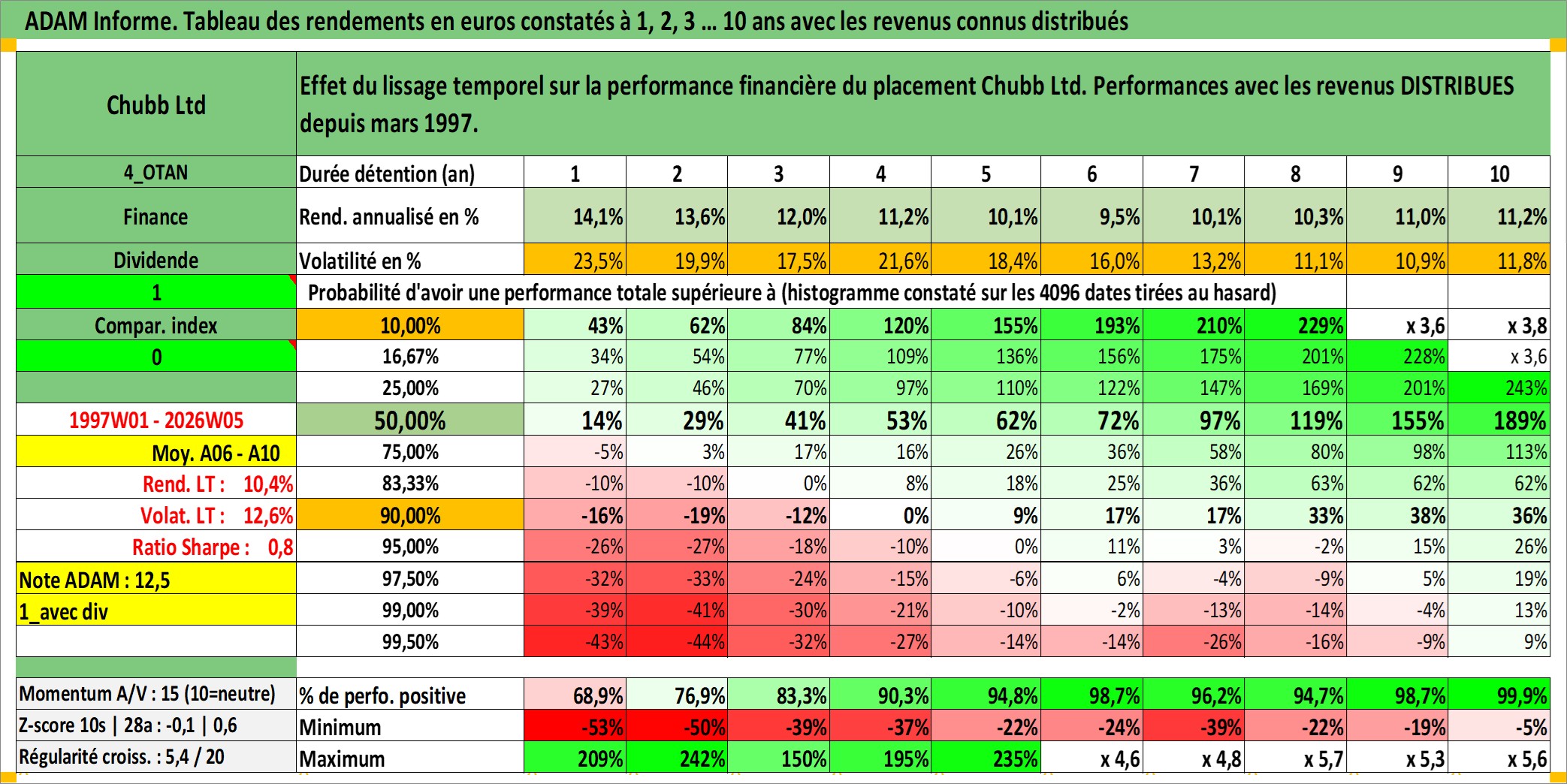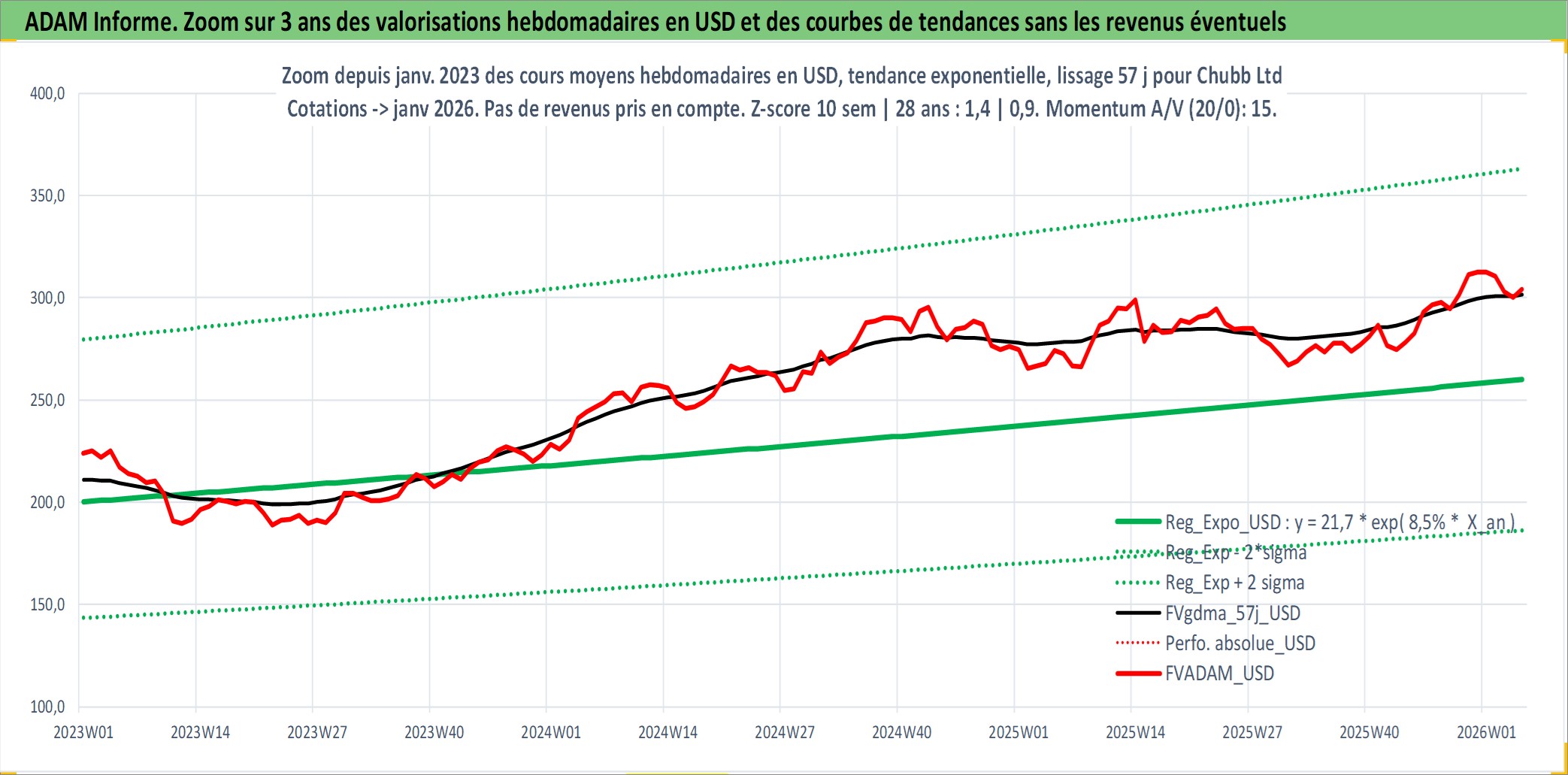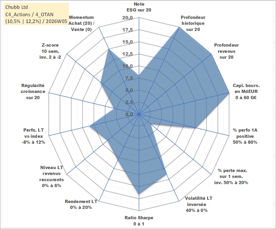 Site dédié aux investisseursPage dédiée sur site financeAnalyse des valorisations hebdomadaires de l'action Chubb Ltd. Cet actif est cote en USD. Les valorisations sont en contrevaleur EURO et couvrent les semaines 1997W01 a 2026W05. Les revenus de cet actif financier sont pris en compte depuis la semaine 1997W13. La note globale ESG de cet actif est estimee a 8.0 (apres rebasage entre 0 et 20).