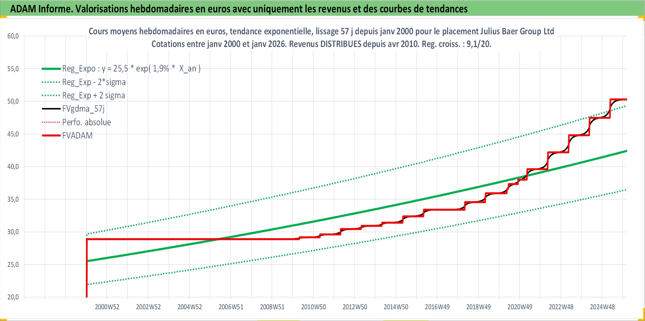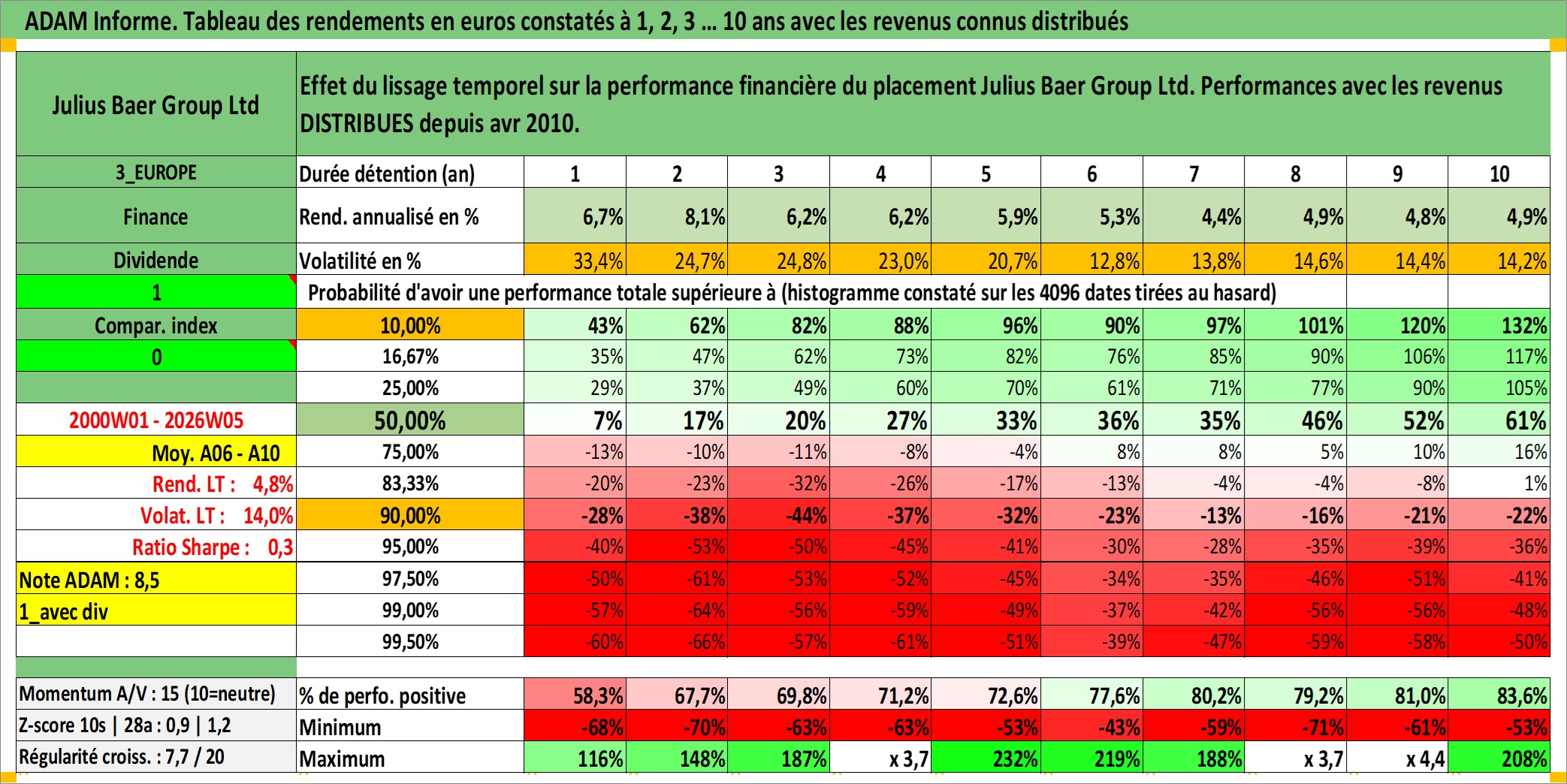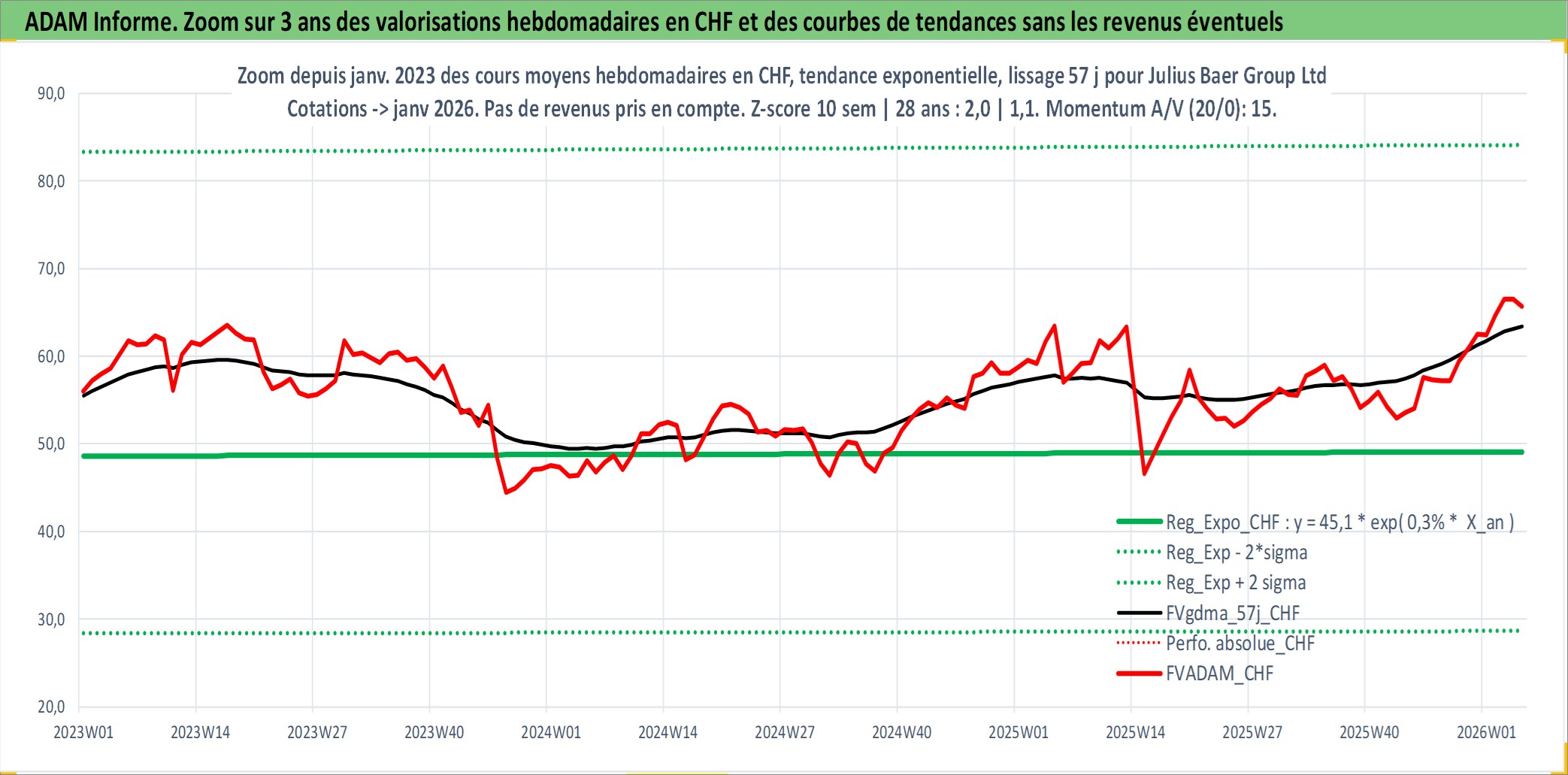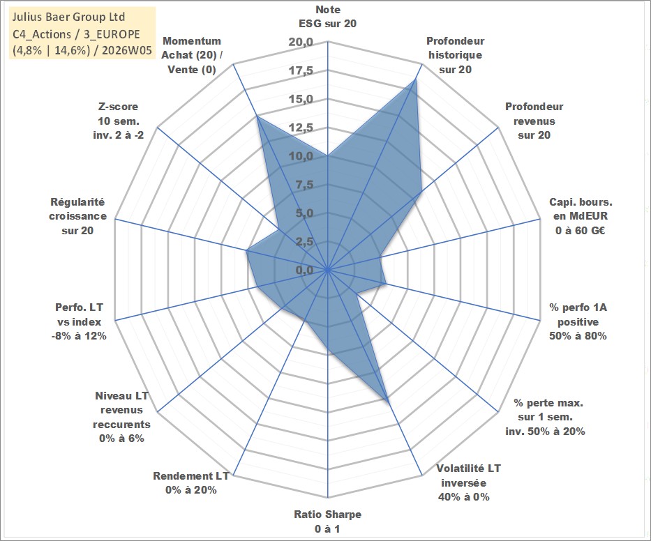 Site dédié aux investisseursPage dédiée sur site financeAnalyse des valorisations hebdomadaires de l'action Julius Baer Group Ltd. Cet actif est cote en CHF. Les valorisations sont en contrevaleur EURO et couvrent les semaines 2000W01 a 2026W05. Les revenus de cet actif financier sont pris en compte depuis la semaine 2010W15. La note globale ESG de cet actif est estimee a 10.0 (apres rebasage entre 0 et 20).