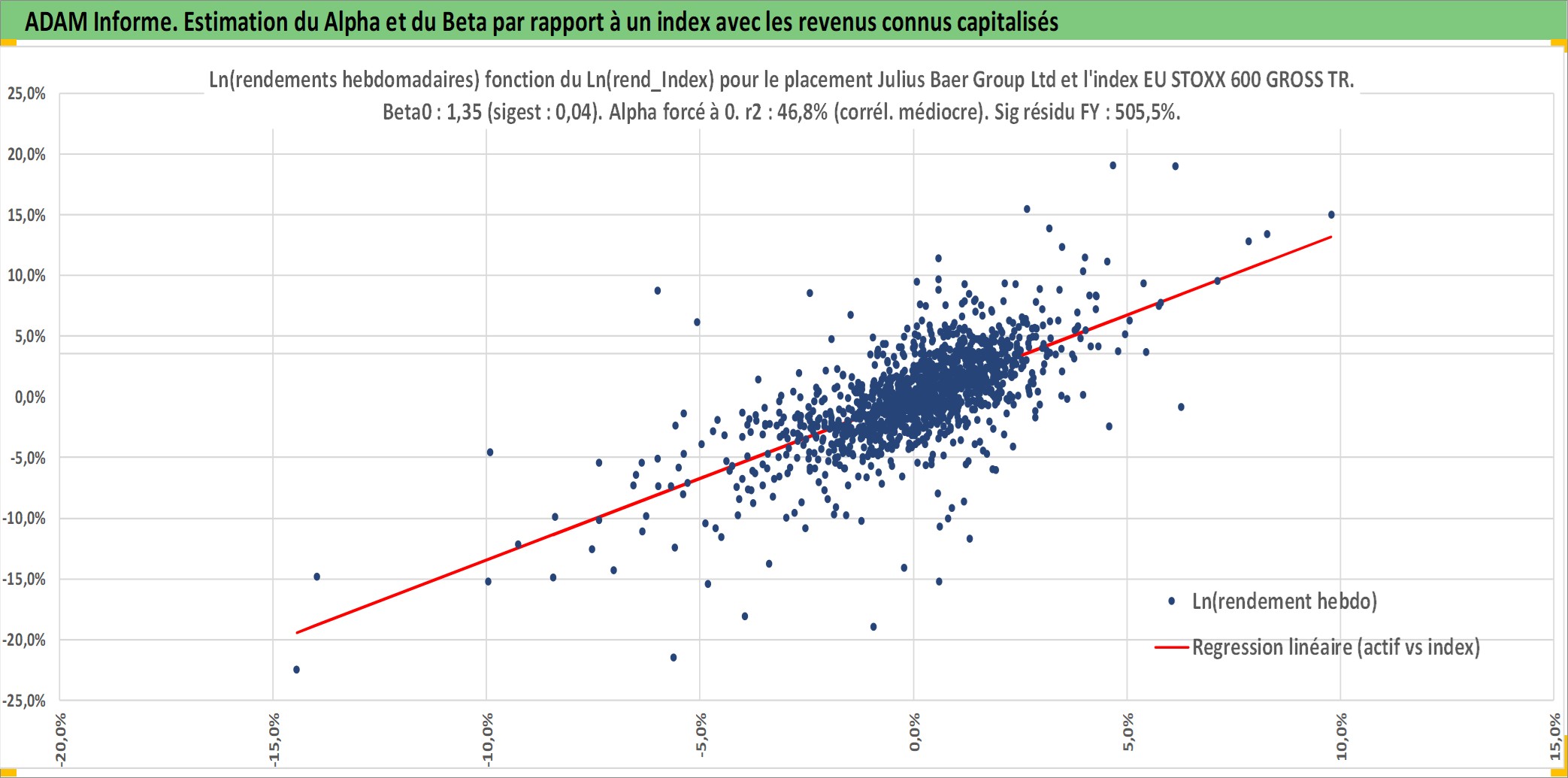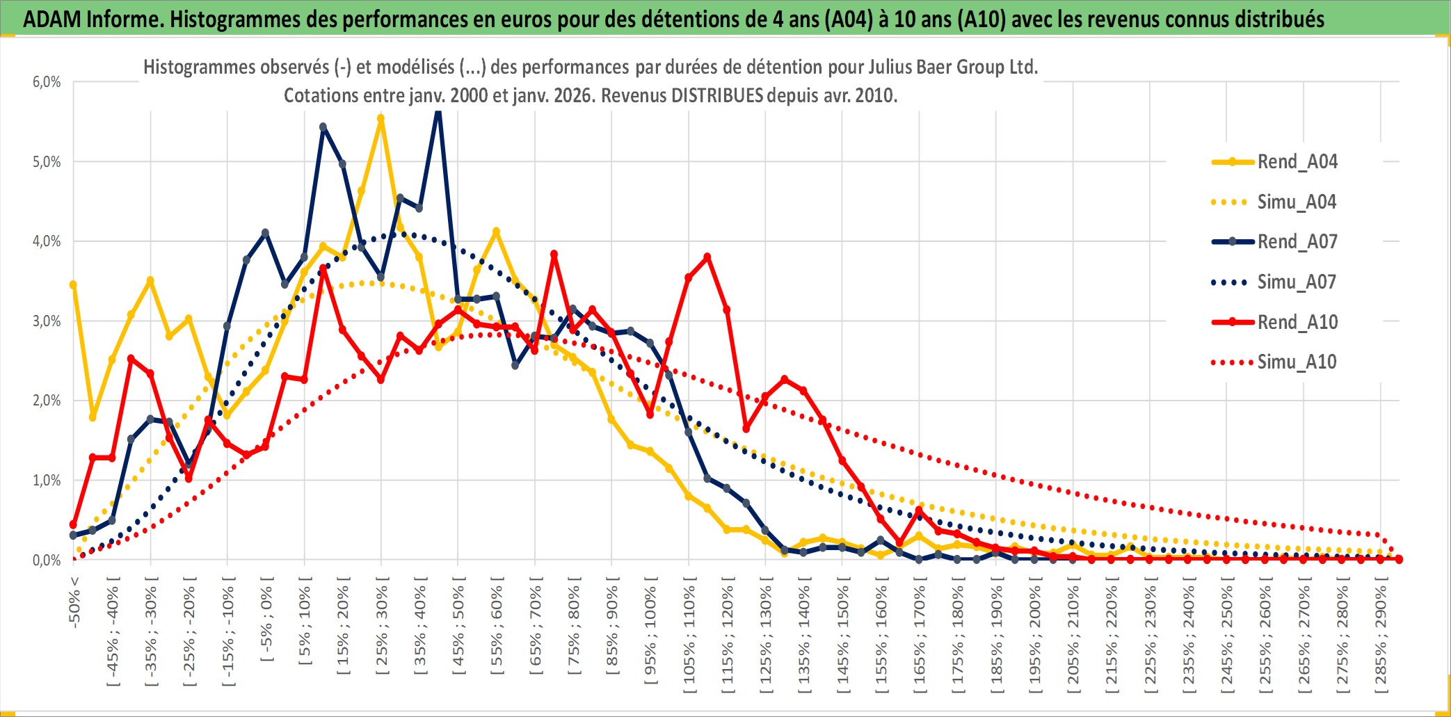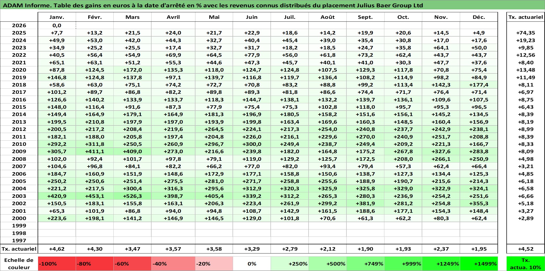 Site dédié aux investisseursPage dédiée sur site financeAnalyse des valorisations hebdomadaires de l'action Julius Baer Group Ltd. Cet actif est cote en CHF. Les valorisations sont en contrevaleur EURO et couvrent les semaines 2000W01 a 2026W05. Les revenus de cet actif financier sont pris en compte depuis la semaine 2010W15. La note globale ESG de cet actif est estimee a 10.0 (apres rebasage entre 0 et 20).