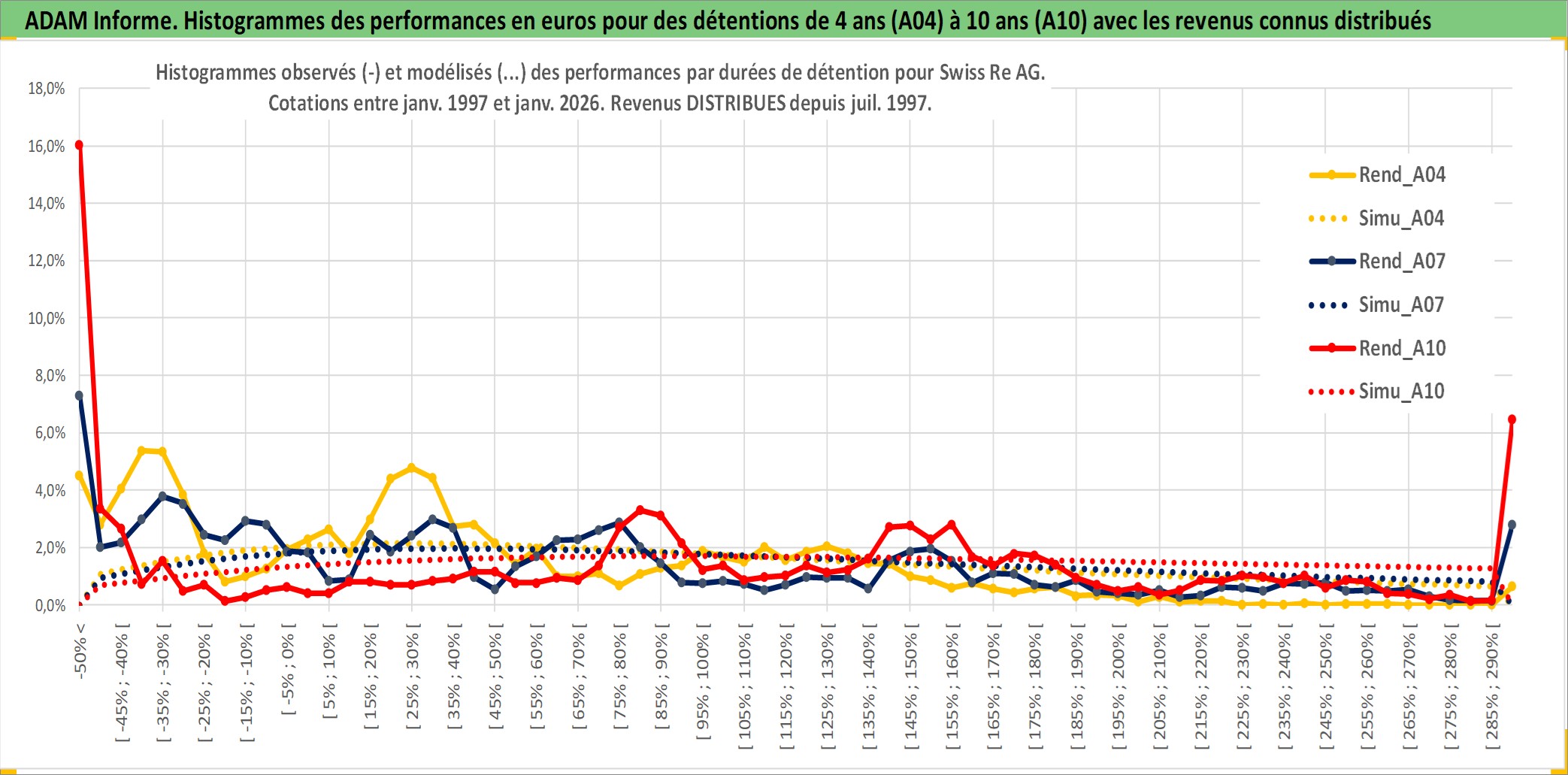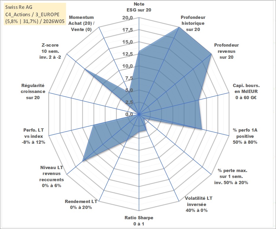 Site dédié aux investisseursPage dédiée sur site financeAnalyse des valorisations hebdomadaires de l'action Swiss Re AG. Cet actif est cote en CHF. Les valorisations sont en contrevaleur EURO et couvrent les semaines 1997W01 a 2026W05. Les revenus de cet actif financier sont pris en compte depuis la semaine 1997W27. La note globale ESG de cet actif est estimee a 13.0 (apres rebasage entre 0 et 20).