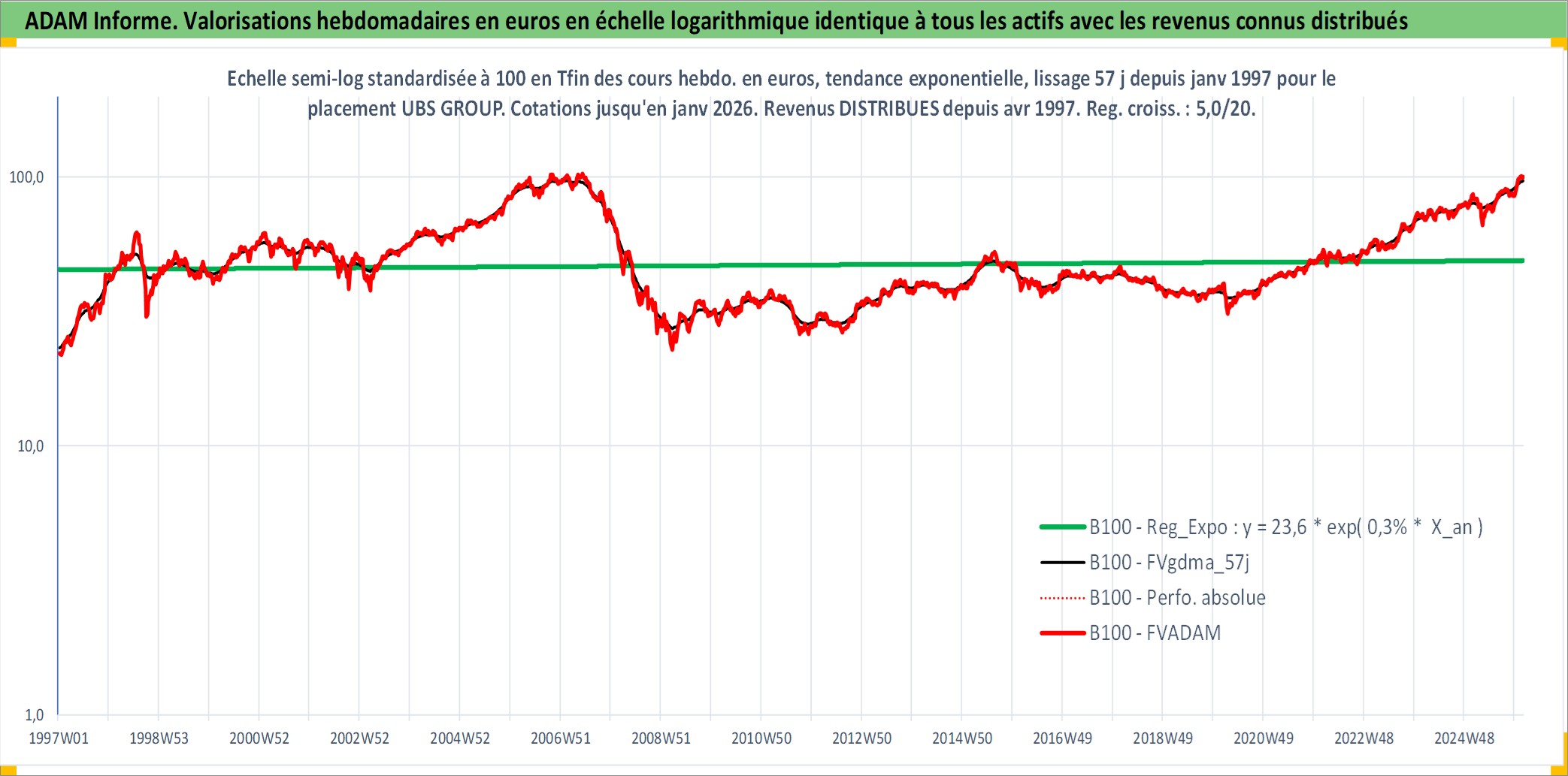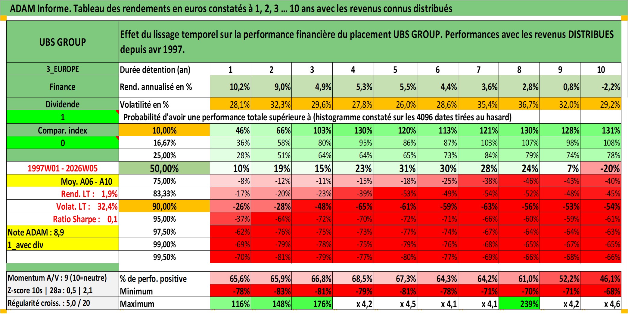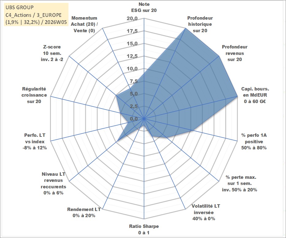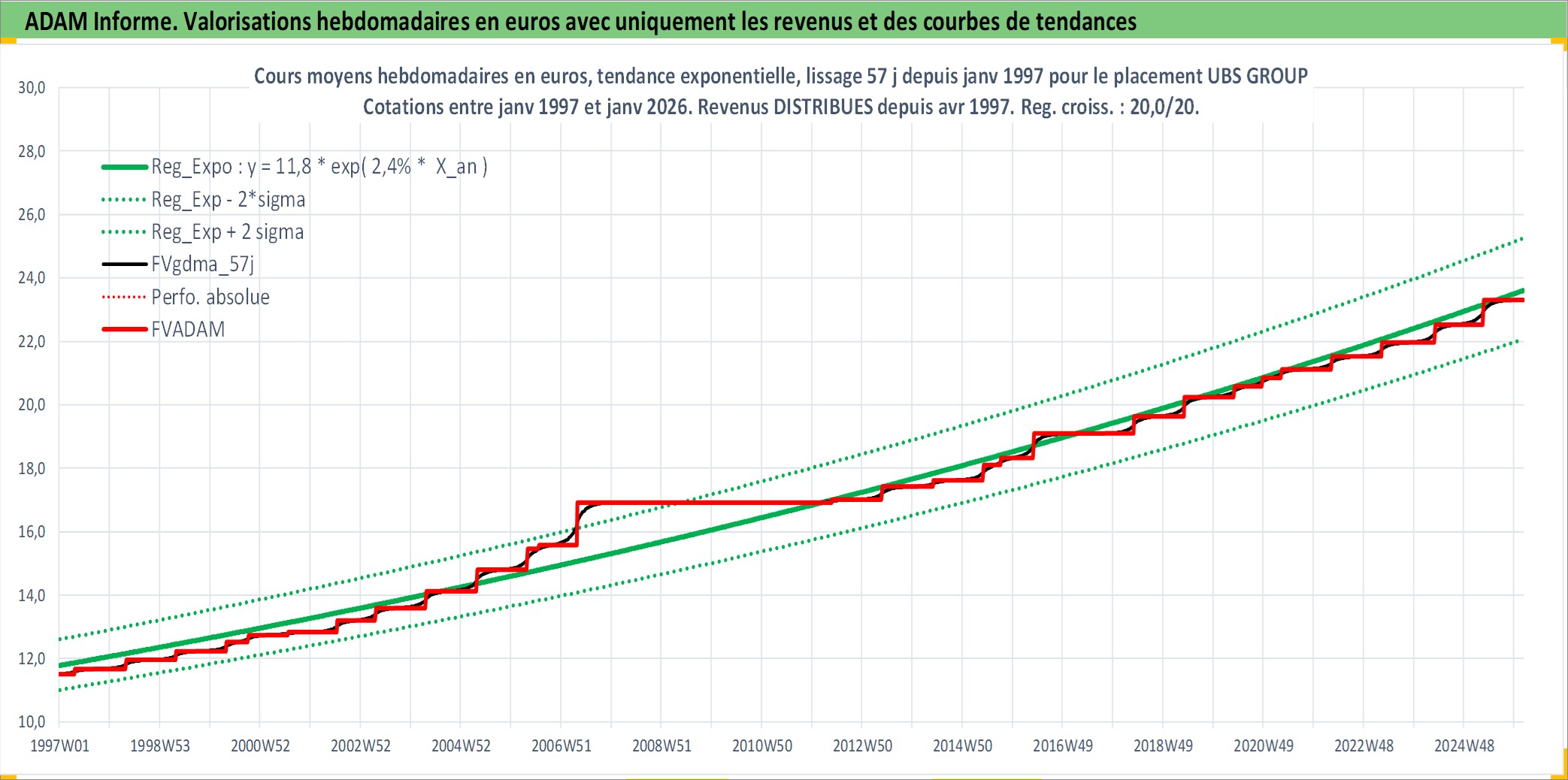 Site dédié aux investisseursPage dédiée sur site financeAnalyse des valorisations hebdomadaires de l'action UBS GROUP. Cet actif est cote en CHF. Les valorisations sont en contrevaleur EURO et couvrent les semaines 1997W01 a 2026W05. Les revenus de cet actif financier sont pris en compte depuis la semaine 1997W17. La note globale ESG de cet actif est estimee a 9.0 (apres rebasage entre 0 et 20).