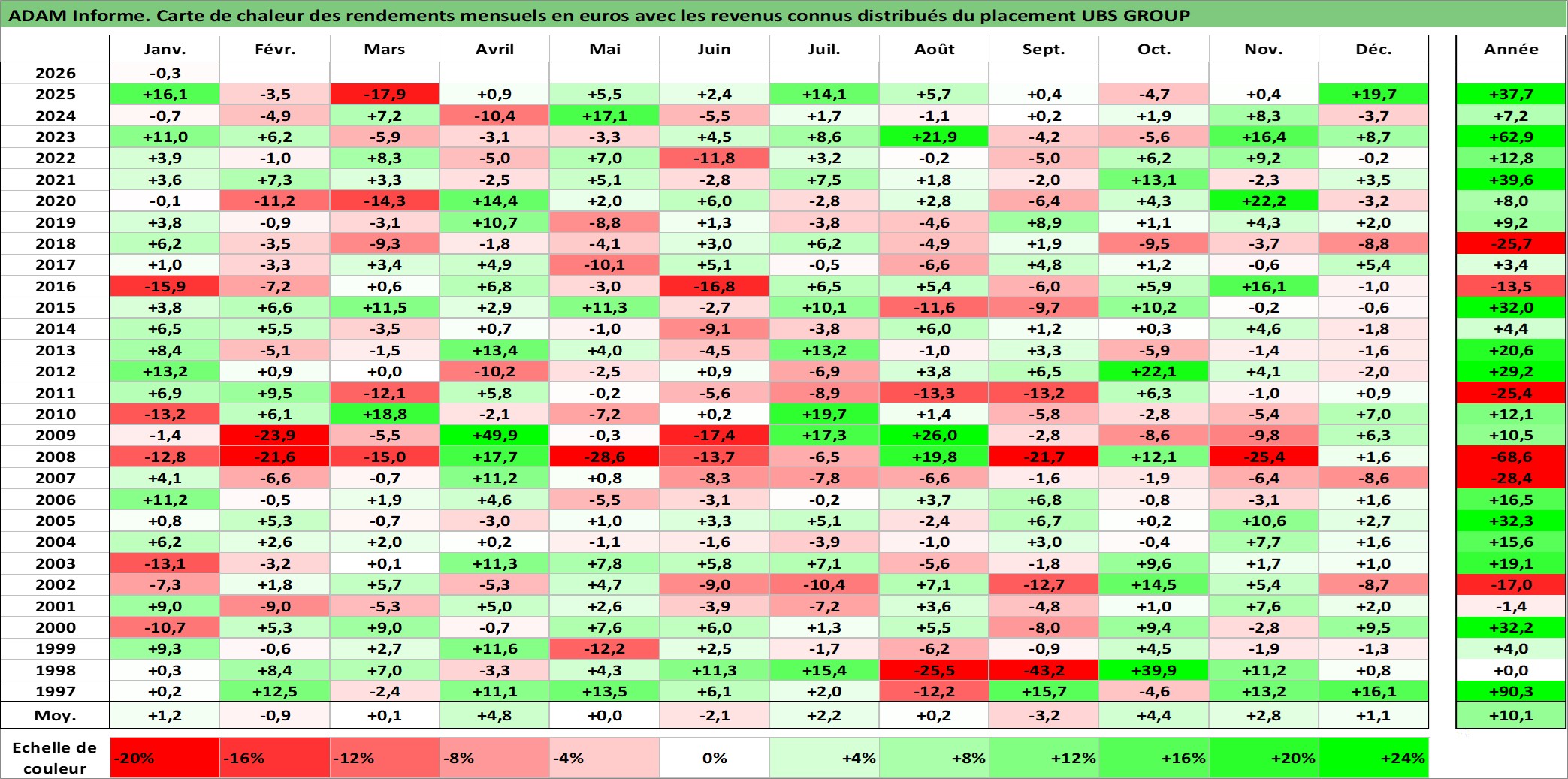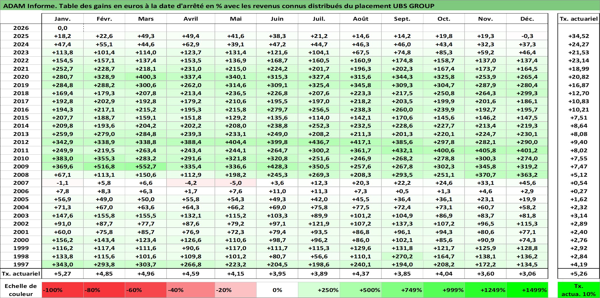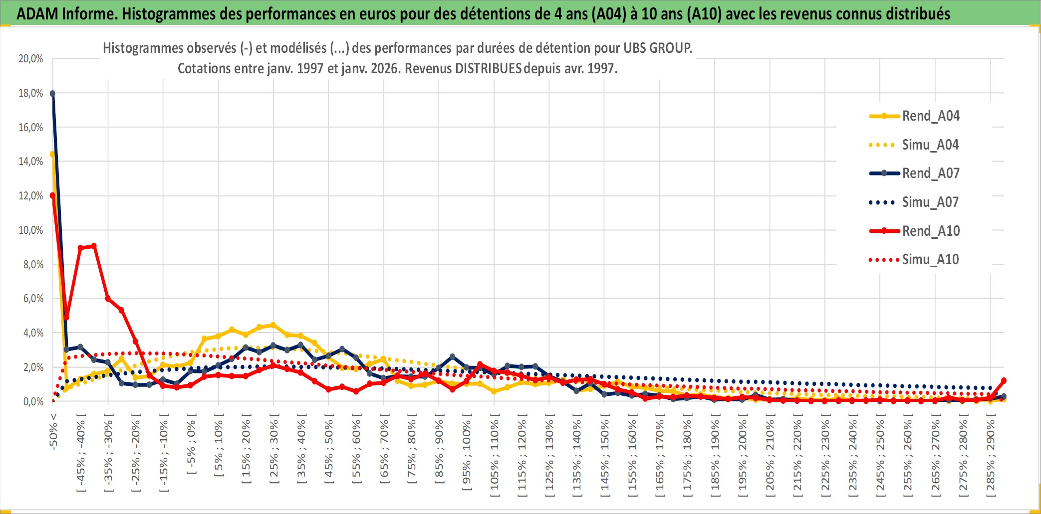 Site dédié aux investisseursPage dédiée sur site financeAnalyse des valorisations hebdomadaires de l'action UBS GROUP. Cet actif est cote en CHF. Les valorisations sont en contrevaleur EURO et couvrent les semaines 1997W01 a 2026W05. Les revenus de cet actif financier sont pris en compte depuis la semaine 1997W17. La note globale ESG de cet actif est estimee a 9.0 (apres rebasage entre 0 et 20).