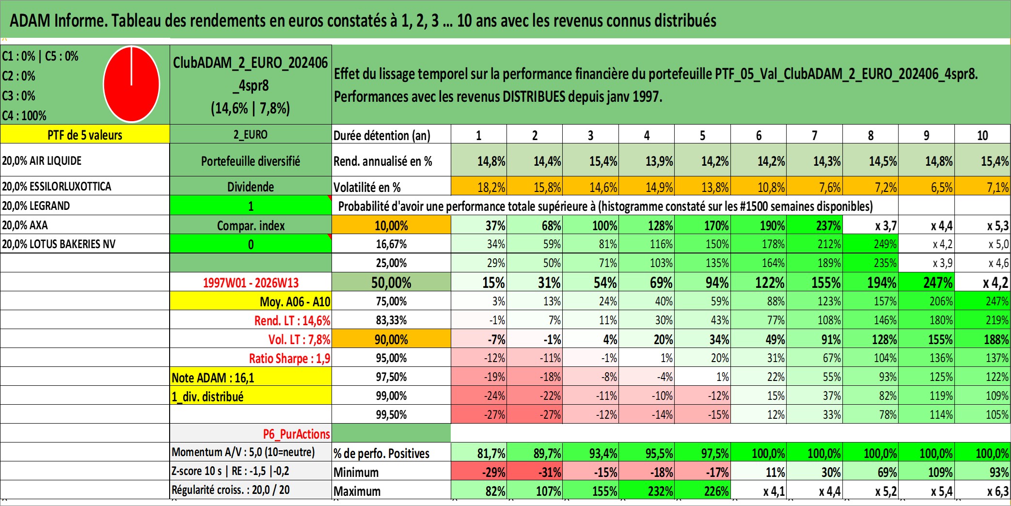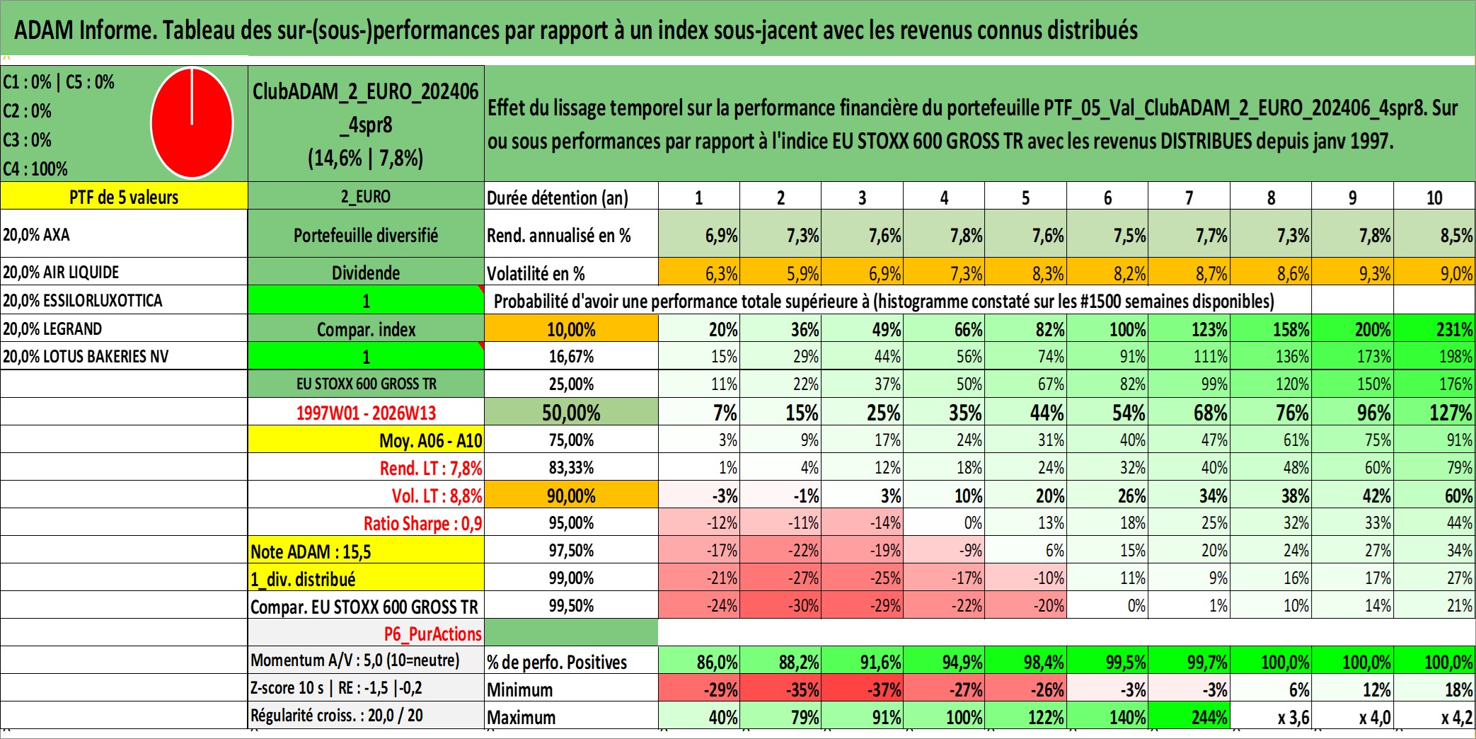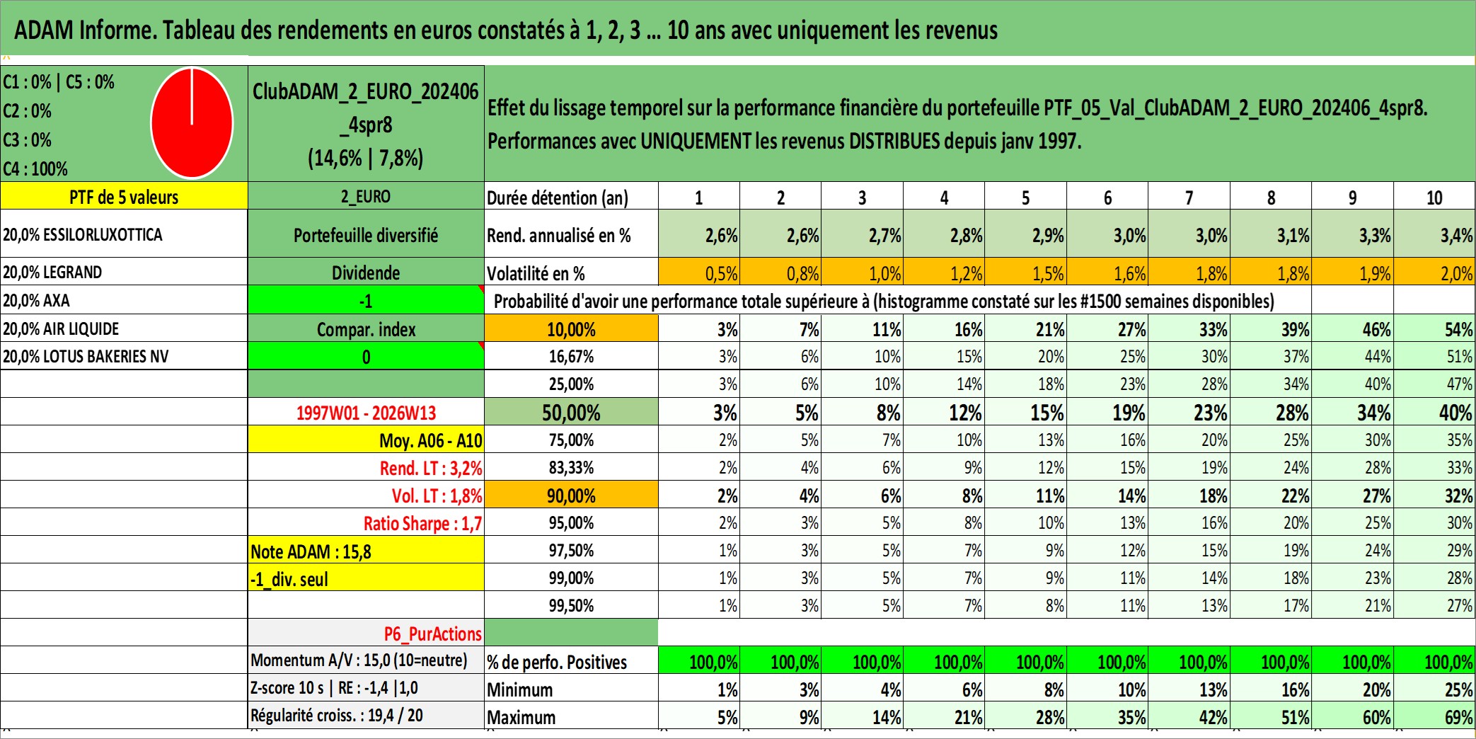 Site dédié aux investisseursPage dédiée sur site financeAnalyse des valorisations hebdomadaires du portefeuille ClubADAM_2_EURO_202406_4spr8_5actifs avec un profil P6_PurActions. Ce portefeuille est cote en EUR. Les valorisations couvrent les semaines 1997W01 a 2026W13. Les revenus de cet actif financier sont pris en compte depuis la semaine 1997W01. La note globale ESG de cet actif est estimee a 12.2 (apres rebasage entre 0 et 20).
