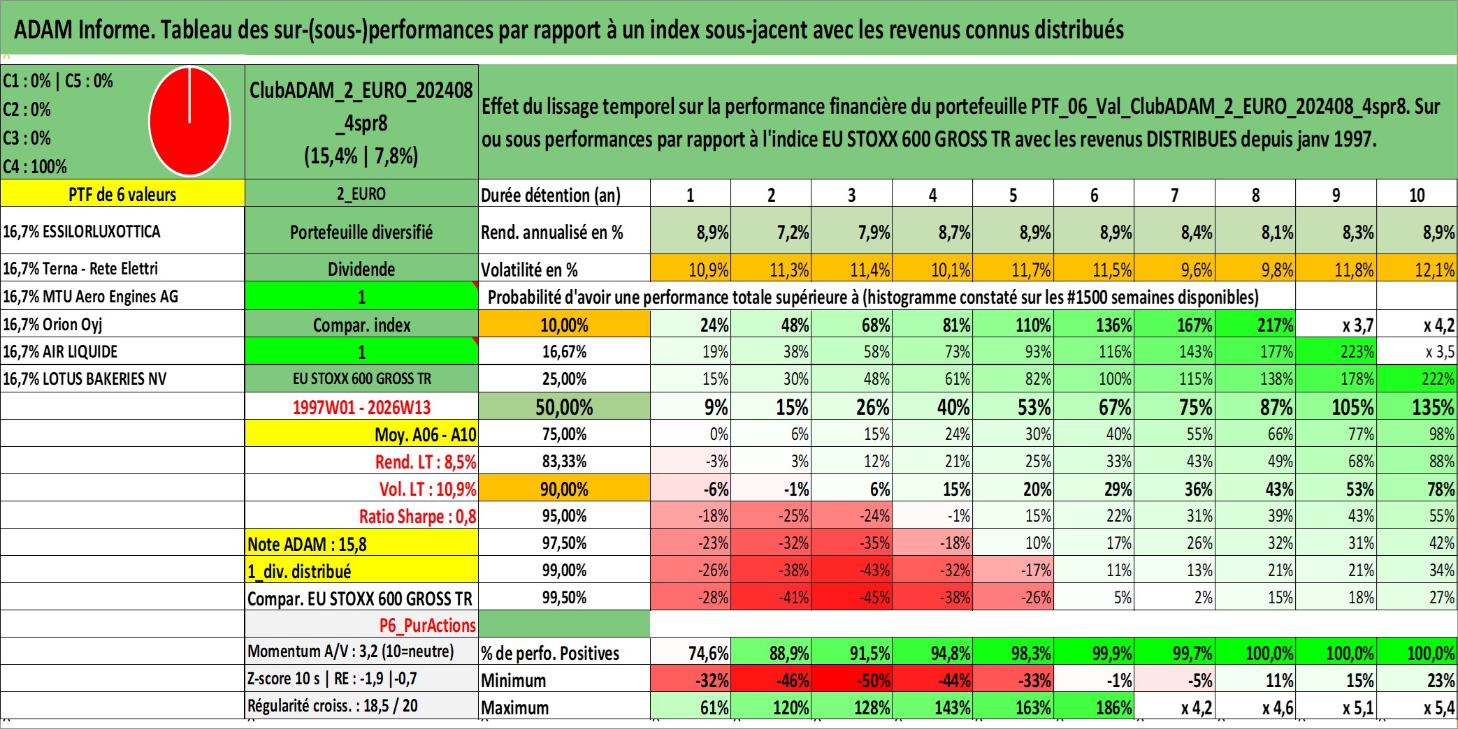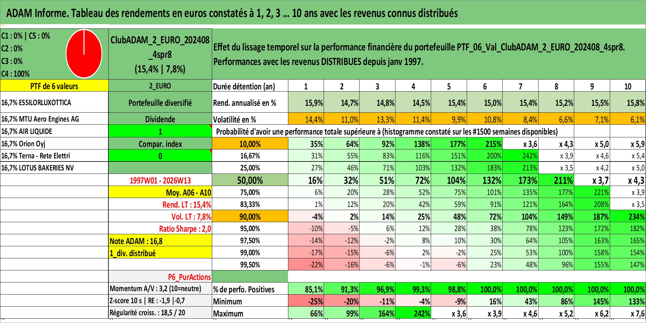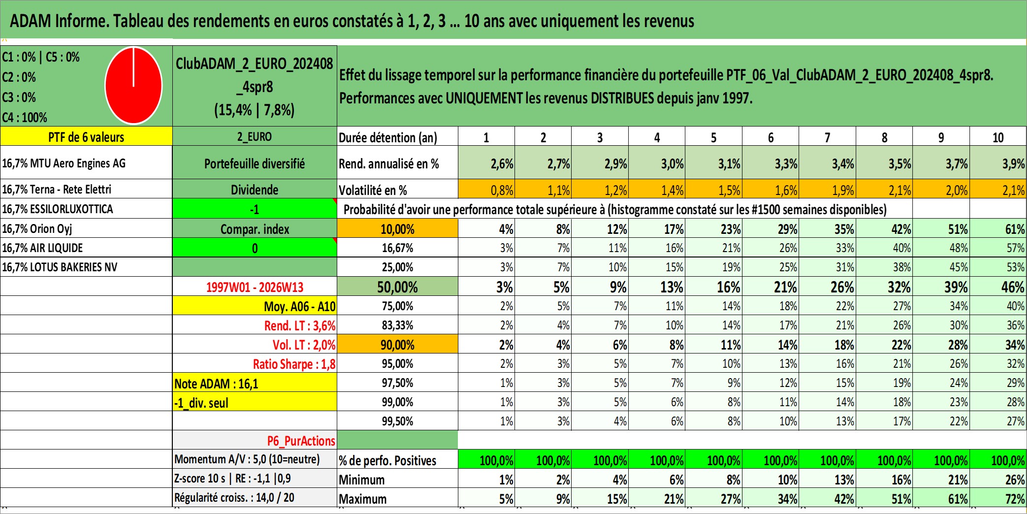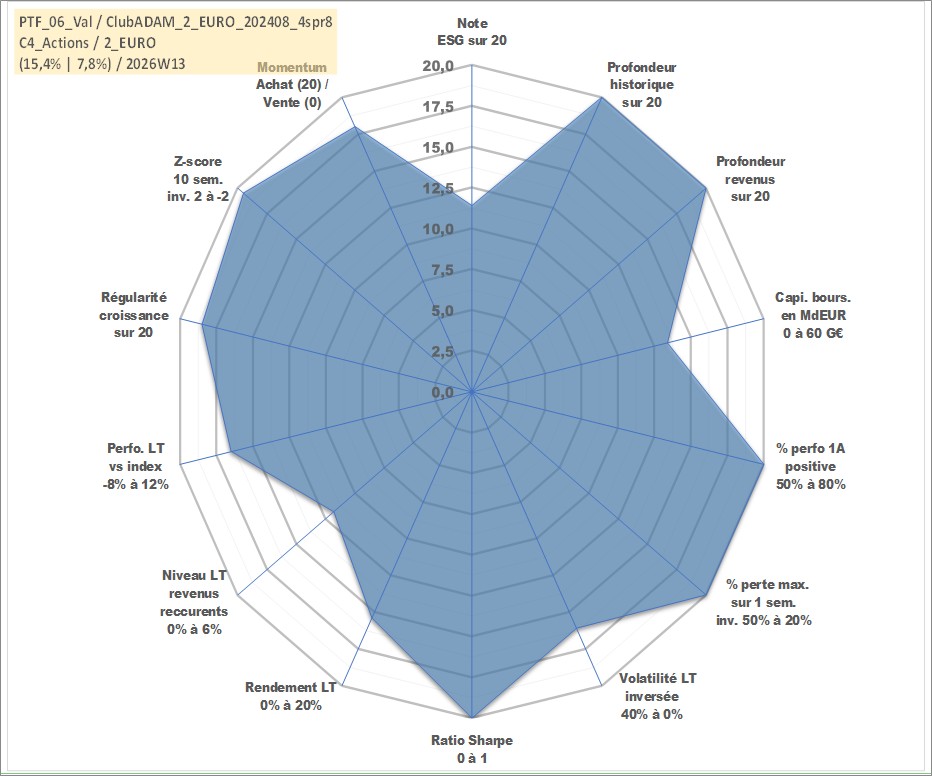 Site dédié aux investisseursPage dédiée sur site financeAnalyse des valorisations hebdomadaires du portefeuille ClubADAM_2_EURO_202408_4spr8_6actifs avec un profil P6_PurActions. Ce portefeuille est cote en EUR. Les valorisations couvrent les semaines 1997W01 a 2026W13. Les revenus de cet actif financier sont pris en compte depuis la semaine 1997W01. La note globale ESG de cet actif est estimee a 11.4 (apres rebasage entre 0 et 20).