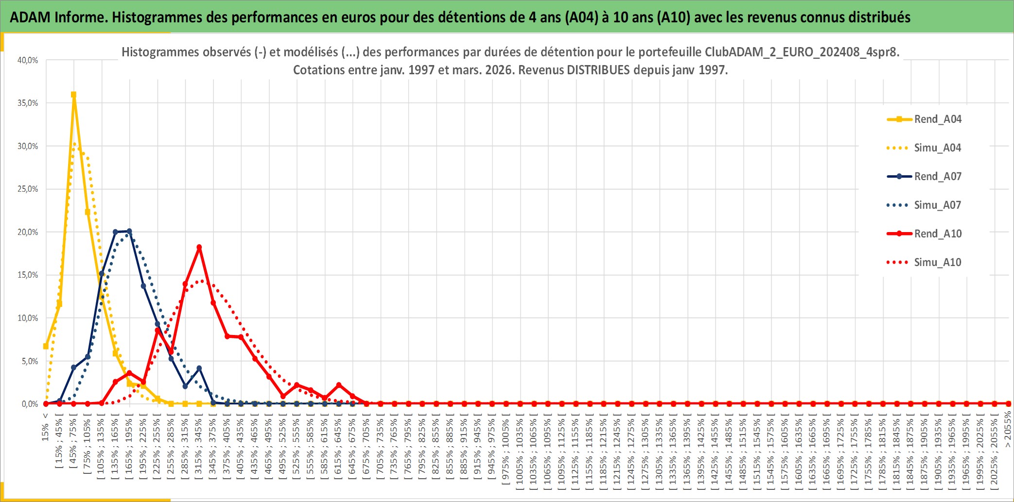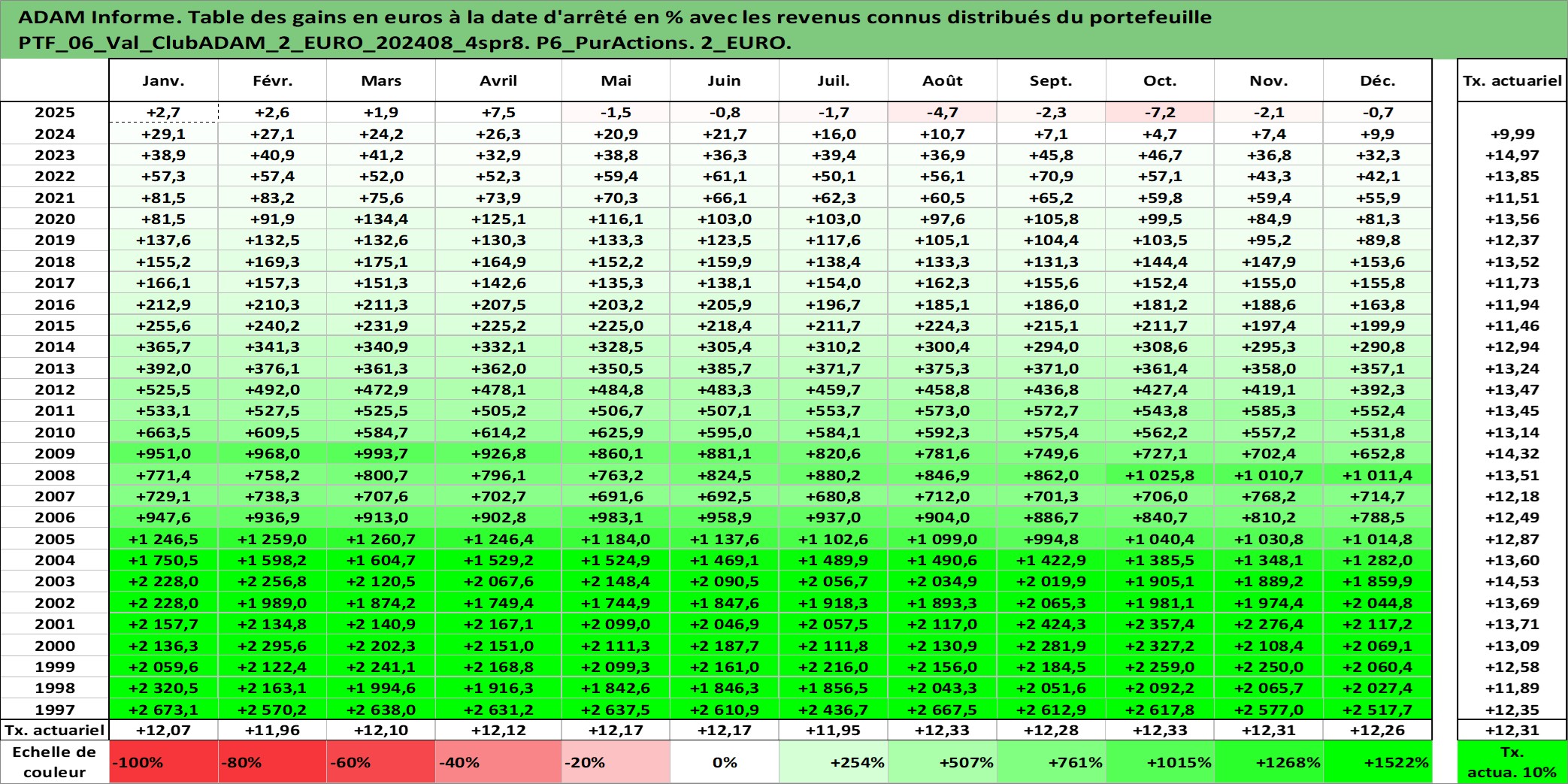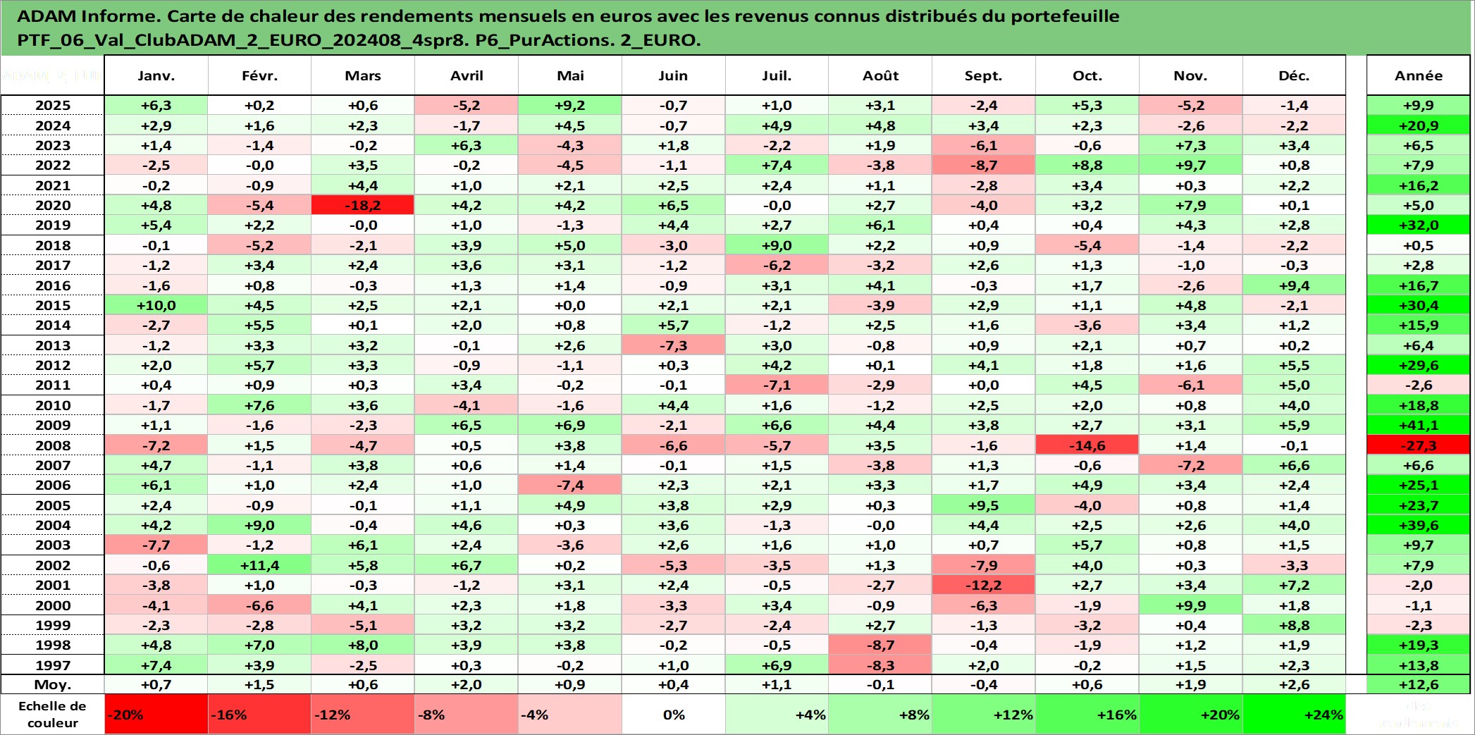 Site dédié aux investisseursPage dédiée sur site financeAnalyse des valorisations hebdomadaires du portefeuille ClubADAM_2_EURO_202408_4spr8_6actifs avec un profil P6_PurActions. Ce portefeuille est cote en EUR. Les valorisations couvrent les semaines 1997W01 a 2026W13. Les revenus de cet actif financier sont pris en compte depuis la semaine 1997W01. La note globale ESG de cet actif est estimee a 11.4 (apres rebasage entre 0 et 20).