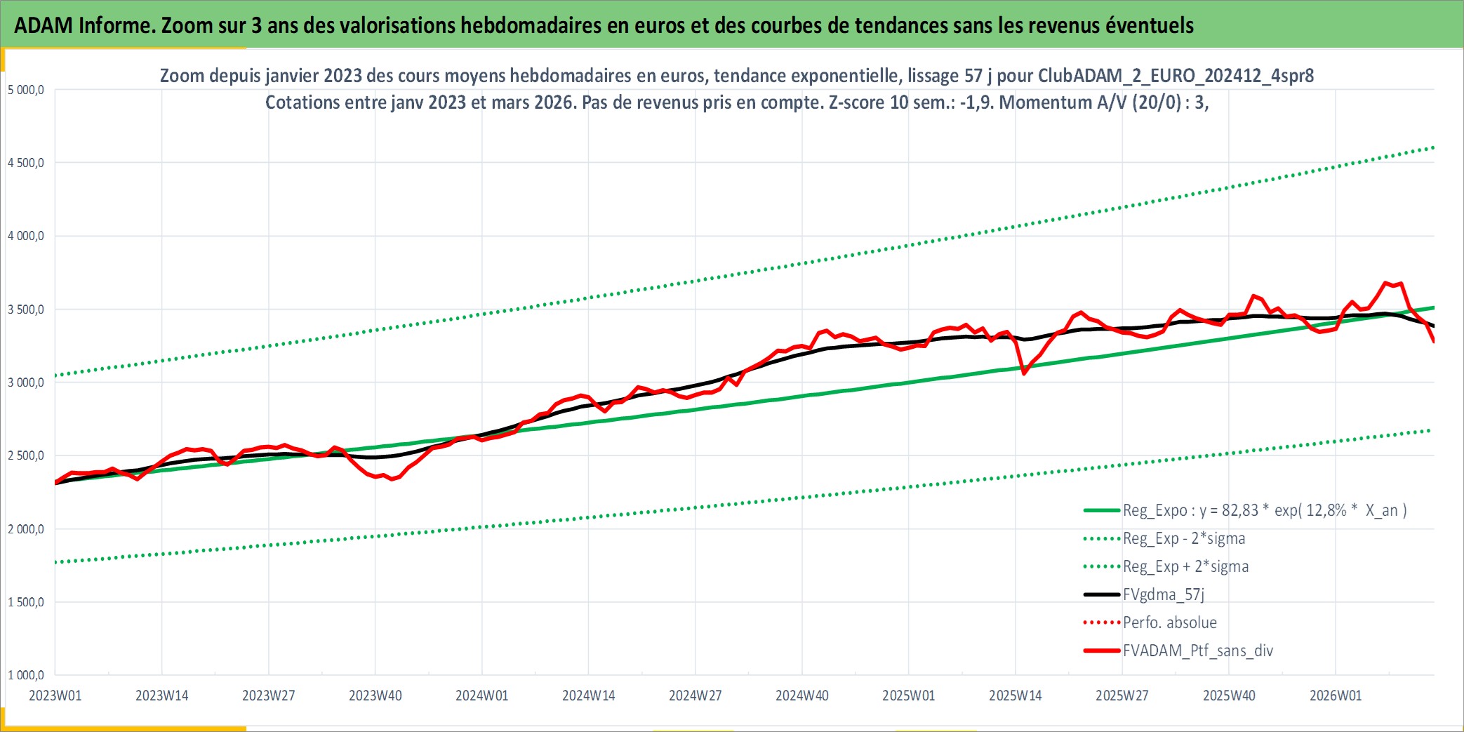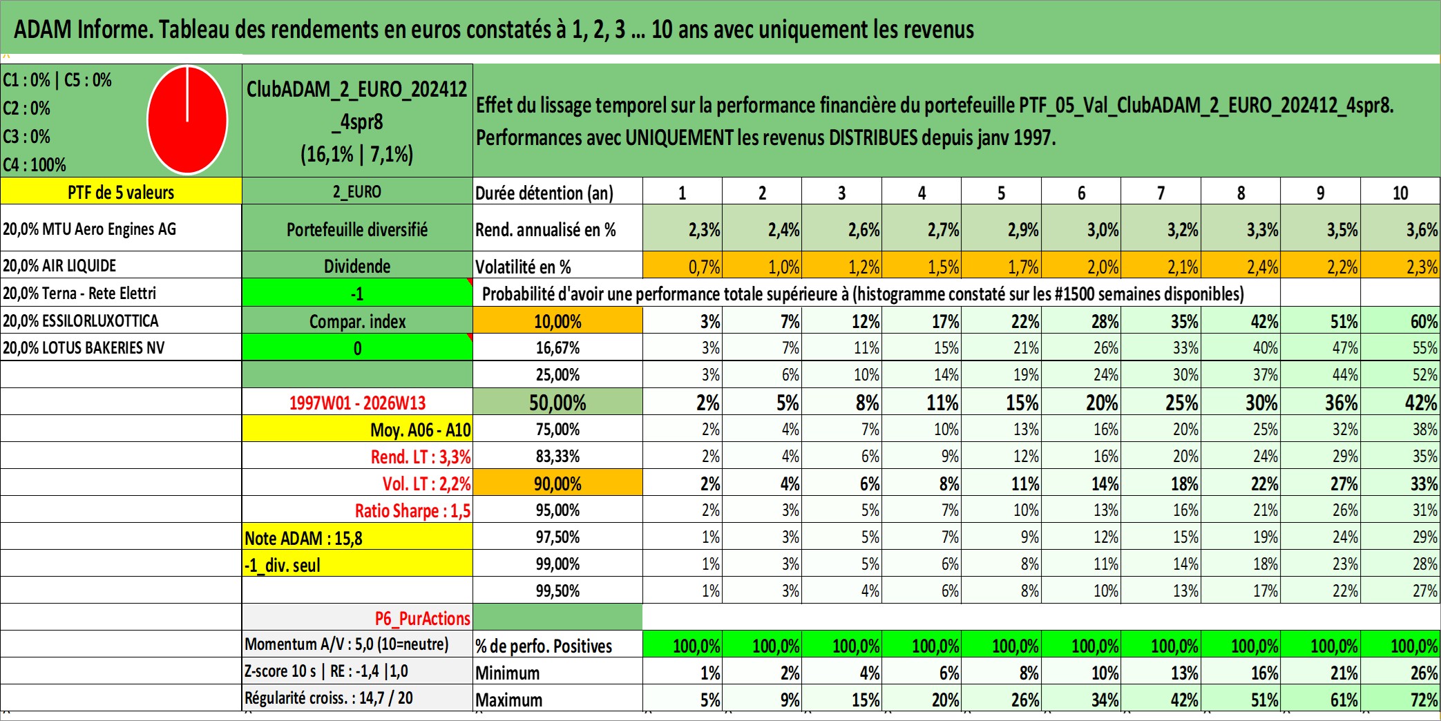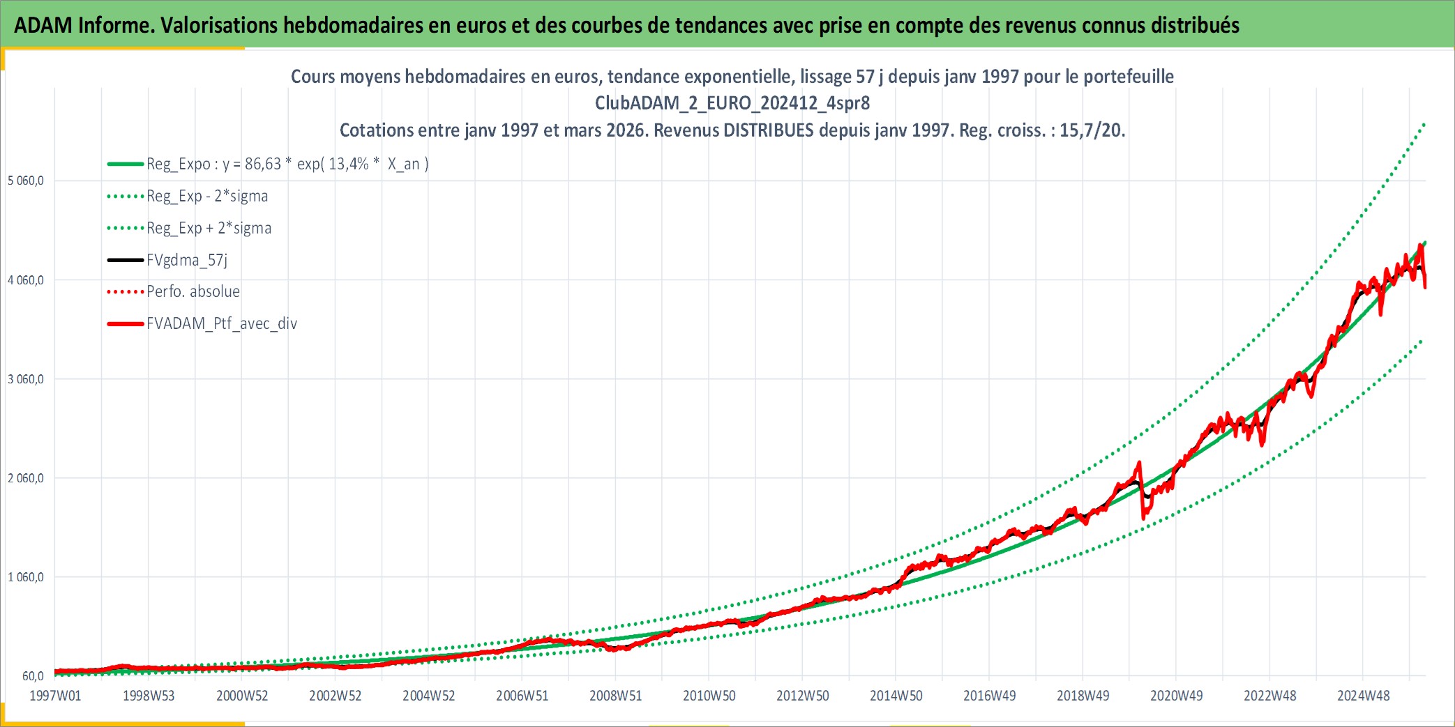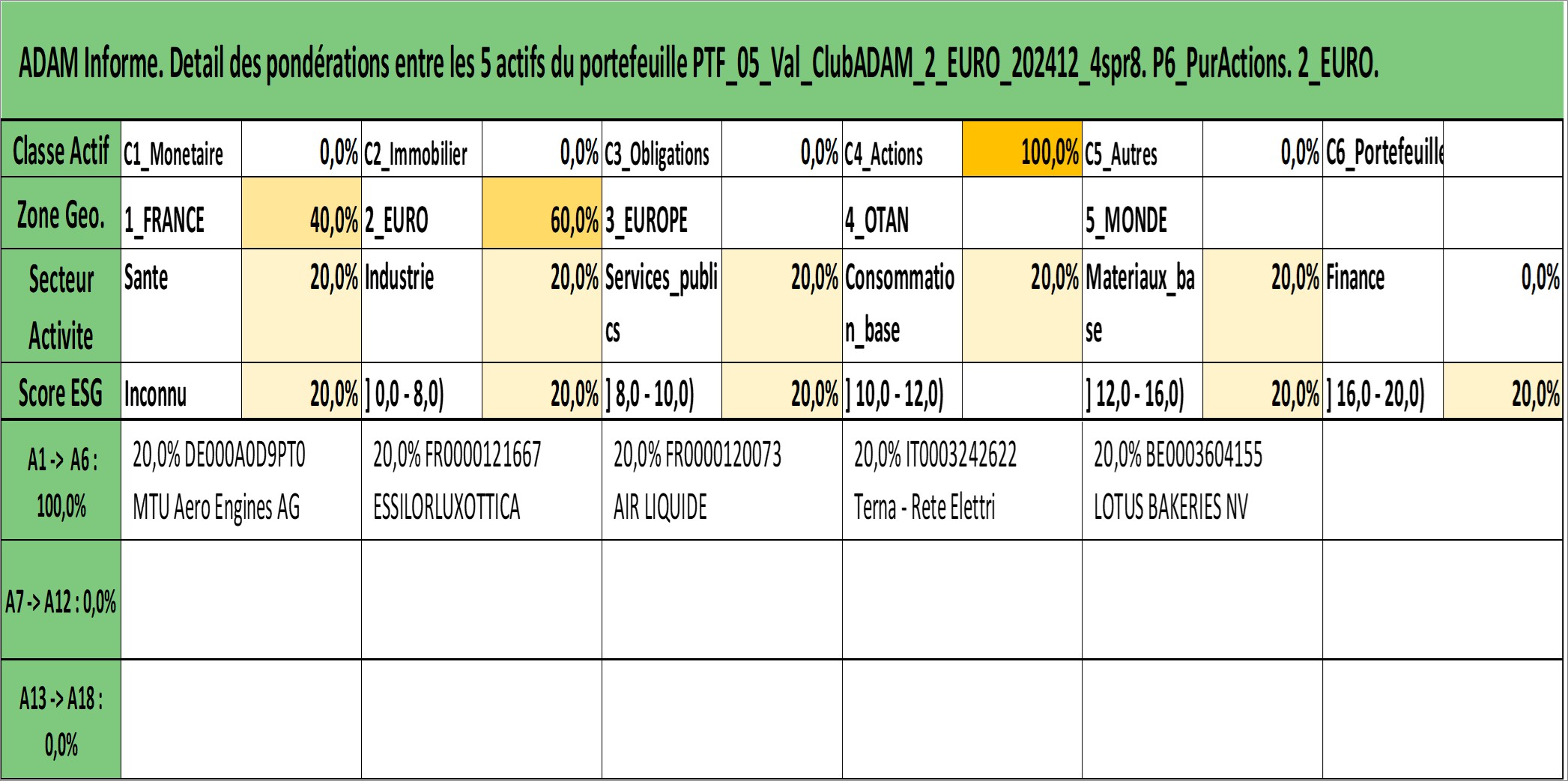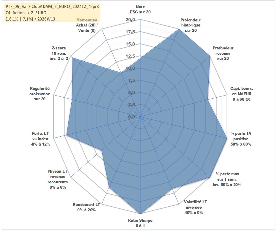 Site dédié aux investisseursPage dédiée sur site financeAnalyse des valorisations hebdomadaires du portefeuille ClubADAM_2_EURO_202412_4spr8_5actifs avec un profil P6_PurActions. Ce portefeuille est cote en EUR. Les valorisations couvrent les semaines 1997W01 a 2026W13. Les revenus de cet actif financier sont pris en compte depuis la semaine 1997W01. La note globale ESG de cet actif est estimee a 12.0 (apres rebasage entre 0 et 20).
