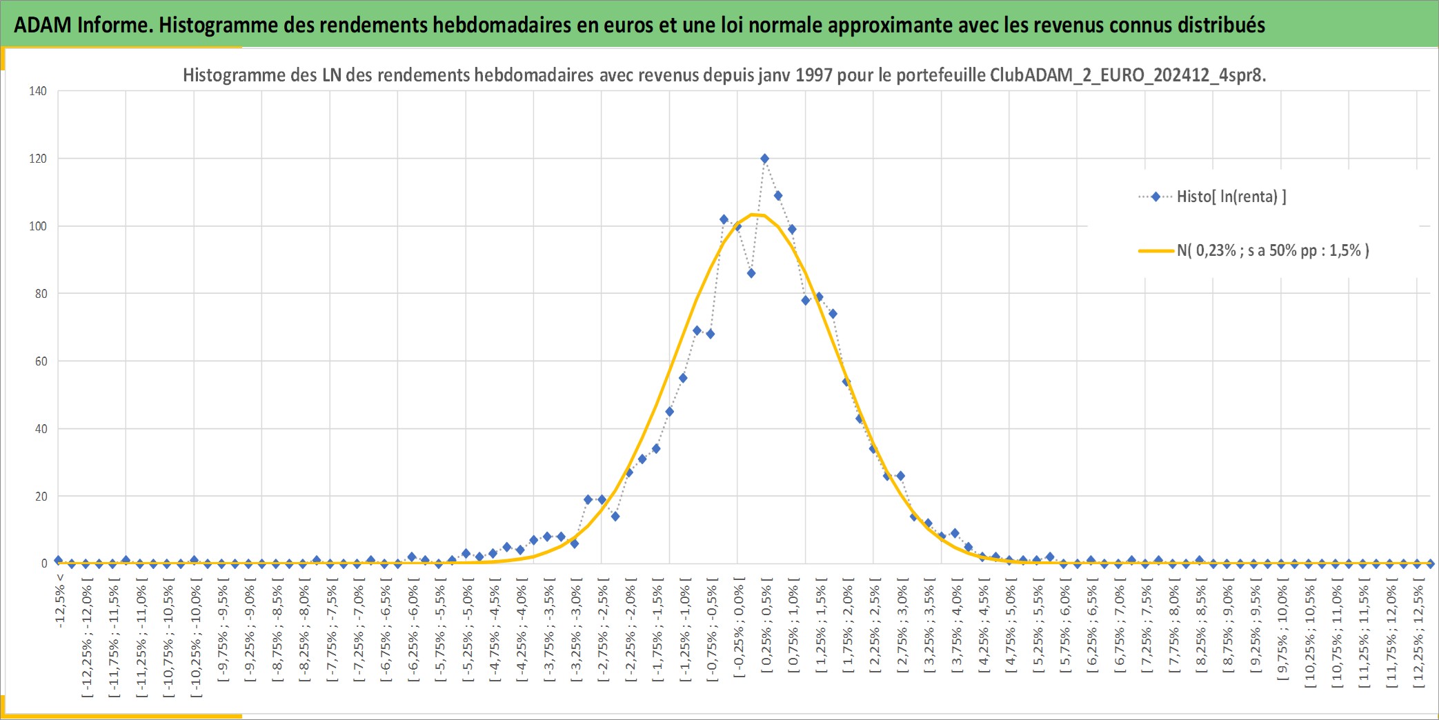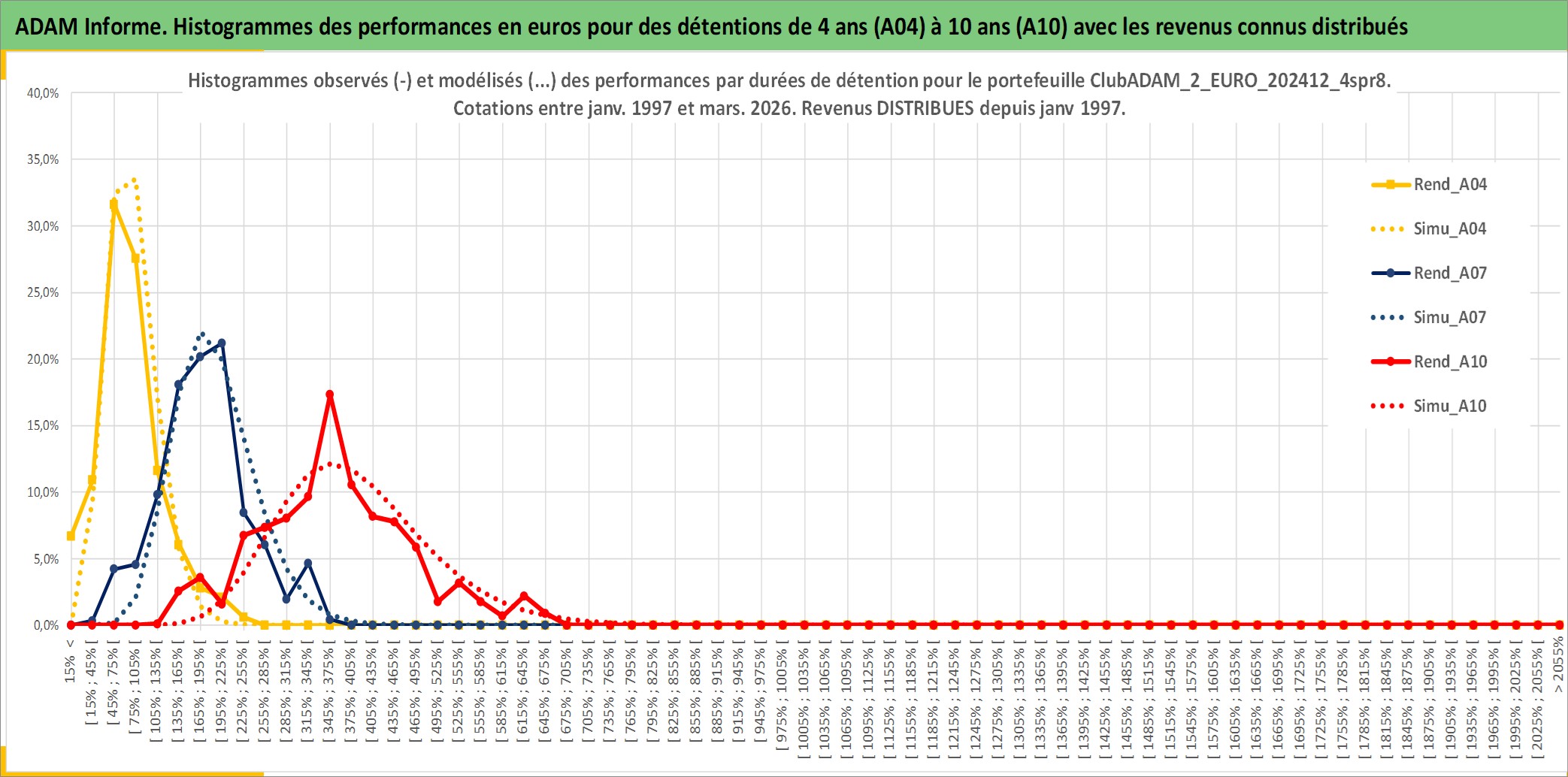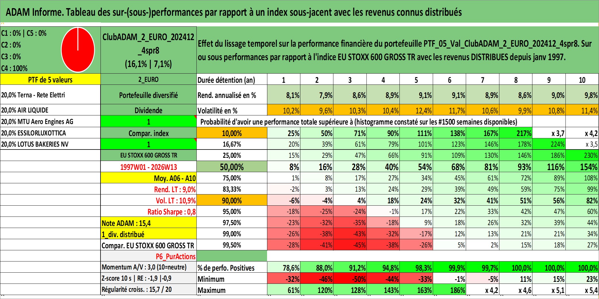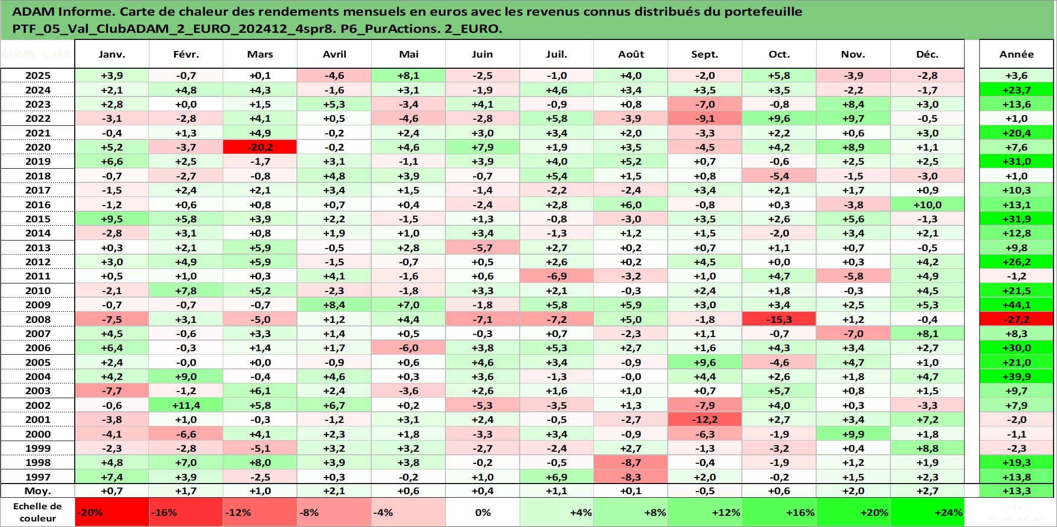 Site dédié aux investisseursPage dédiée sur site financeAnalyse des valorisations hebdomadaires du portefeuille ClubADAM_2_EURO_202412_4spr8_5actifs avec un profil P6_PurActions. Ce portefeuille est cote en EUR. Les valorisations couvrent les semaines 1997W01 a 2026W13. Les revenus de cet actif financier sont pris en compte depuis la semaine 1997W01. La note globale ESG de cet actif est estimee a 12.0 (apres rebasage entre 0 et 20).