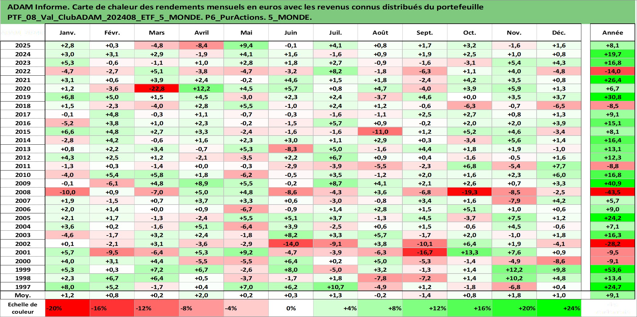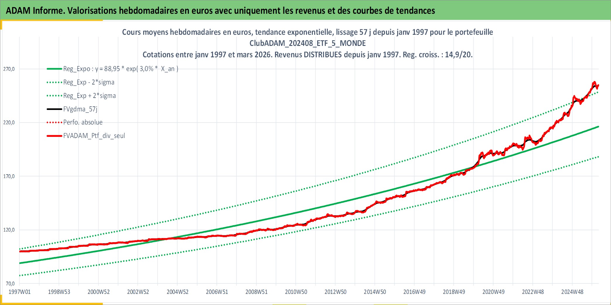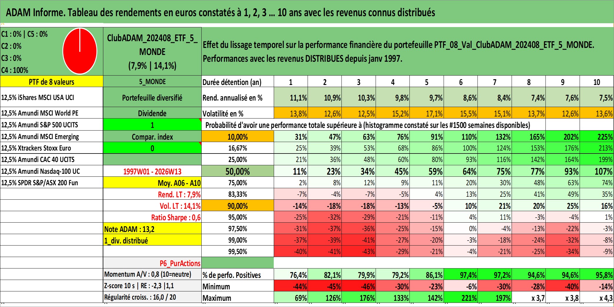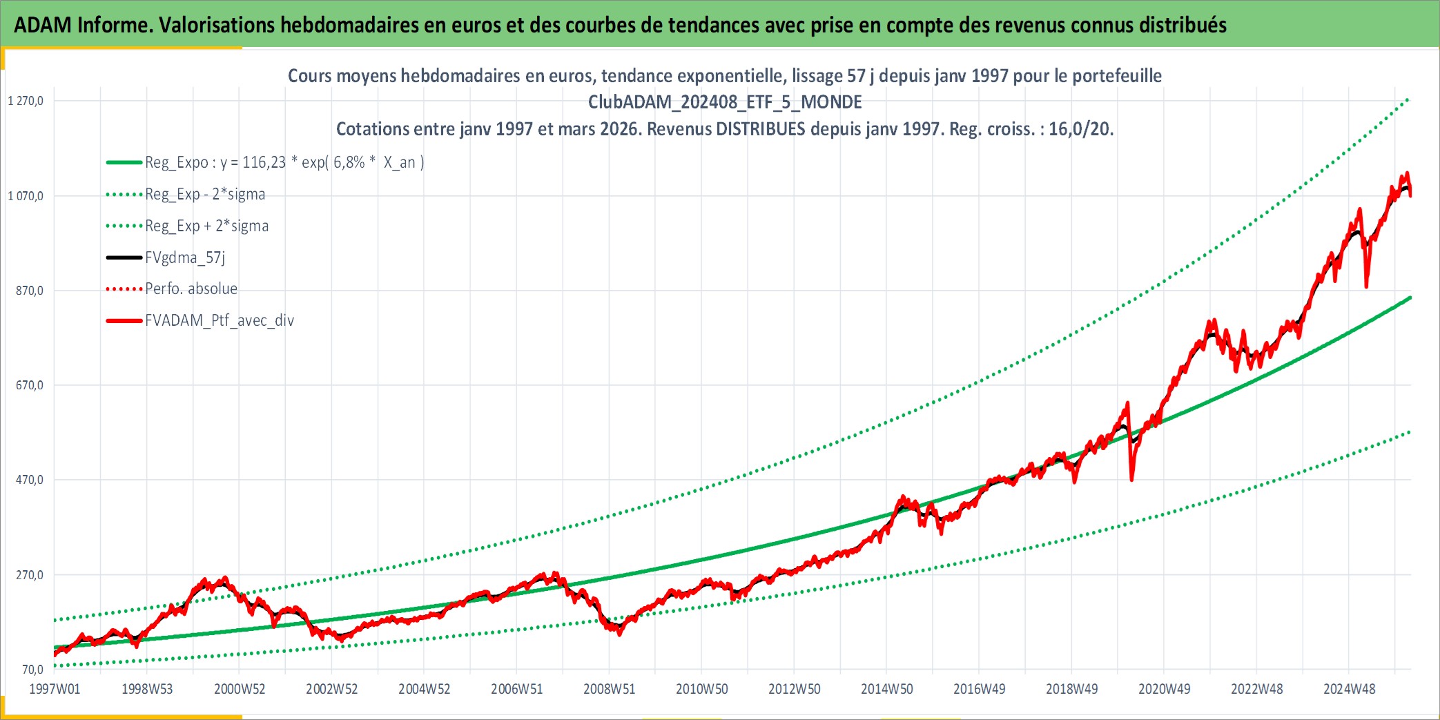 Site dédié aux investisseursPage dédiée sur site financeAnalyse des valorisations hebdomadaires du portefeuille ClubADAM_202408_ETF_5_MONDE_8actifs avec un profil P6_PurActions. Ce portefeuille est cote en EUR. Les valorisations couvrent les semaines 1997W01 a 2026W13. Les revenus de cet actif financier sont pris en compte depuis la semaine 1997W01. La note ESG de cet actif n'est pas connue.