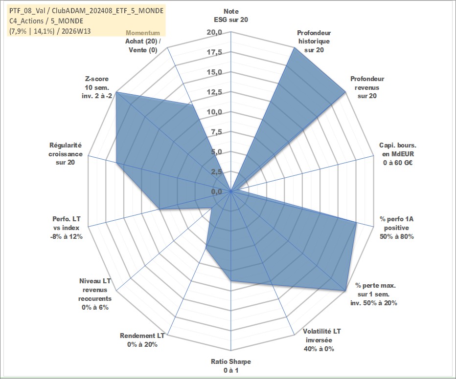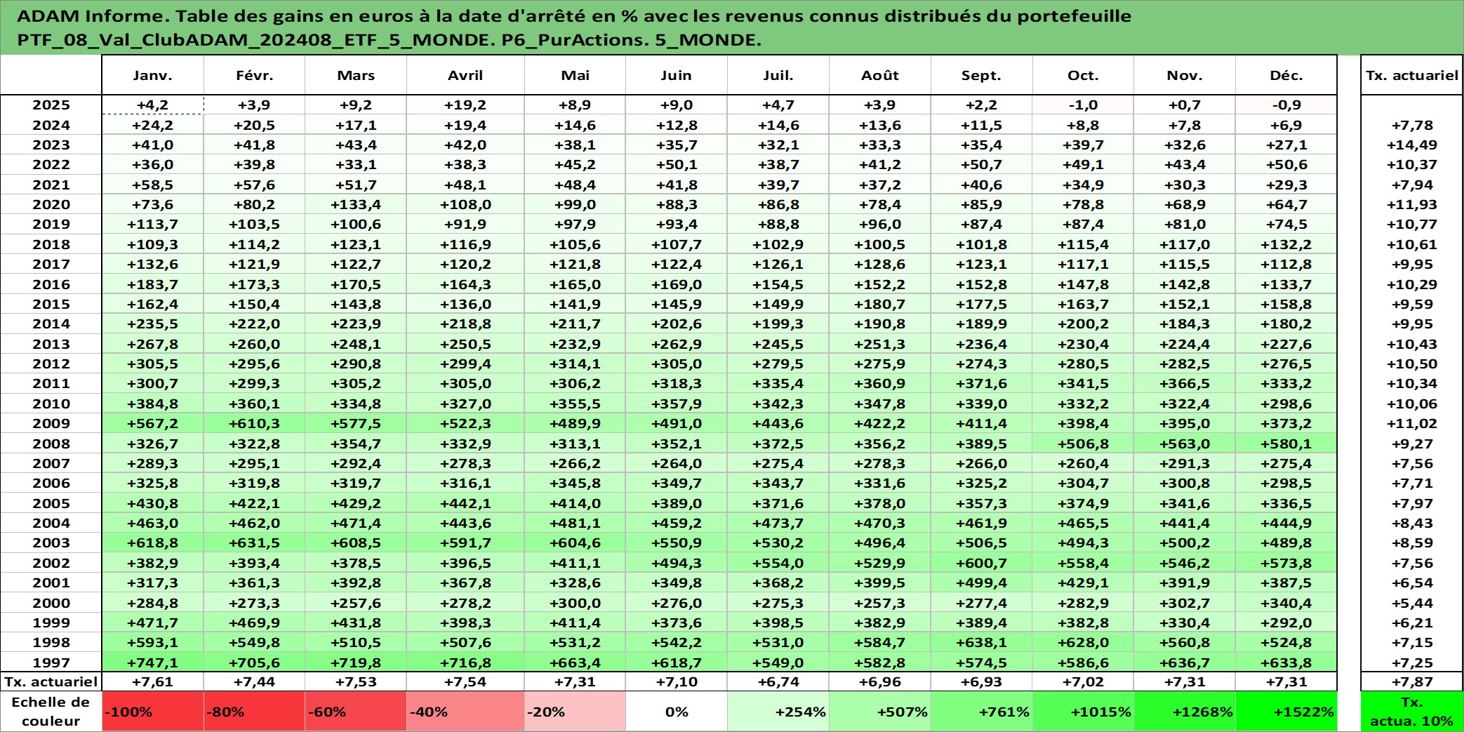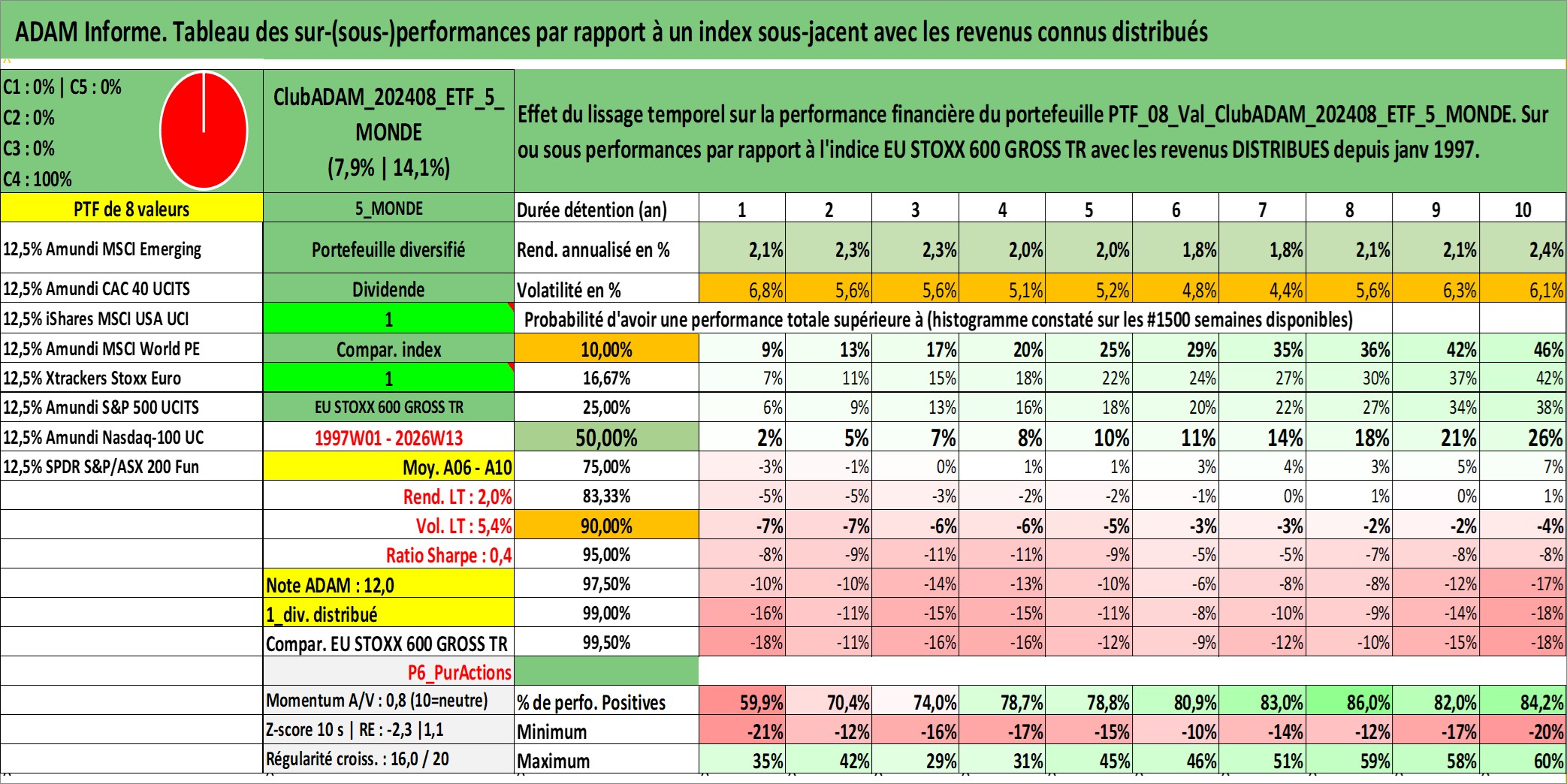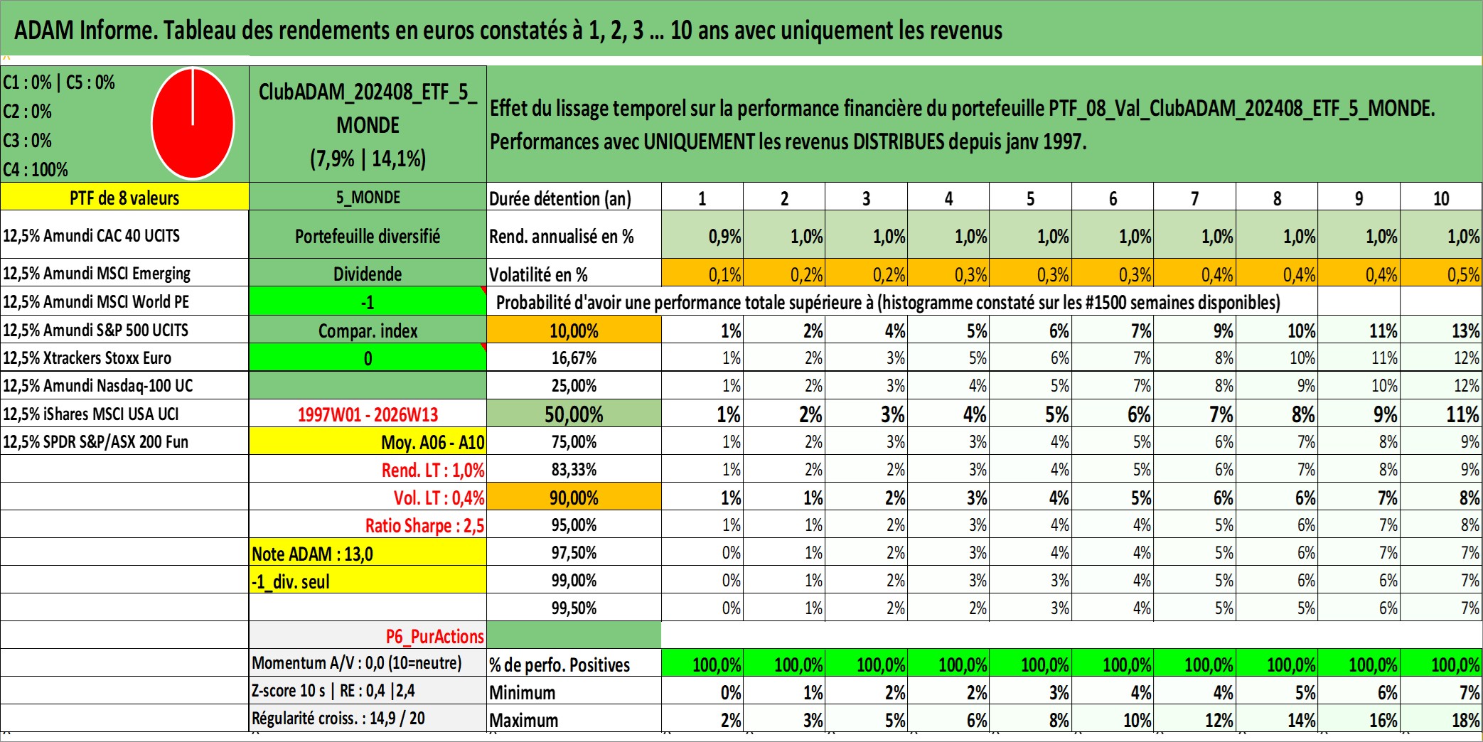 Site dédié aux investisseursPage dédiée sur site financeAnalyse des valorisations hebdomadaires du portefeuille ClubADAM_202408_ETF_5_MONDE_8actifs avec un profil P6_PurActions. Ce portefeuille est cote en EUR. Les valorisations couvrent les semaines 1997W01 a 2026W13. Les revenus de cet actif financier sont pris en compte depuis la semaine 1997W01. La note ESG de cet actif n'est pas connue.