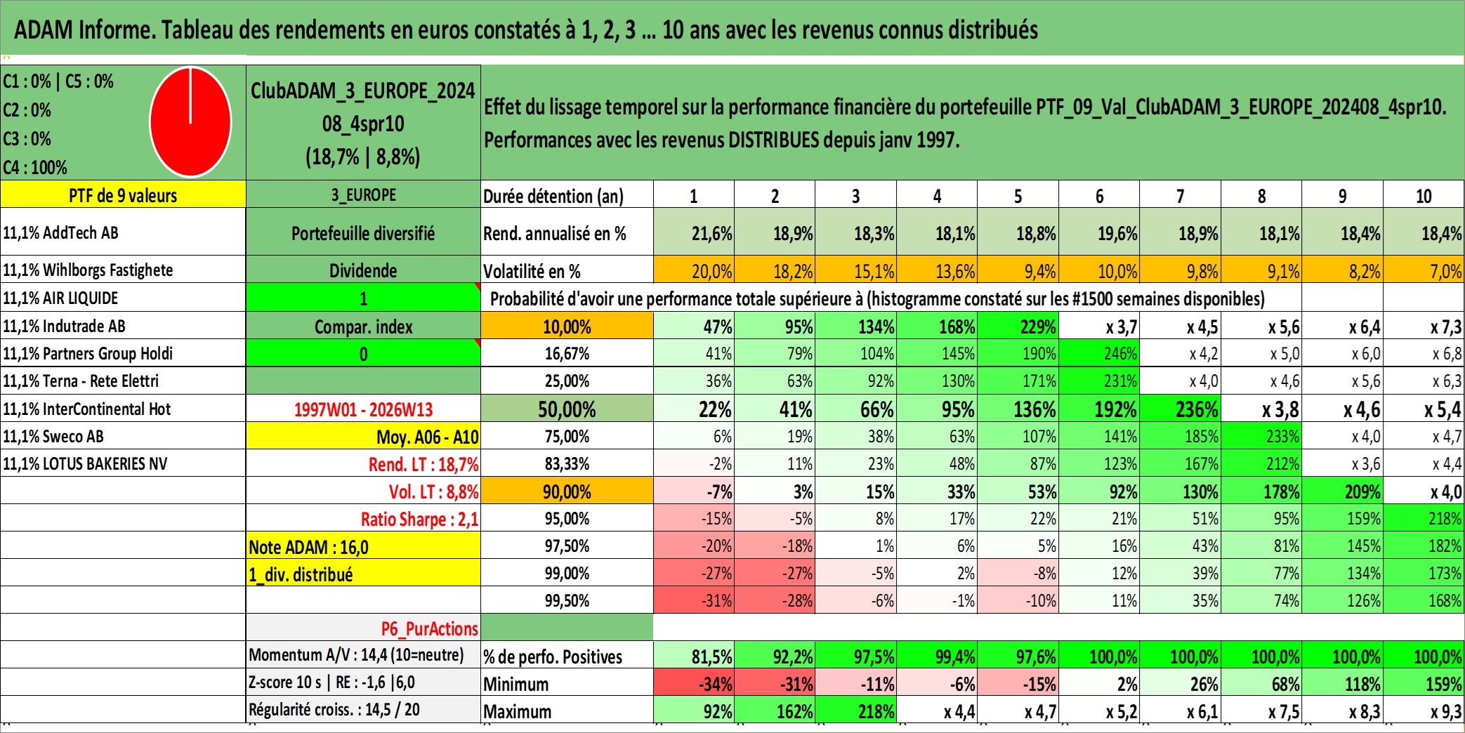 Site dédié aux investisseursPage dédiée sur site financeAnalyse des valorisations hebdomadaires du portefeuille ClubADAM_3_EUROPE_202408_4spr10_9actifs avec un profil P6_PurActions. Ce portefeuille est cote en EUR. Les valorisations couvrent les semaines 1997W01 a 2026W13. Les revenus de cet actif financier sont pris en compte depuis la semaine 1997W01. La note globale ESG de cet actif est estimee a 13.5 (apres rebasage entre 0 et 20).