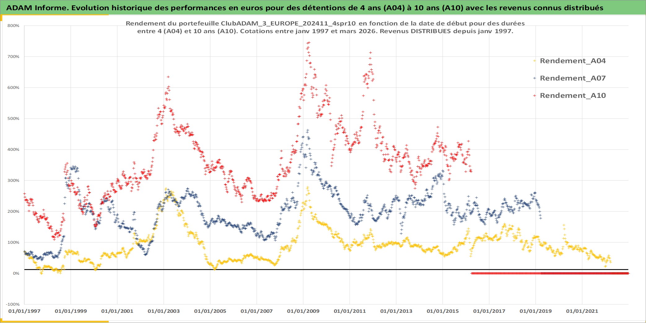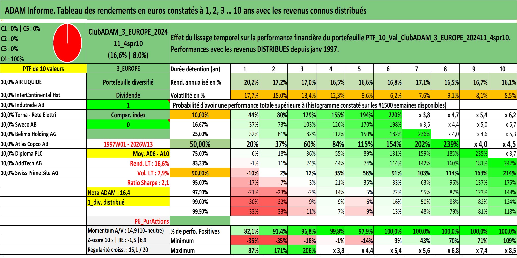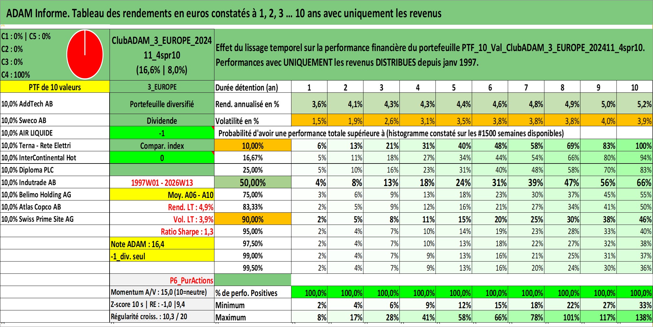 Site dédié aux investisseursPage dédiée sur site financeAnalyse des valorisations hebdomadaires du portefeuille ClubADAM_3_EUROPE_202411_4spr10_10actifs avec un profil P6_PurActions. Ce portefeuille est cote en EUR. Les valorisations couvrent les semaines 1997W01 a 2026W13. Les revenus de cet actif financier sont pris en compte depuis la semaine 1997W01. La note globale ESG de cet actif est estimee a 13.8 (apres rebasage entre 0 et 20).