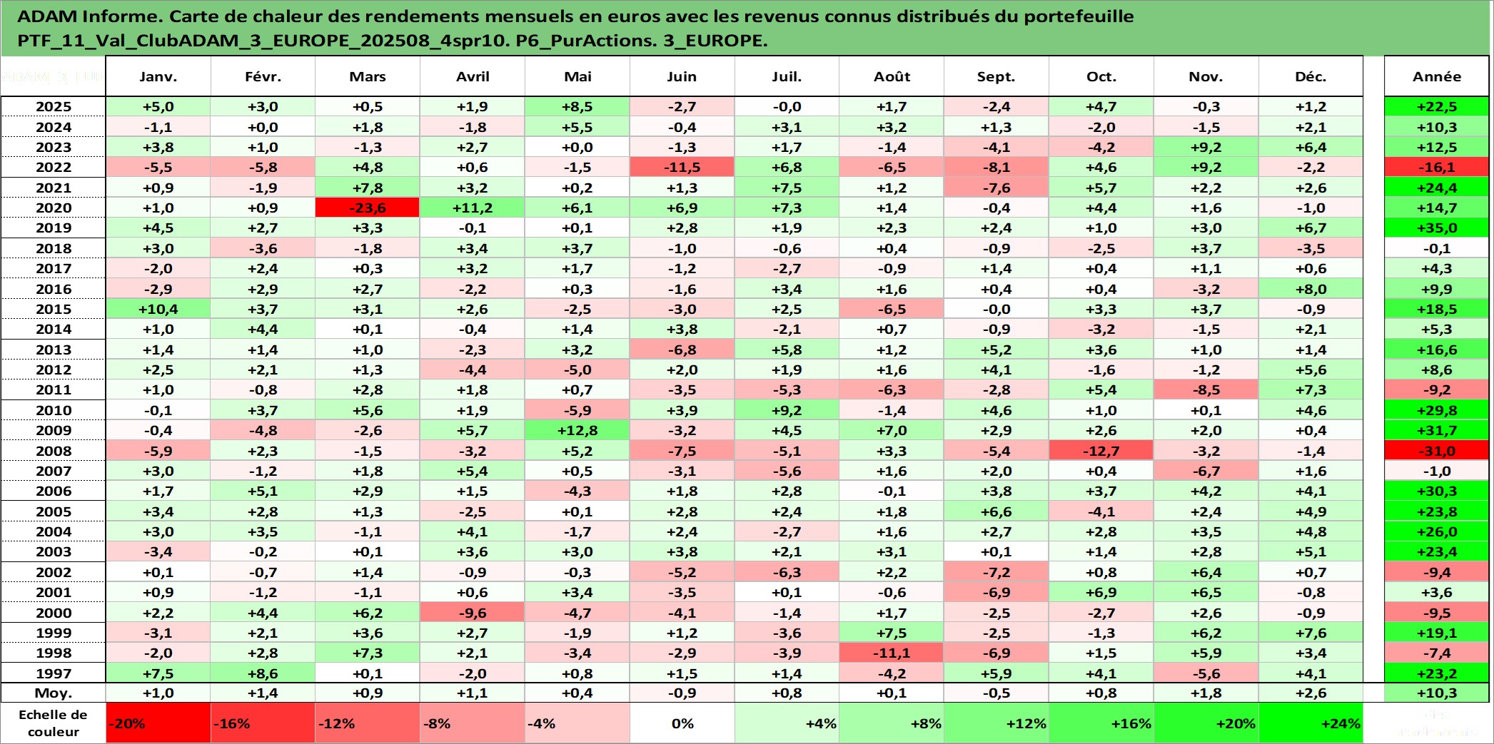 Site dédié aux investisseursPage dédiée sur site financeAnalyse des valorisations hebdomadaires du portefeuille ClubADAM_3_EUROPE_202508_4spr10_11actifs avec un profil P6_PurActions. Ce portefeuille est cote en EUR. Les valorisations couvrent les semaines 1997W01 a 2026W13. Les revenus de cet actif financier sont pris en compte depuis la semaine 1997W01. La note globale ESG de cet actif est estimee a 14.4 (apres rebasage entre 0 et 20).