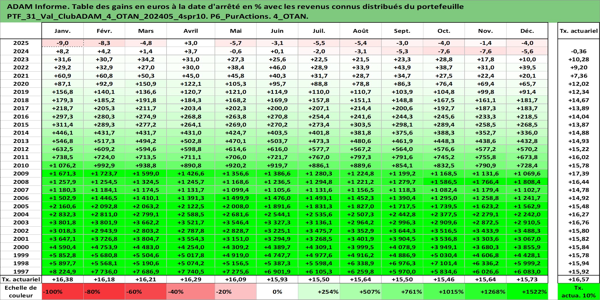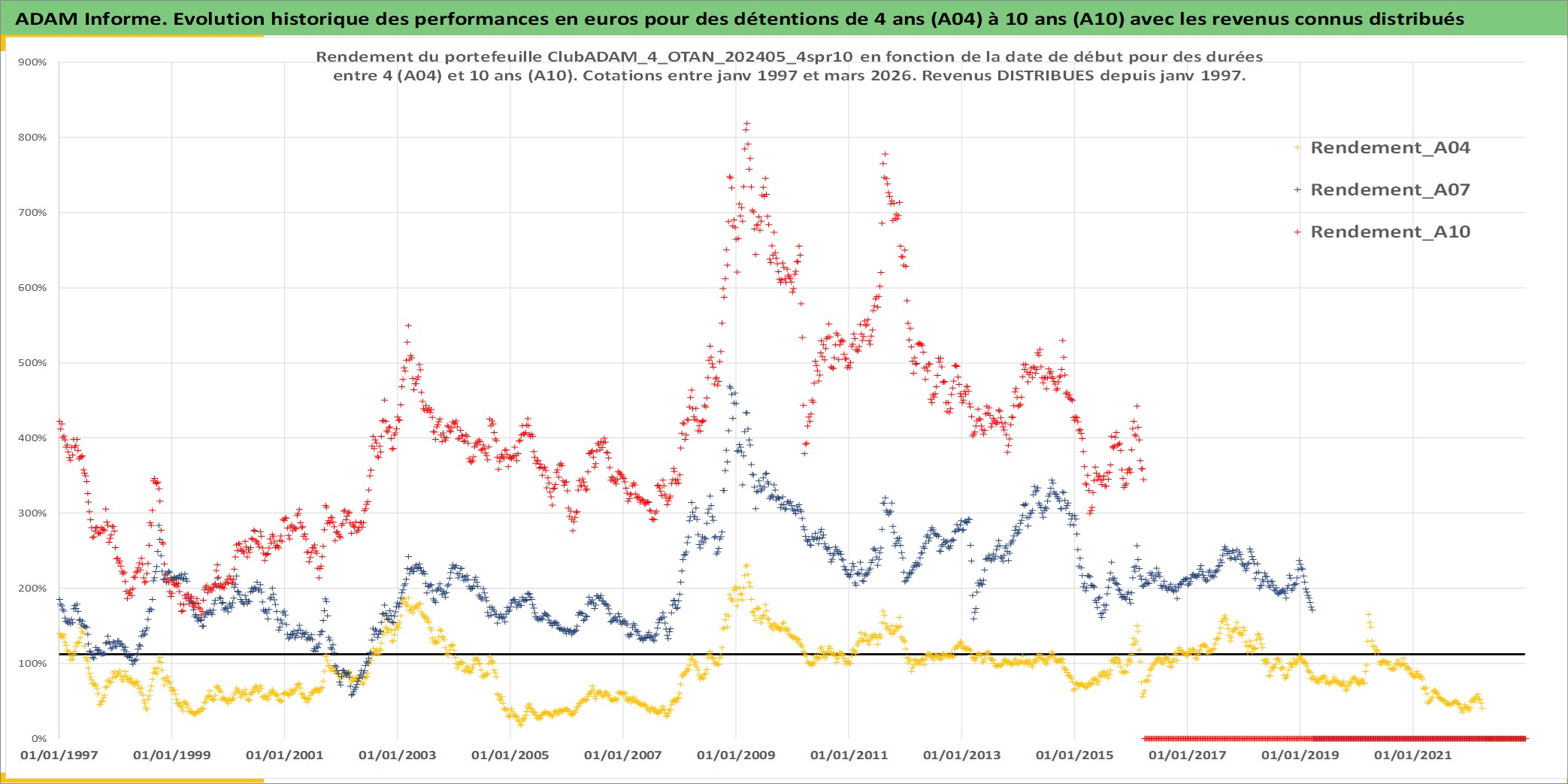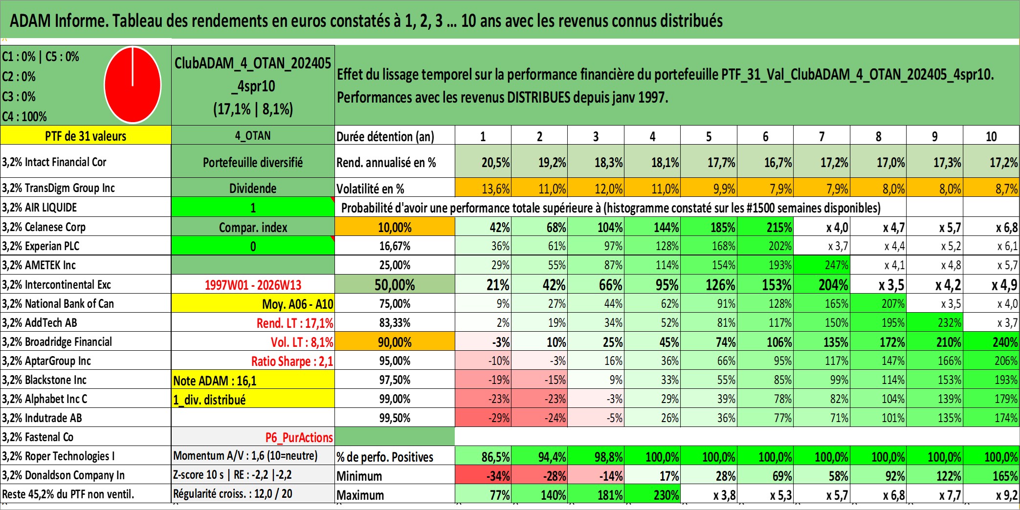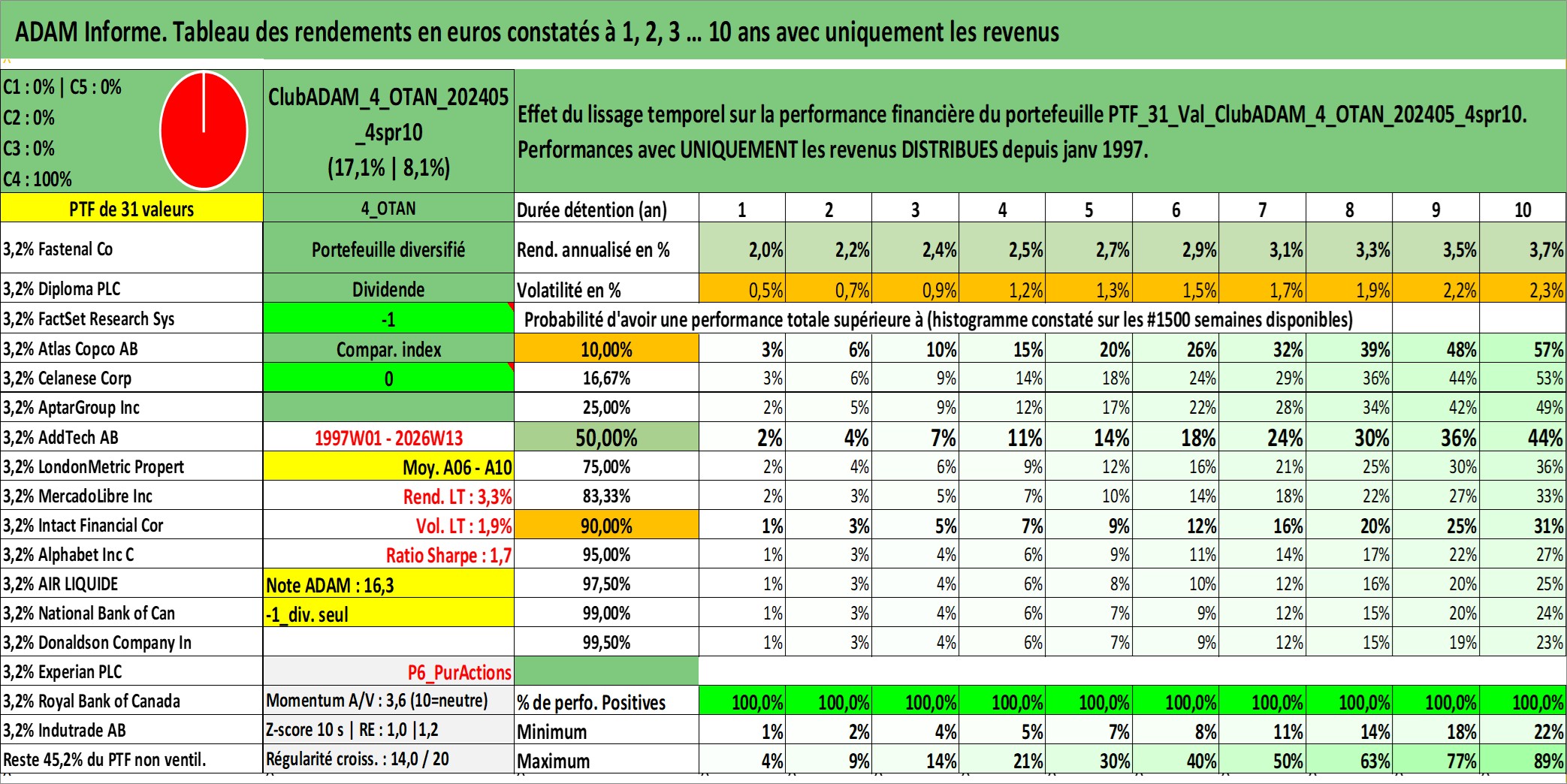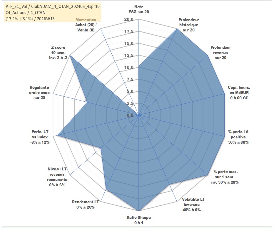 Site dédié aux investisseursPage dédiée sur site financeAnalyse des valorisations hebdomadaires du portefeuille ClubADAM_4_OTAN_202405_4spr10_31actifs avec un profil P6_PurActions. Ce portefeuille est cote en EUR. Les valorisations couvrent les semaines 1997W01 a 2026W13. Les revenus de cet actif financier sont pris en compte depuis la semaine 1997W01. La note globale ESG de cet actif est estimee a 10.2 (apres rebasage entre 0 et 20).