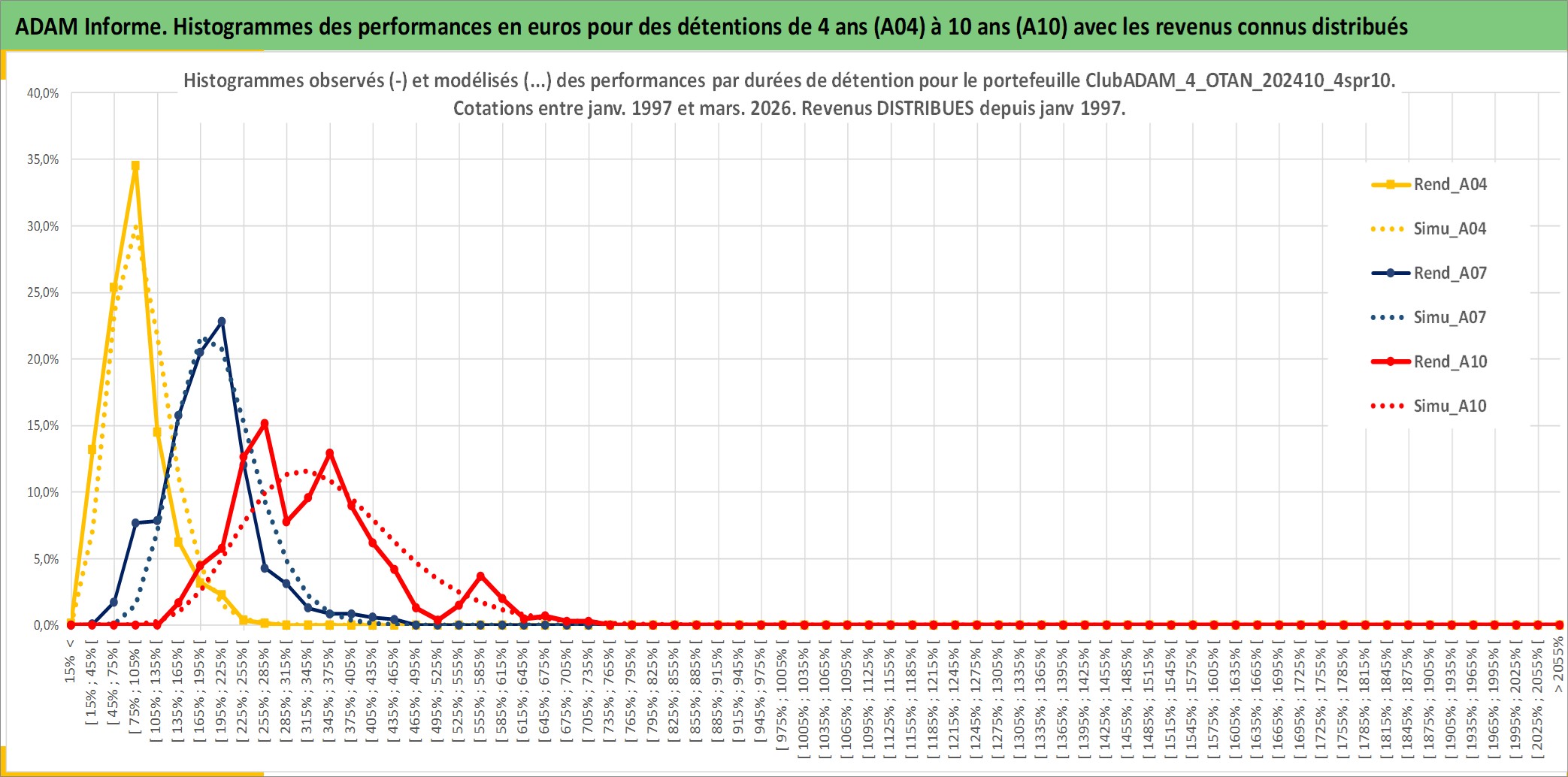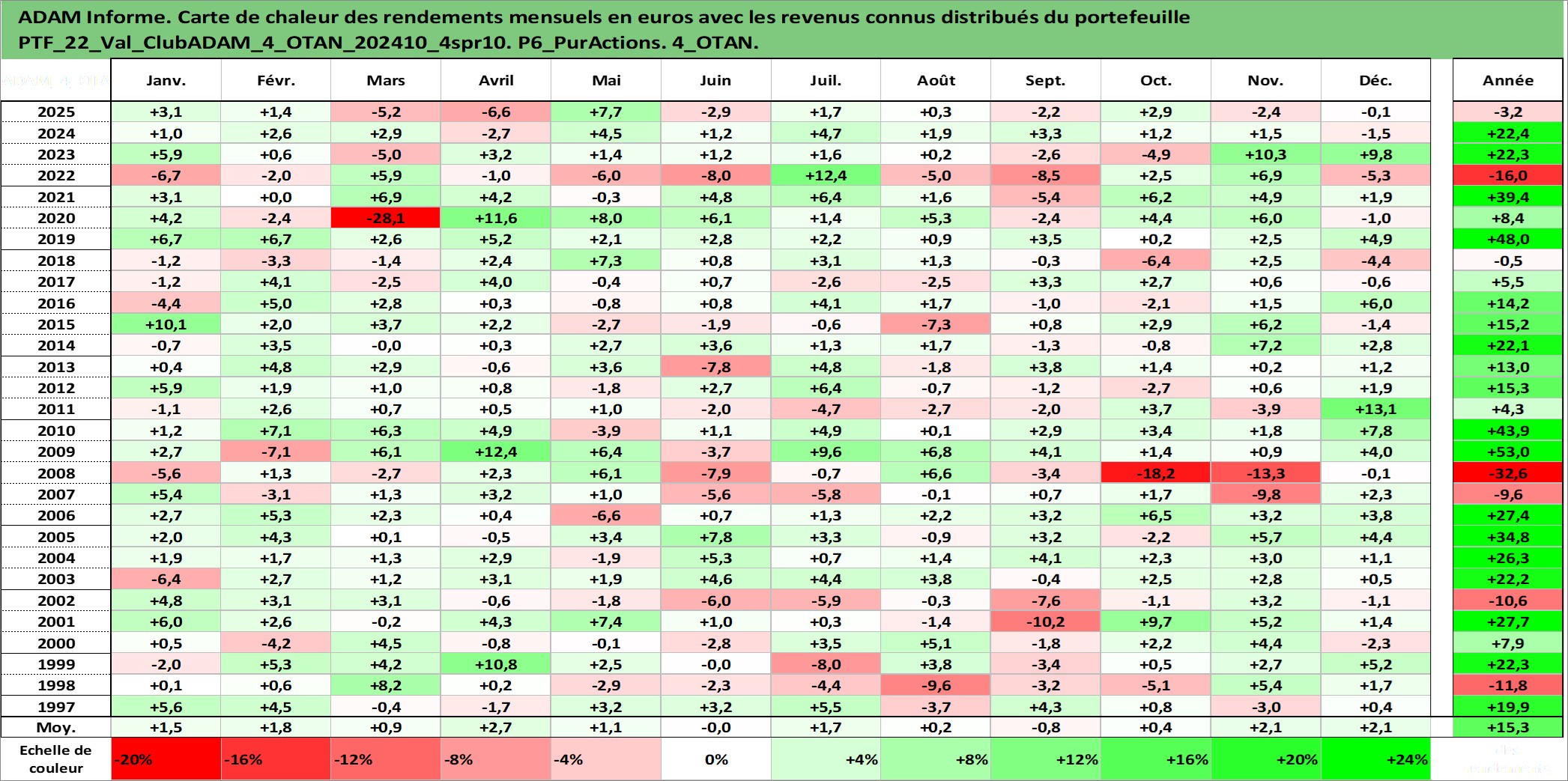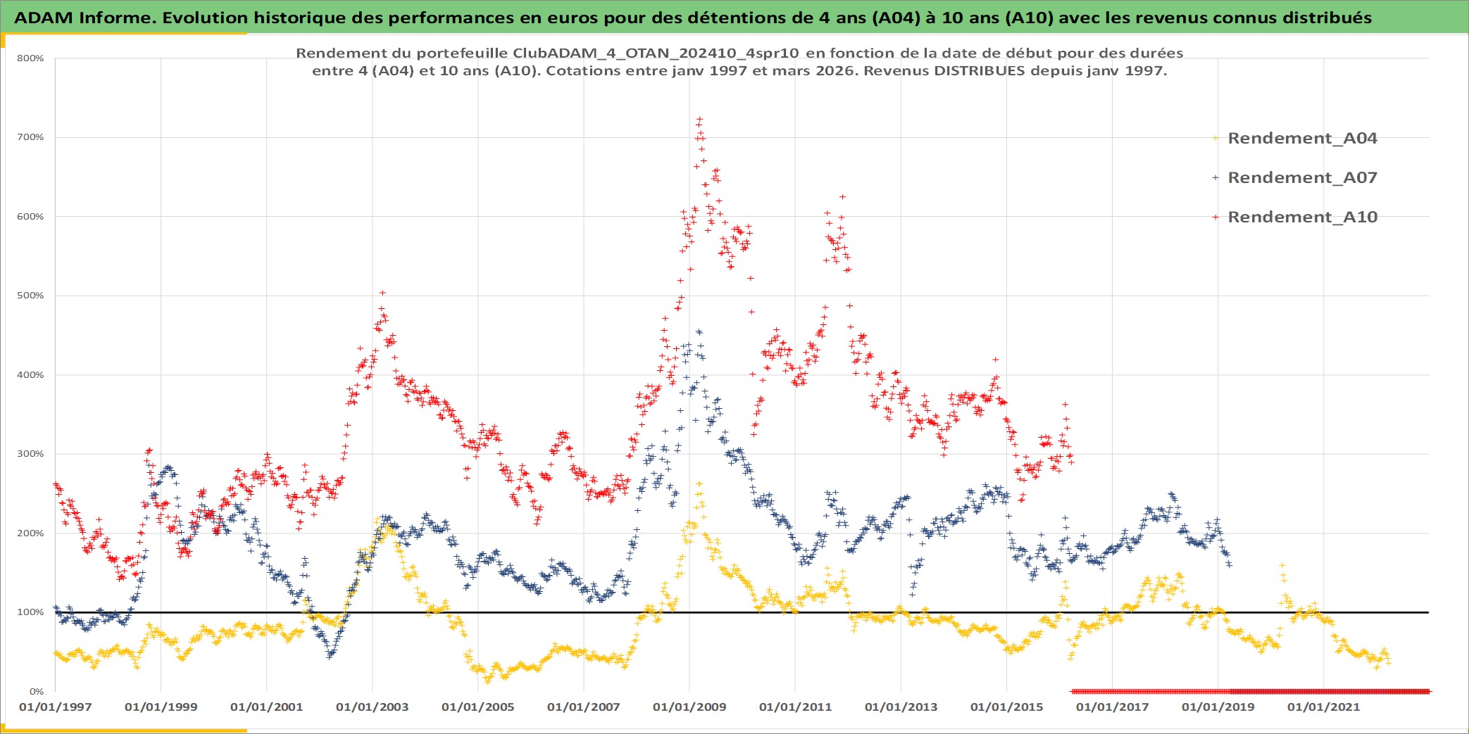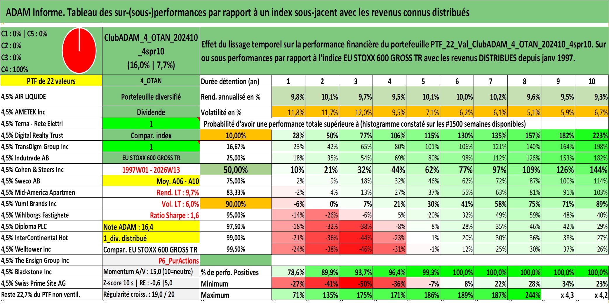 Site dédié aux investisseursPage dédiée sur site financeAnalyse des valorisations hebdomadaires du portefeuille ClubADAM_4_OTAN_202410_4spr10_22actifs avec un profil P6_PurActions. Ce portefeuille est cote en EUR. Les valorisations couvrent les semaines 1997W01 a 2026W13. Les revenus de cet actif financier sont pris en compte depuis la semaine 1997W01. La note globale ESG de cet actif est estimee a 12.0 (apres rebasage entre 0 et 20).