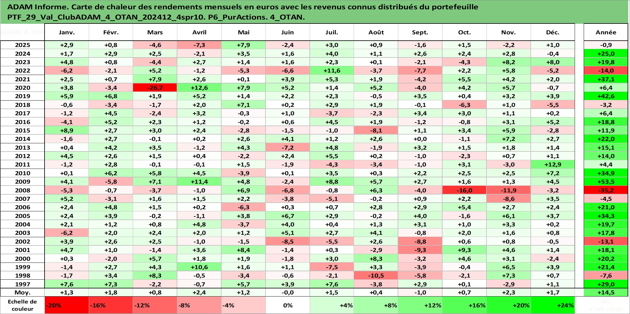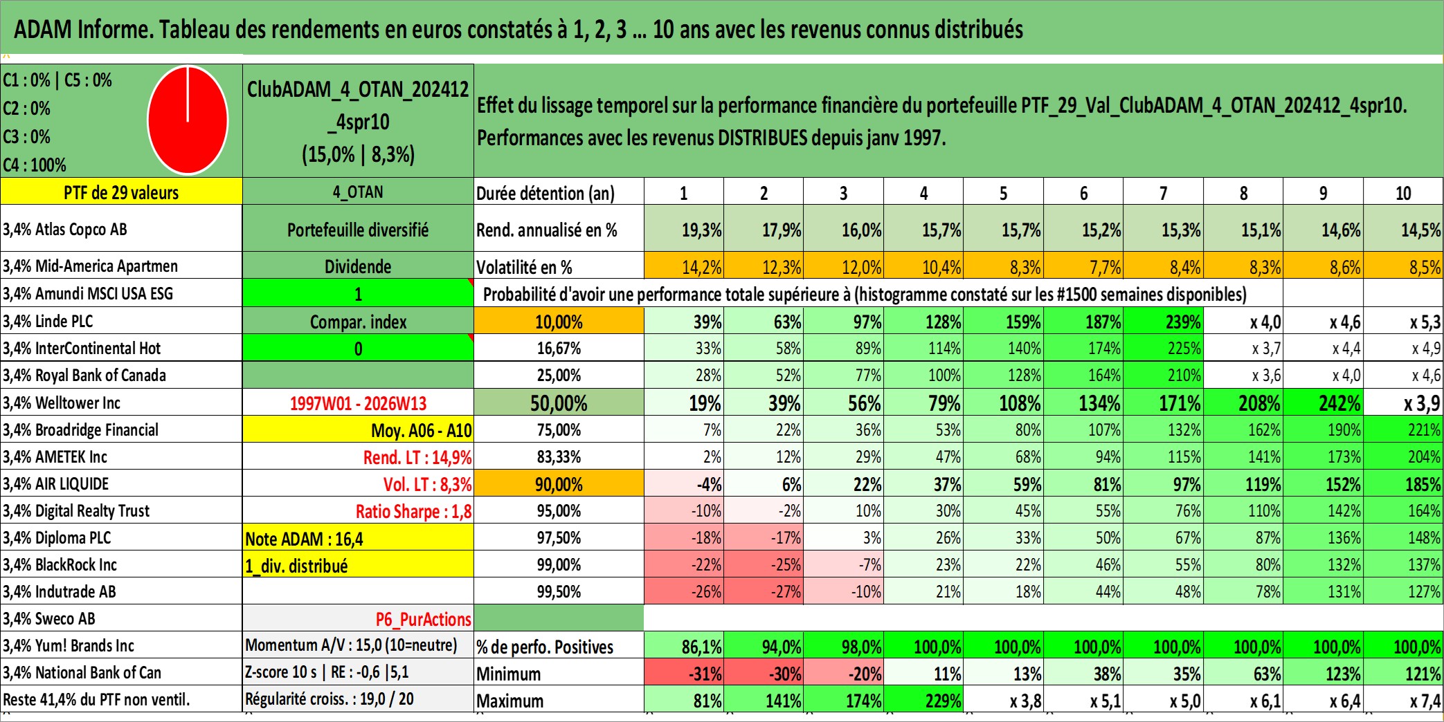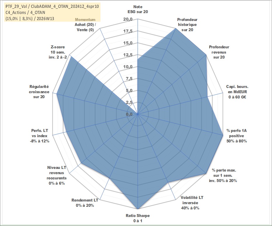 Site dédié aux investisseursPage dédiée sur site financeAnalyse des valorisations hebdomadaires du portefeuille ClubADAM_4_OTAN_202412_4spr10_29actifs avec un profil P6_PurActions. Ce portefeuille est cote en EUR. Les valorisations couvrent les semaines 1997W01 a 2026W13. Les revenus de cet actif financier sont pris en compte depuis la semaine 1997W01. La note globale ESG de cet actif est estimee a 11.5 (apres rebasage entre 0 et 20).
