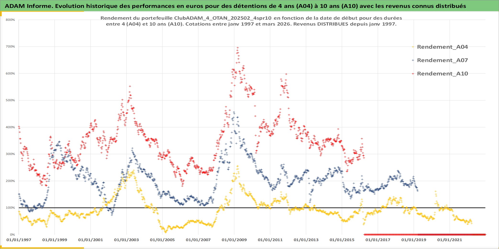 Site dédié aux investisseursPage dédiée sur site financeAnalyse des valorisations hebdomadaires du portefeuille ClubADAM_4_OTAN_202502_4spr10_27actifs avec un profil P6_PurActions. Ce portefeuille est cote en EUR. Les valorisations couvrent les semaines 1997W01 a 2026W13. Les revenus de cet actif financier sont pris en compte depuis la semaine 1997W01. La note globale ESG de cet actif est estimee a 11.3 (apres rebasage entre 0 et 20).
