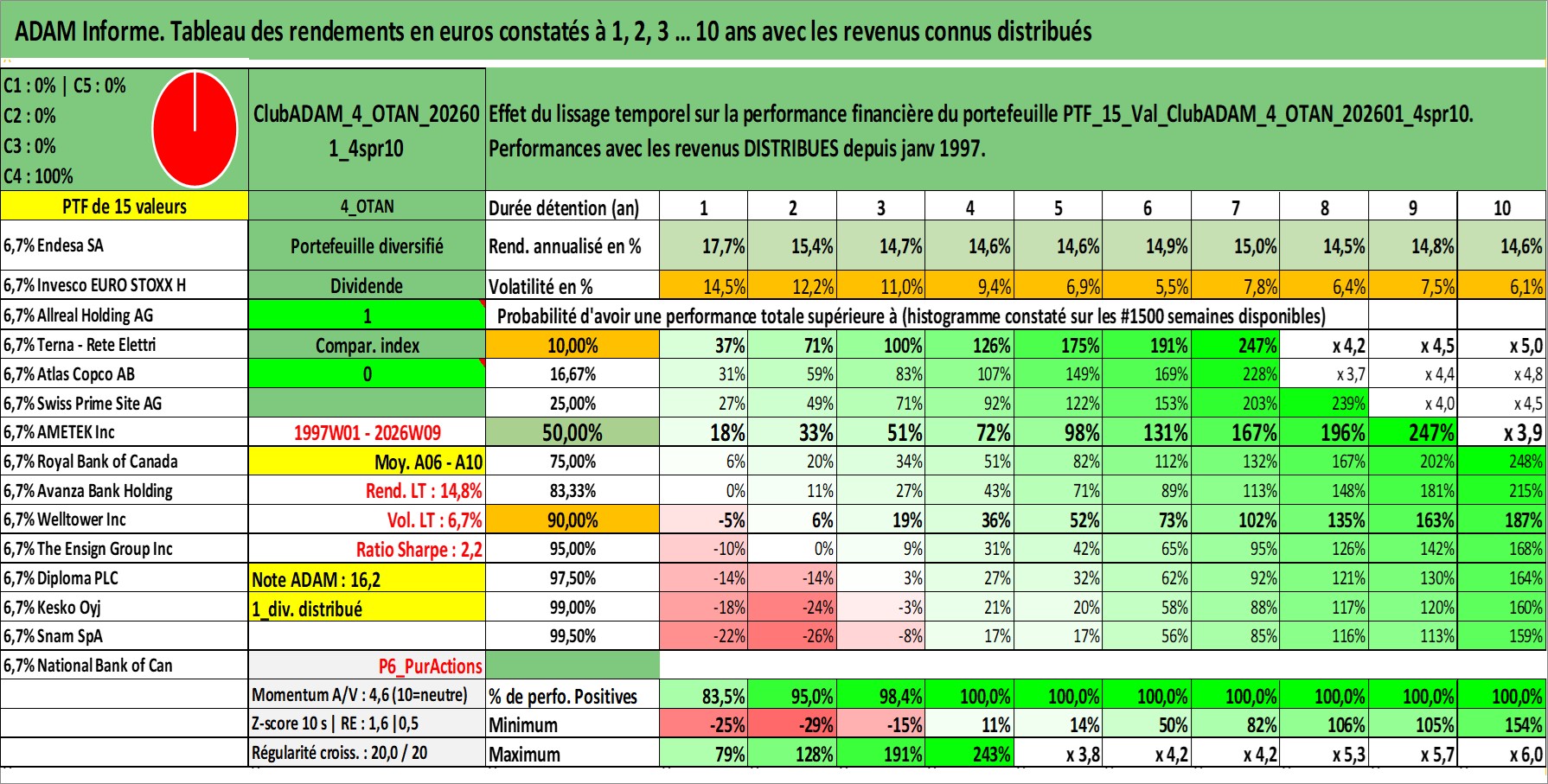 Site dédié aux investisseursPage dédiée sur site financeAnalyse des valorisations hebdomadaires du portefeuille ClubADAM_4_OTAN_202601_4spr10_15actifs avec un profil P6_PurActions. Ce portefeuille est cote en EUR. Les valorisations couvrent les semaines 1997W01 a 2026W09. Les revenus de cet actif financier sont pris en compte depuis la semaine 1997W01. La note globale ESG de cet actif est estimee a 12.9 (apres rebasage entre 0 et 20).