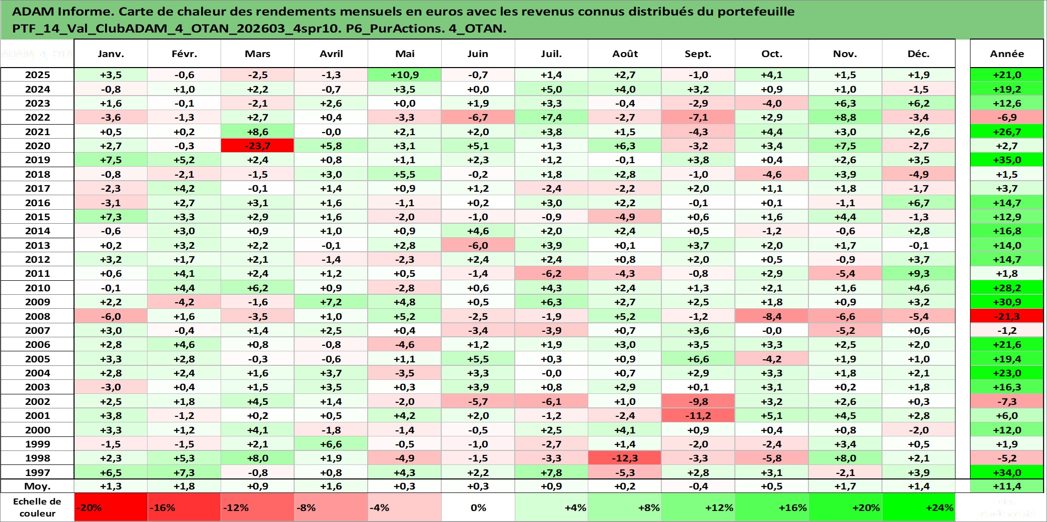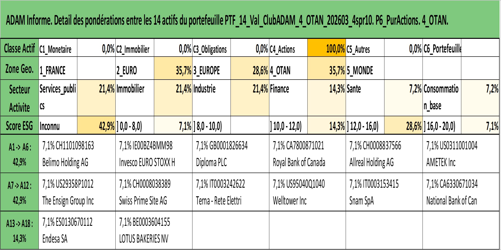 Site dédié aux investisseursPage dédiée sur site financeAnalyse des valorisations hebdomadaires du portefeuille ClubADAM_4_OTAN_202603_4spr10_14actifs avec un profil P6_PurActions. Ce portefeuille est cote en EUR. Les valorisations couvrent les semaines 1997W01 a 2026W13. Les revenus de cet actif financier sont pris en compte depuis la semaine 1997W01. La note globale ESG de cet actif est estimee a 13.1 (apres rebasage entre 0 et 20).
