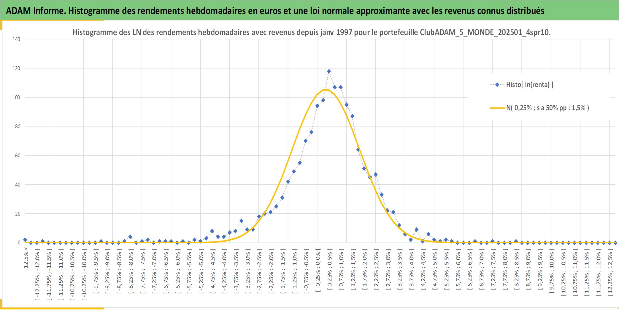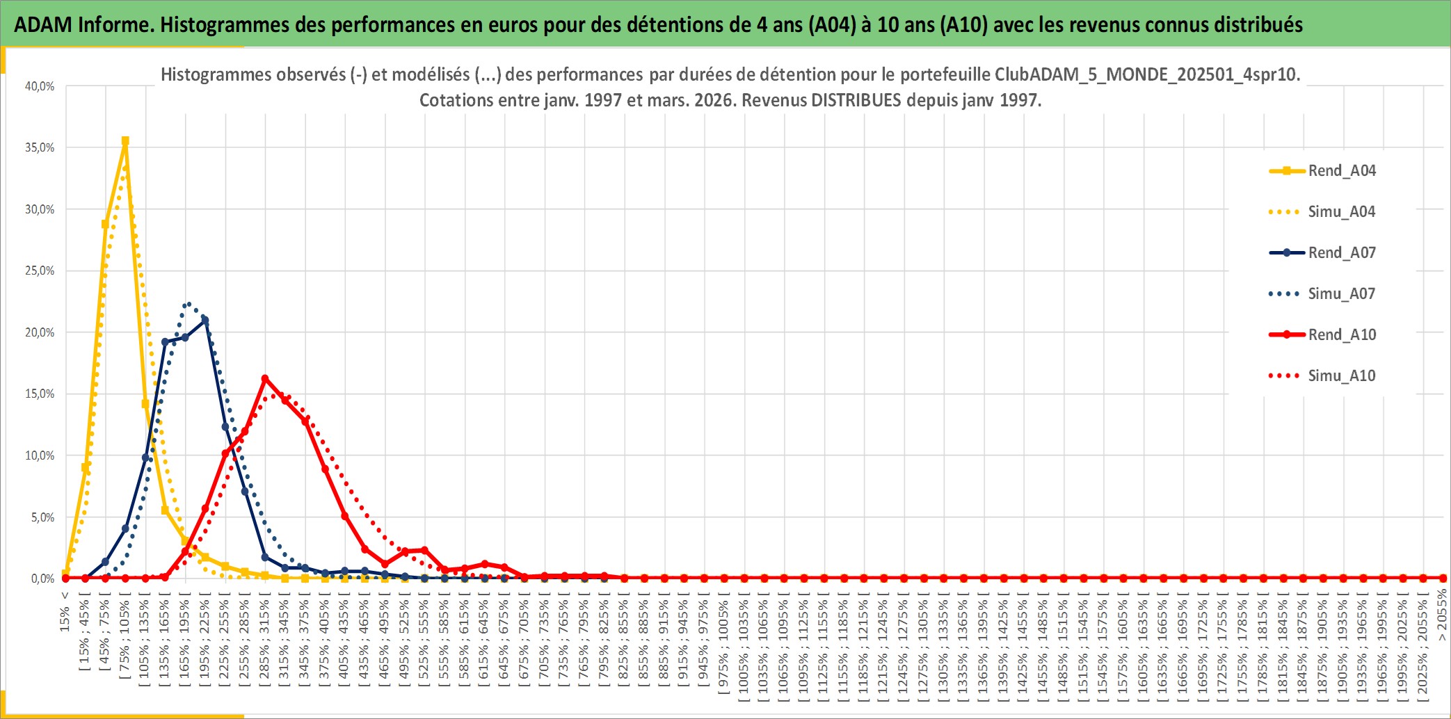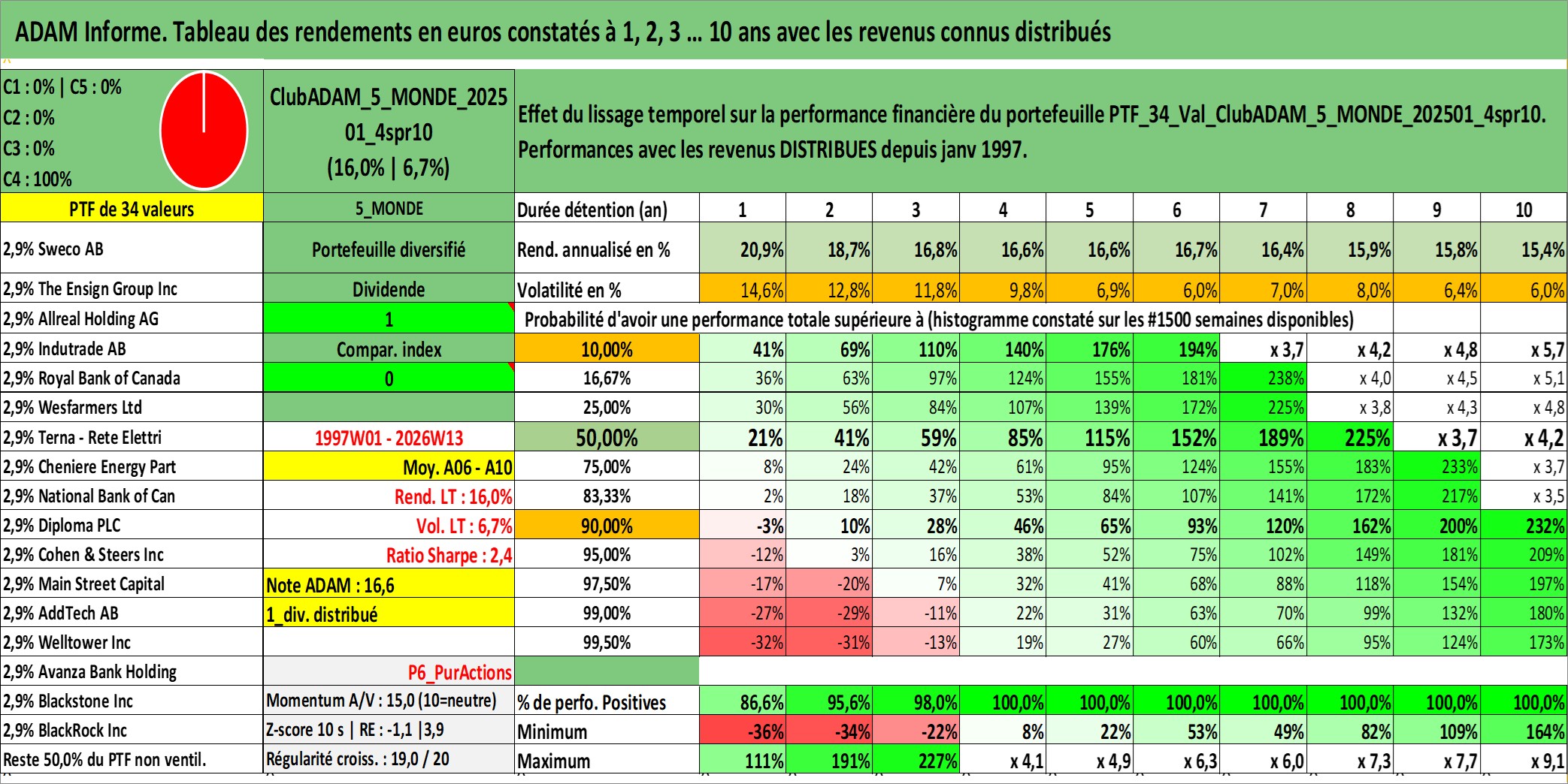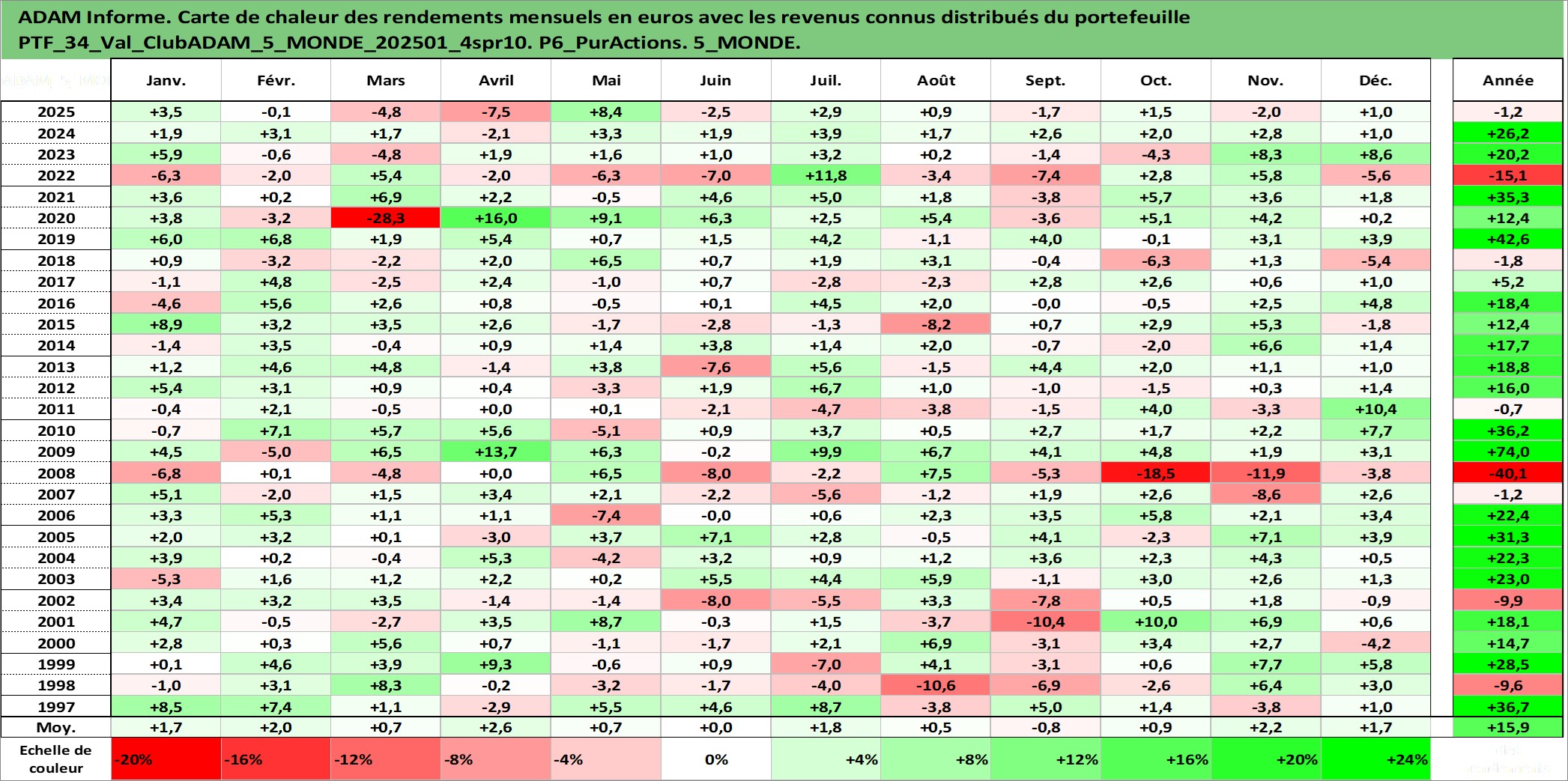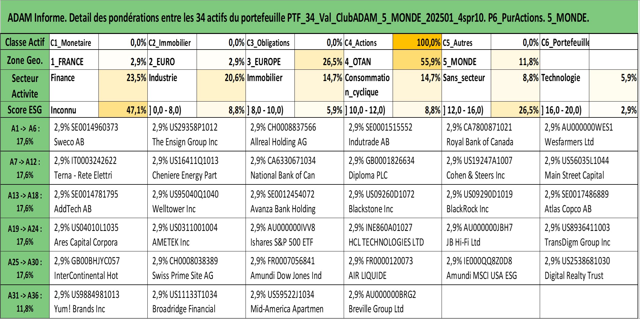 Site dédié aux investisseursPage dédiée sur site financeAnalyse des valorisations hebdomadaires du portefeuille ClubADAM_5_MONDE_202501_4spr10_34actifs avec un profil P6_PurActions. Ce portefeuille est cote en EUR. Les valorisations couvrent les semaines 1997W01 a 2026W13. Les revenus de cet actif financier sont pris en compte depuis la semaine 1997W01. La note globale ESG de cet actif est estimee a 12.1 (apres rebasage entre 0 et 20).