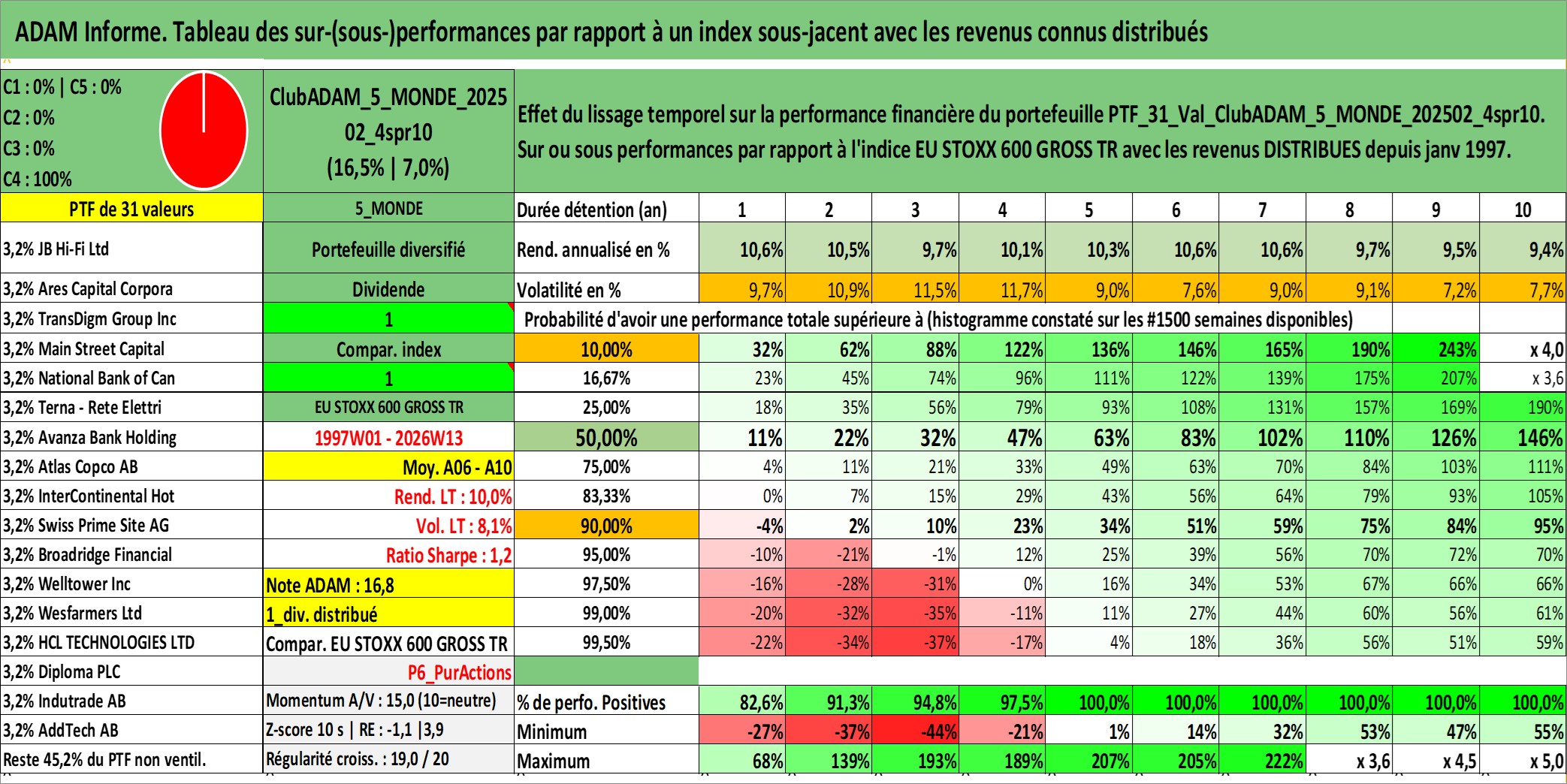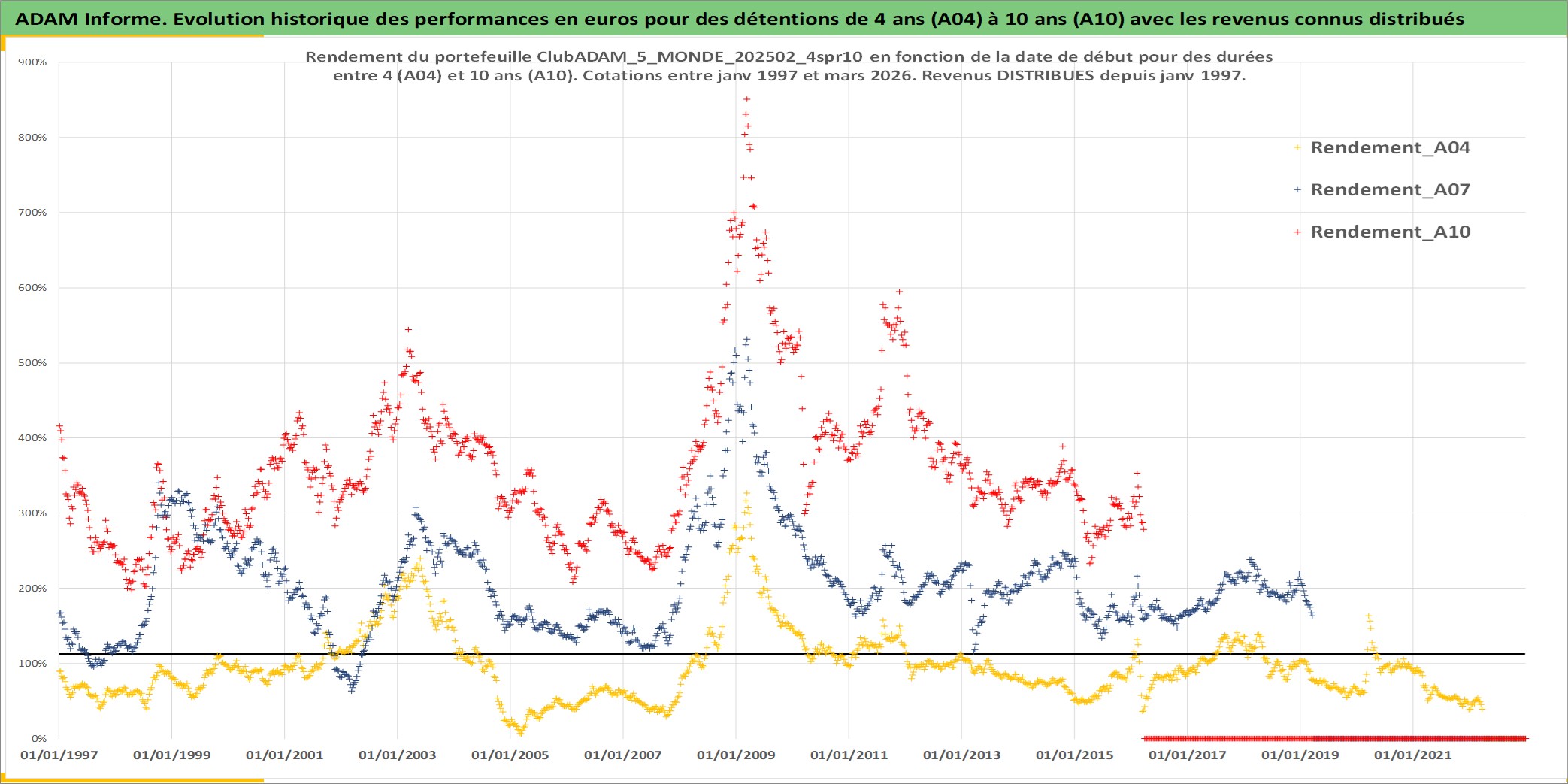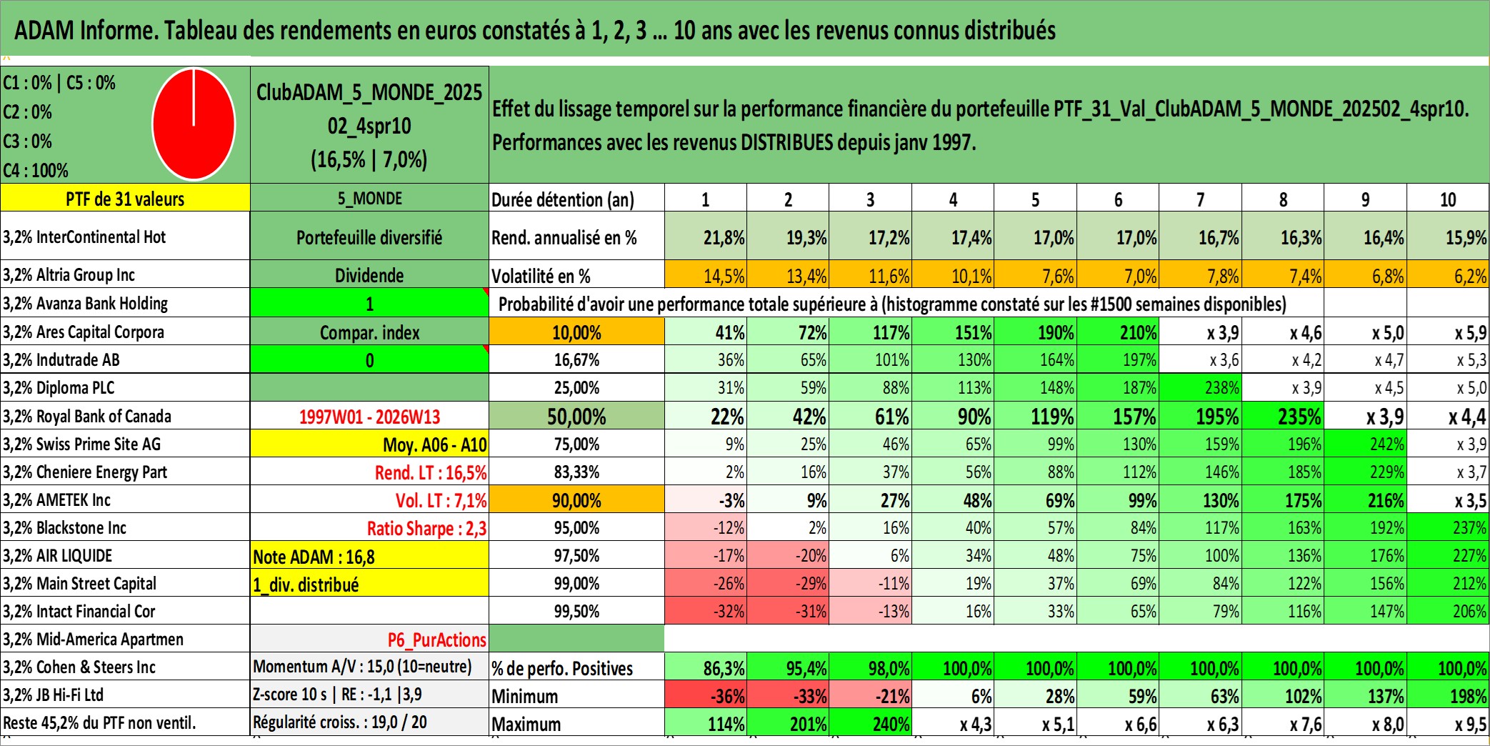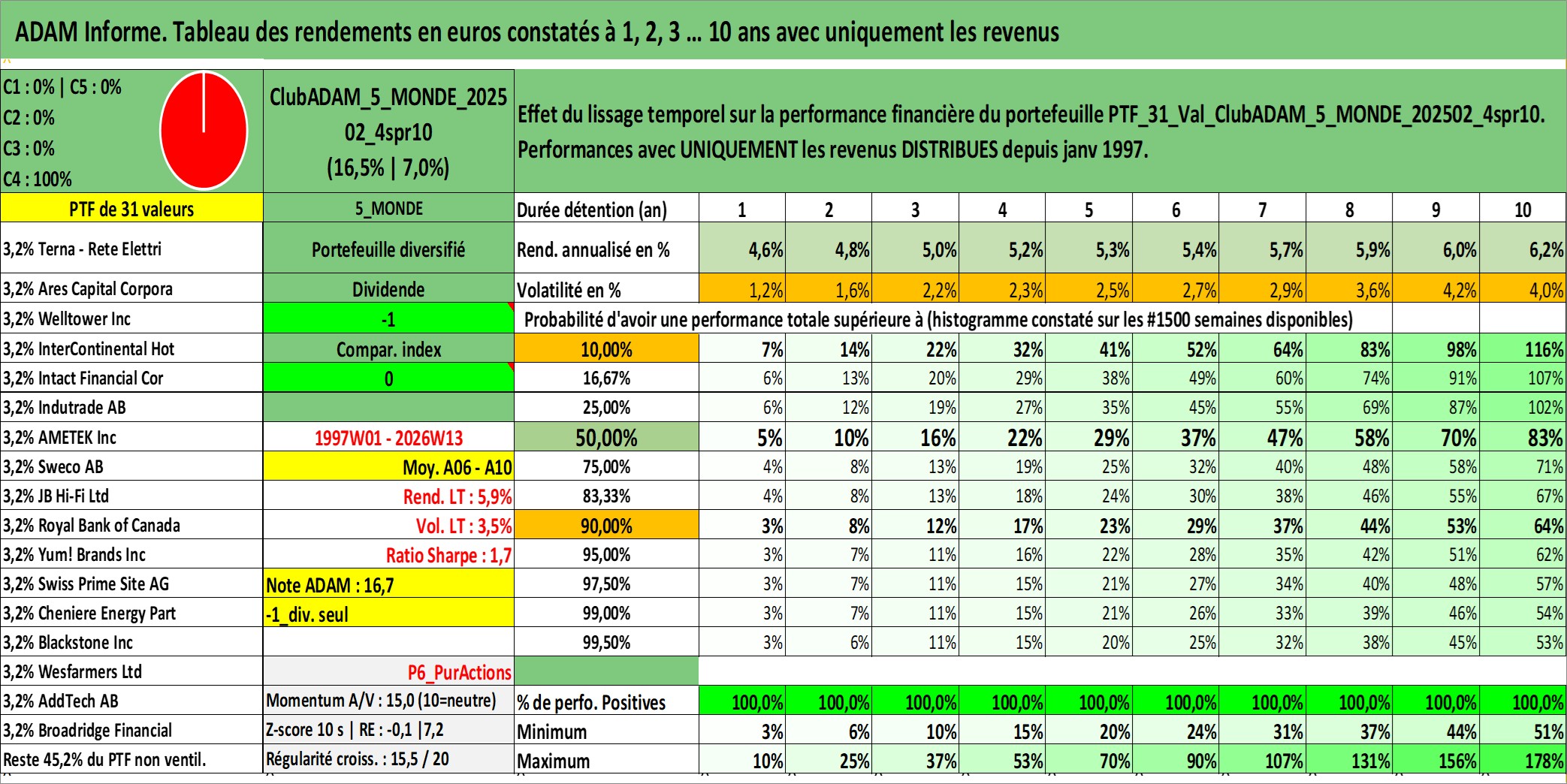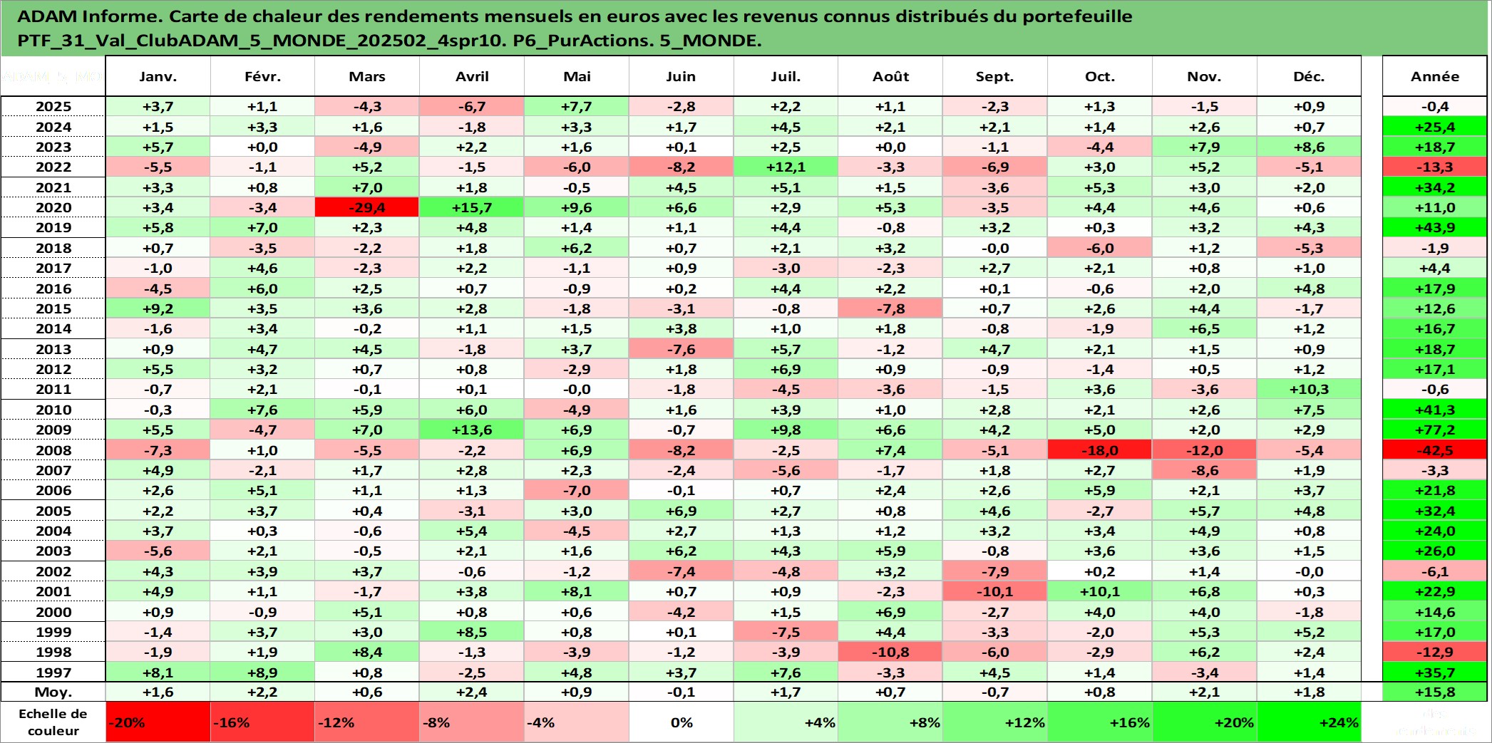 Site dédié aux investisseursPage dédiée sur site financeAnalyse des valorisations hebdomadaires du portefeuille ClubADAM_5_MONDE_202502_4spr10_31actifs avec un profil P6_PurActions. Ce portefeuille est cote en EUR. Les valorisations couvrent les semaines 1997W01 a 2026W13. Les revenus de cet actif financier sont pris en compte depuis la semaine 1997W01. La note globale ESG de cet actif est estimee a 11.7 (apres rebasage entre 0 et 20).