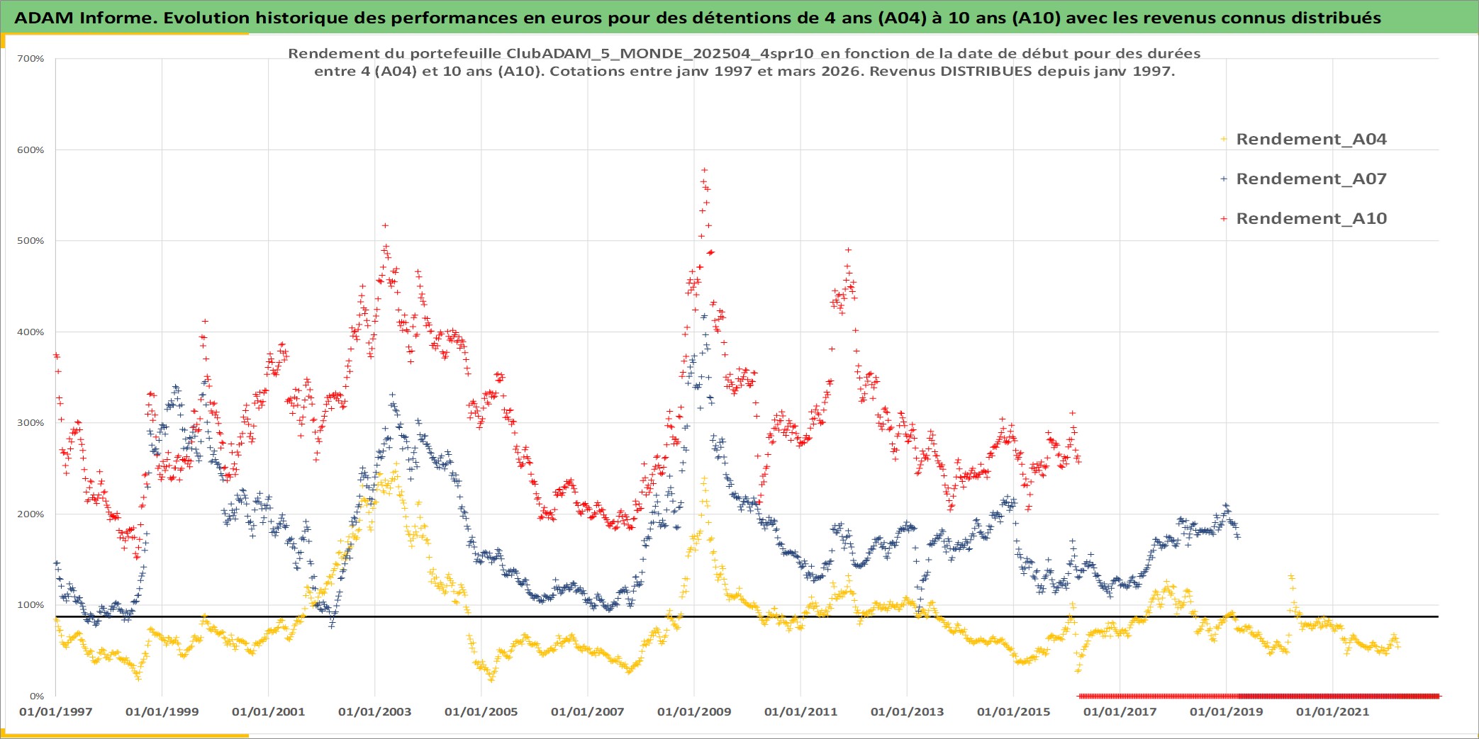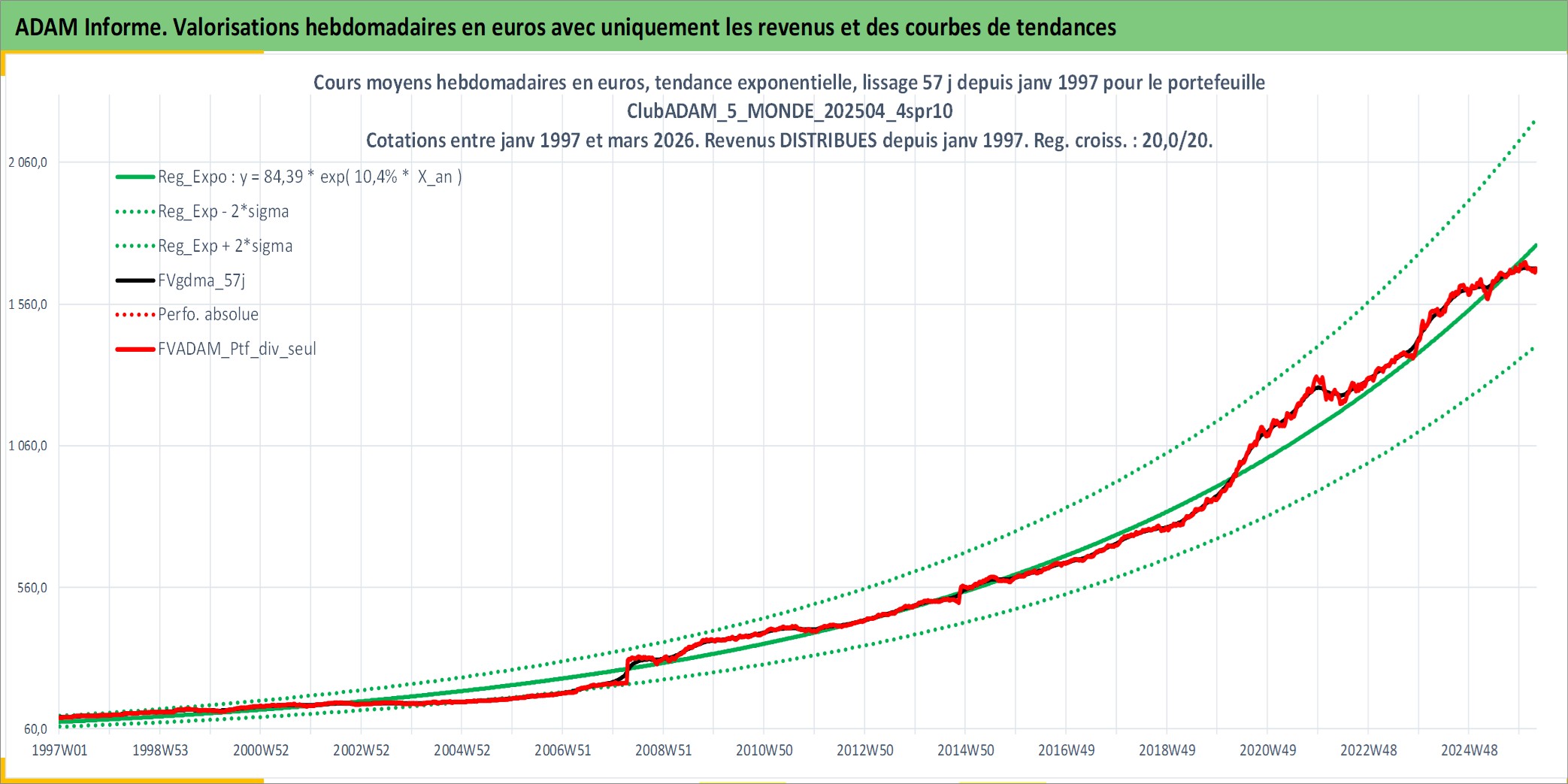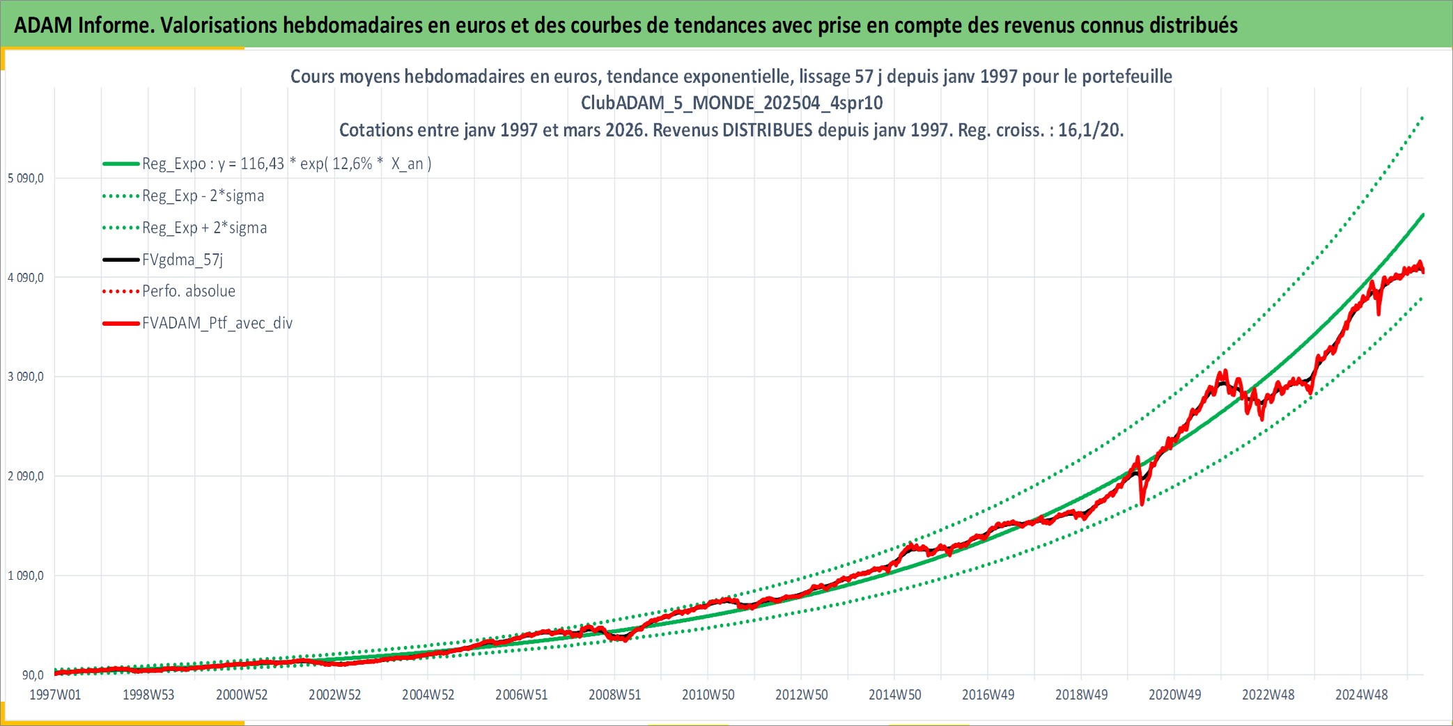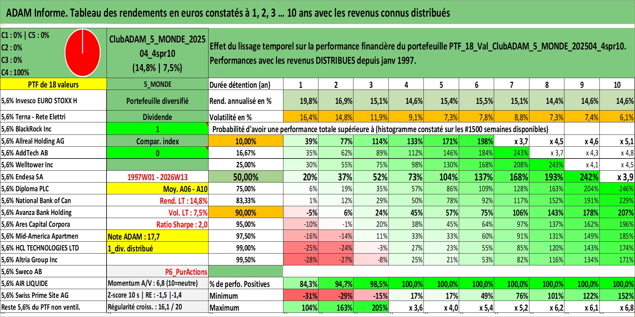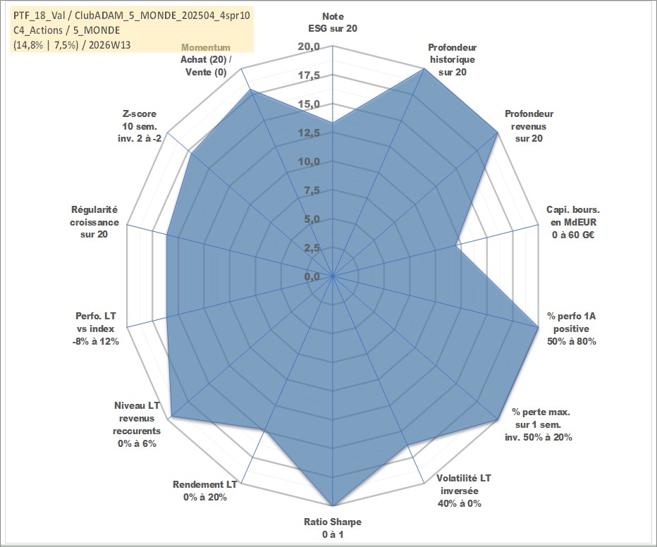 Site dédié aux investisseursPage dédiée sur site financeAnalyse des valorisations hebdomadaires du portefeuille ClubADAM_5_MONDE_202504_4spr10_18actifs avec un profil P6_PurActions. Ce portefeuille est cote en EUR. Les valorisations couvrent les semaines 1997W01 a 2026W13. Les revenus de cet actif financier sont pris en compte depuis la semaine 1997W01. La note globale ESG de cet actif est estimee a 13.3 (apres rebasage entre 0 et 20).