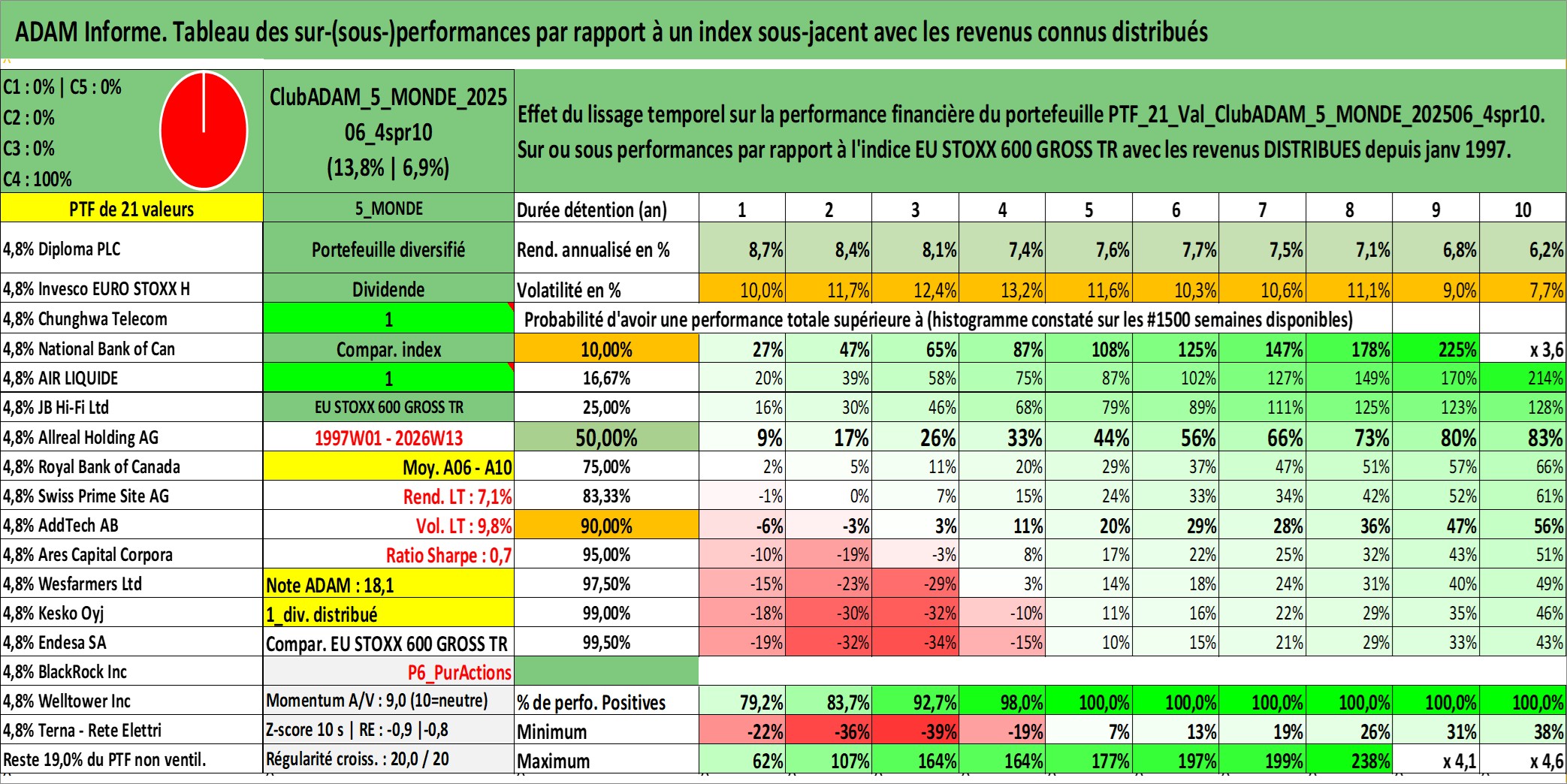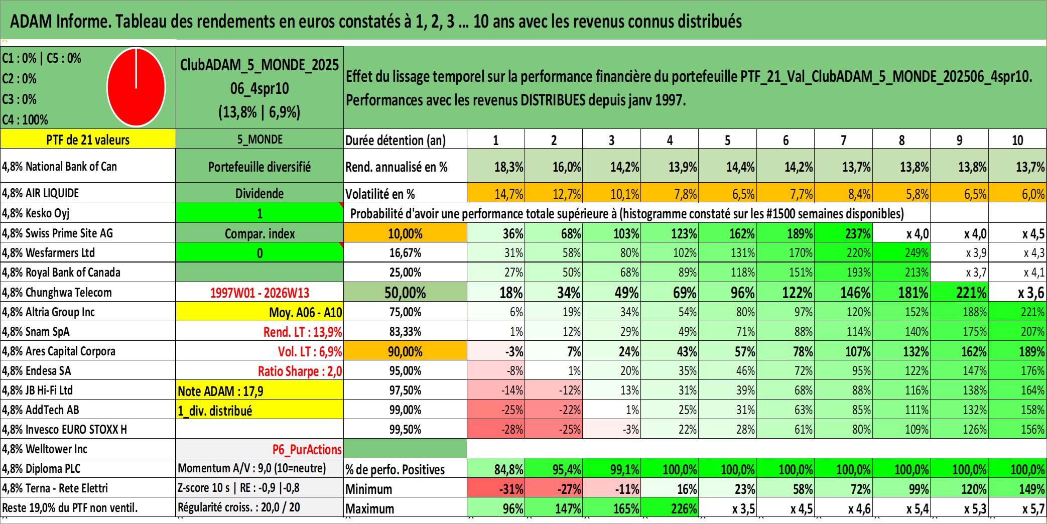 Site dédié aux investisseursPage dédiée sur site financeAnalyse des valorisations hebdomadaires du portefeuille ClubADAM_5_MONDE_202506_4spr10_21actifs avec un profil P6_PurActions. Ce portefeuille est cote en EUR. Les valorisations couvrent les semaines 1997W01 a 2026W13. Les revenus de cet actif financier sont pris en compte depuis la semaine 1997W01. La note globale ESG de cet actif est estimee a 13.0 (apres rebasage entre 0 et 20).