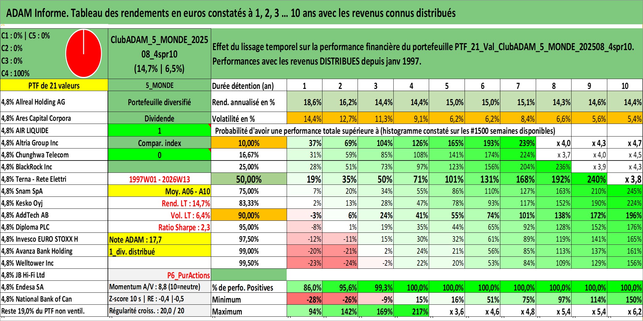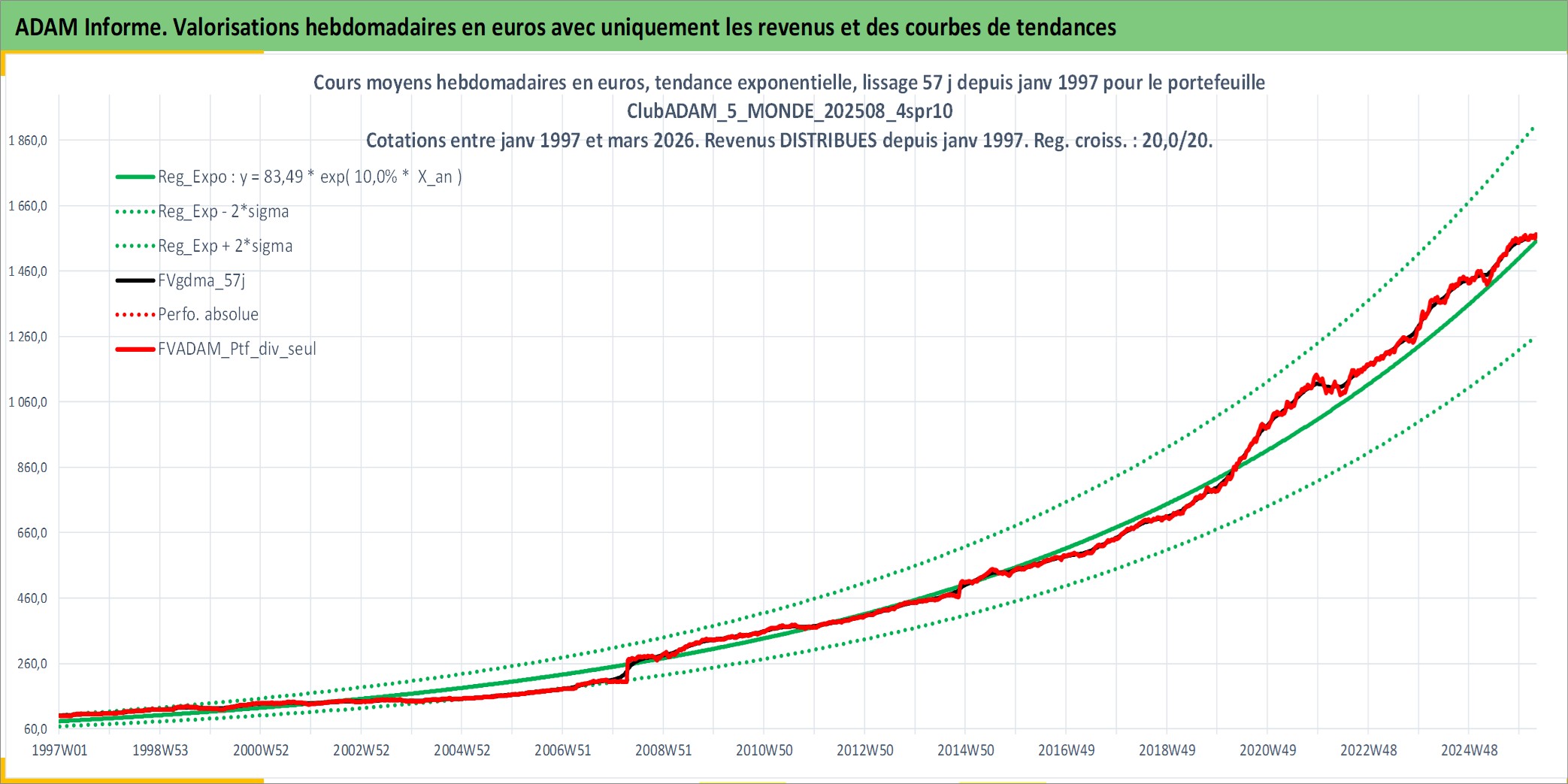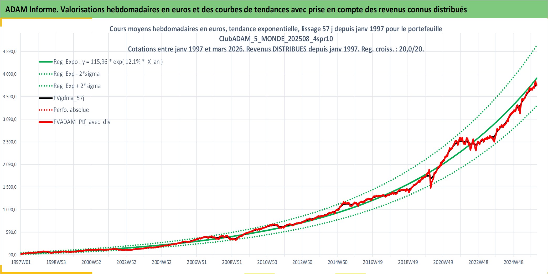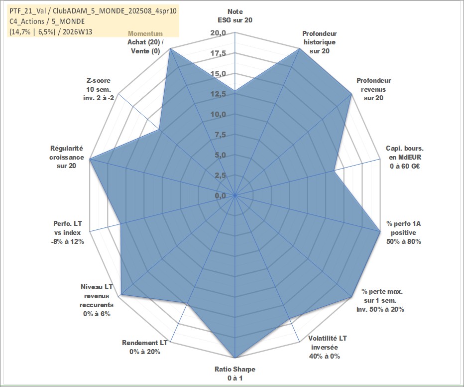 Site dédié aux investisseursPage dédiée sur site financeAnalyse des valorisations hebdomadaires du portefeuille ClubADAM_5_MONDE_202508_4spr10_21actifs avec un profil P6_PurActions. Ce portefeuille est cote en EUR. Les valorisations couvrent les semaines 1997W01 a 2026W13. Les revenus de cet actif financier sont pris en compte depuis la semaine 1997W01. La note globale ESG de cet actif est estimee a 12.8 (apres rebasage entre 0 et 20).
