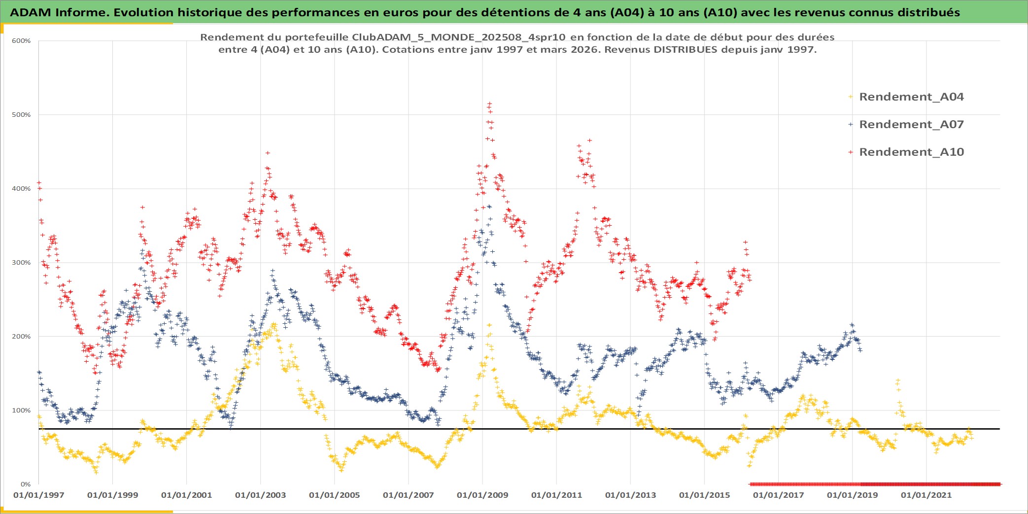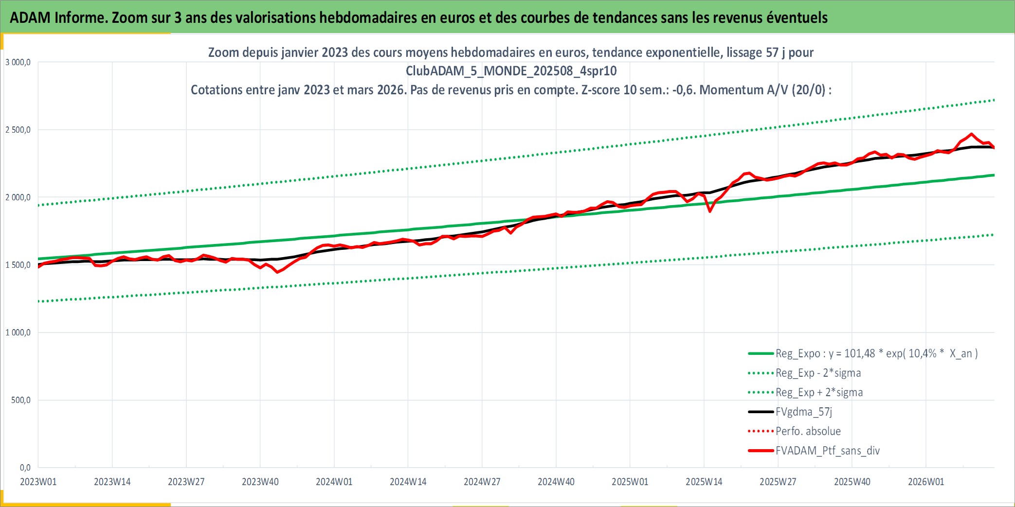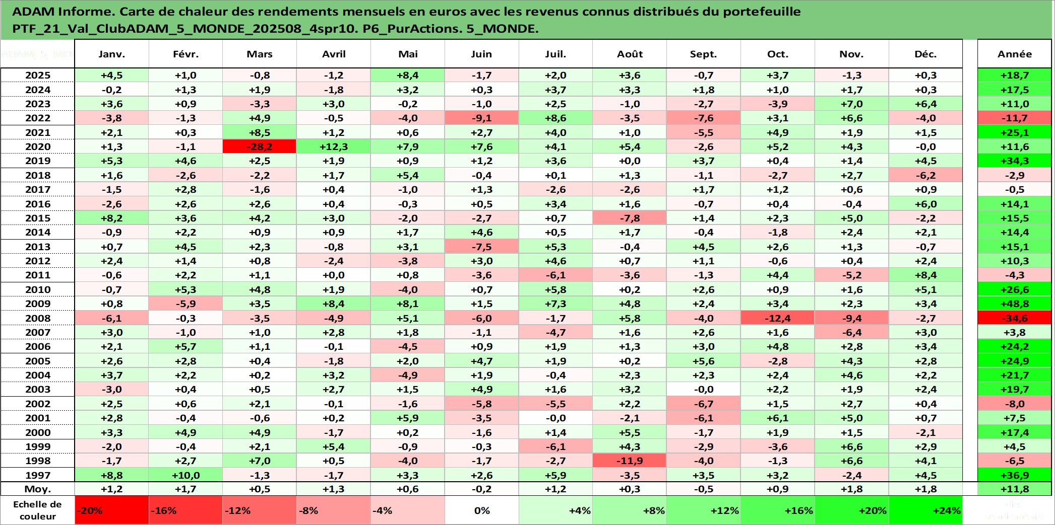 Site dédié aux investisseursPage dédiée sur site financeAnalyse des valorisations hebdomadaires du portefeuille ClubADAM_5_MONDE_202508_4spr10_21actifs avec un profil P6_PurActions. Ce portefeuille est cote en EUR. Les valorisations couvrent les semaines 1997W01 a 2026W13. Les revenus de cet actif financier sont pris en compte depuis la semaine 1997W01. La note globale ESG de cet actif est estimee a 12.8 (apres rebasage entre 0 et 20).