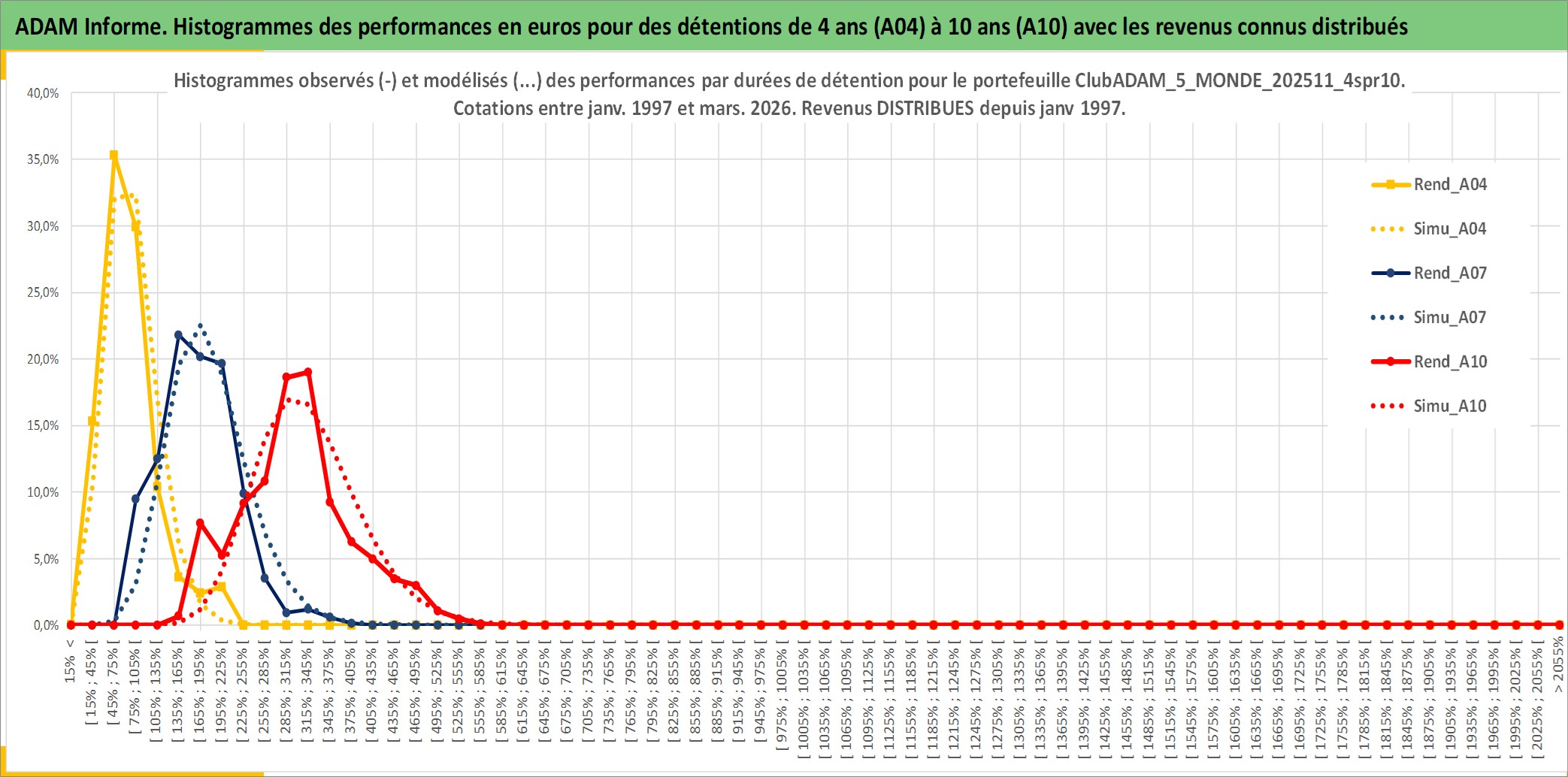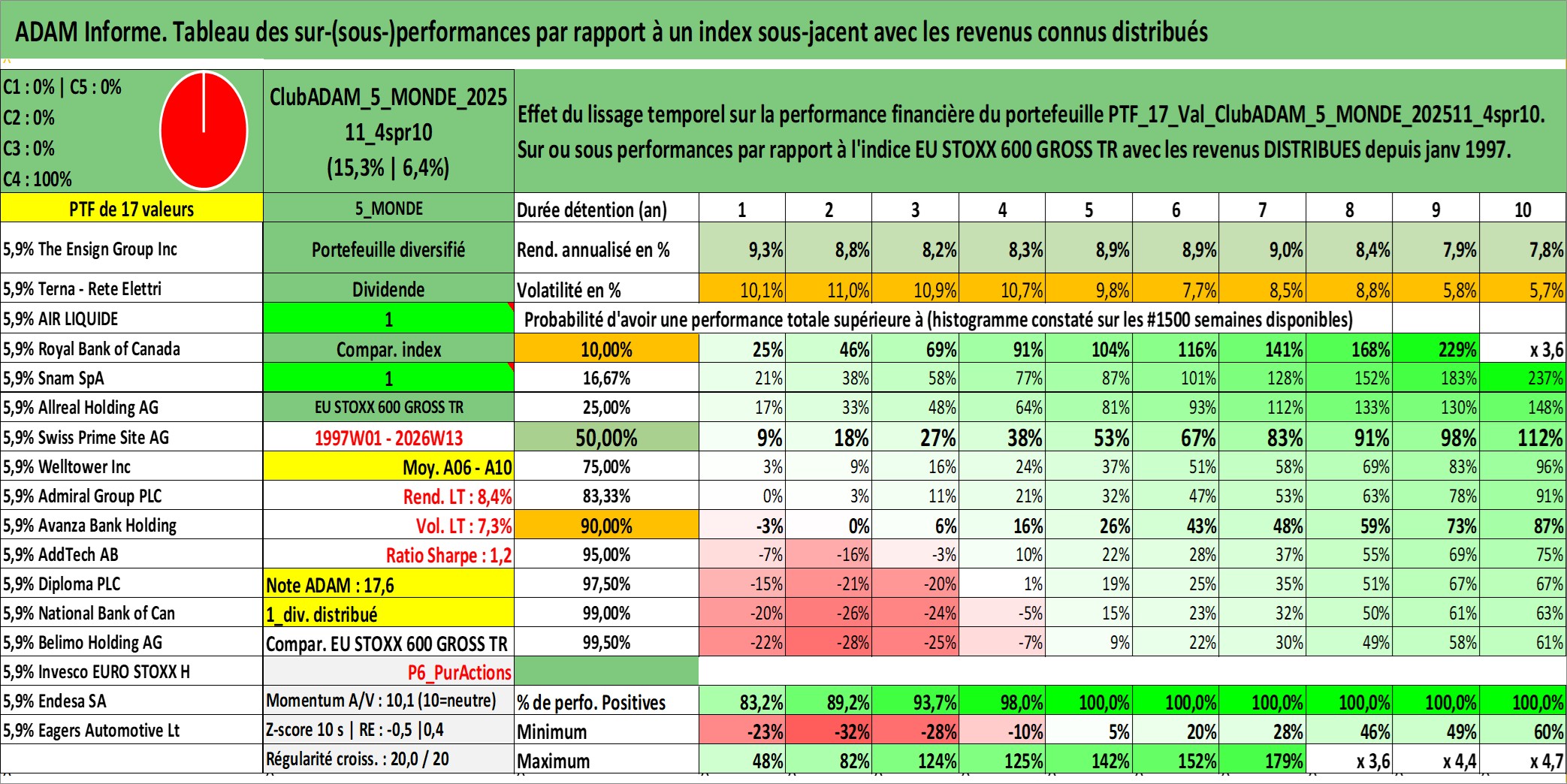 Site dédié aux investisseursPage dédiée sur site financeAnalyse des valorisations hebdomadaires du portefeuille ClubADAM_5_MONDE_202511_4spr10_17actifs avec un profil P6_PurActions. Ce portefeuille est cote en EUR. Les valorisations couvrent les semaines 1997W01 a 2026W13. Les revenus de cet actif financier sont pris en compte depuis la semaine 1997W01. La note globale ESG de cet actif est estimee a 13.3 (apres rebasage entre 0 et 20).