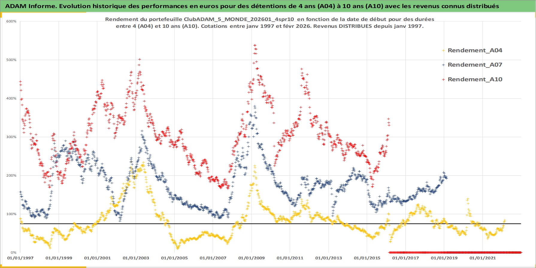 Site dédié aux investisseursPage dédiée sur site financeAnalyse des valorisations hebdomadaires du portefeuille ClubADAM_5_MONDE_202601_4spr10_16actifs avec un profil P6_PurActions. Ce portefeuille est cote en EUR. Les valorisations couvrent les semaines 1997W01 a 2026W09. Les revenus de cet actif financier sont pris en compte depuis la semaine 1997W01. La note globale ESG de cet actif est estimee a 12.9 (apres rebasage entre 0 et 20).