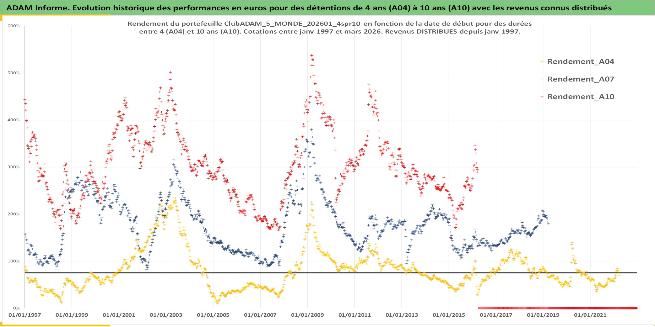 Site dédié aux investisseursPage dédiée sur site financeAnalyse des valorisations hebdomadaires du portefeuille ClubADAM_5_MONDE_202601_4spr10_16actifs avec un profil P6_PurActions. Ce portefeuille est cote en EUR. Les valorisations couvrent les semaines 1997W01 a 2026W13. Les revenus de cet actif financier sont pris en compte depuis la semaine 1997W01. La note globale ESG de cet actif est estimee a 12.9 (apres rebasage entre 0 et 20).