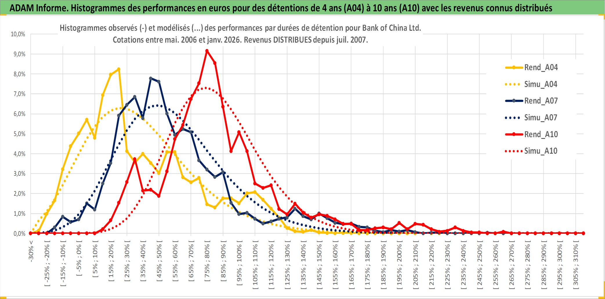 Site dédié aux investisseursPage dédiée sur site financeAnalyse des valorisations hebdomadaires de l'action Bank of China Ltd. Cet actif est cote en HKD. Les valorisations sont en contrevaleur EURO et couvrent les semaines 2006W22 a 2026W05. Les revenus de cet actif financier sont pris en compte depuis la semaine 2007W27. La note globale ESG de cet actif est estimee a 3.0 (apres rebasage entre 0 et 20).