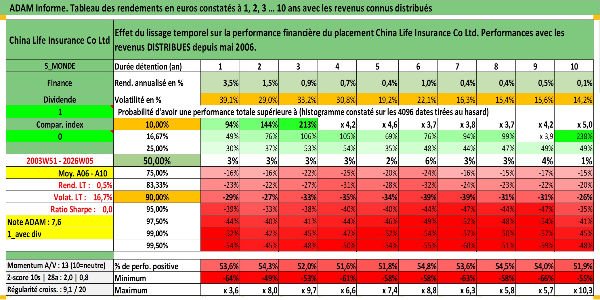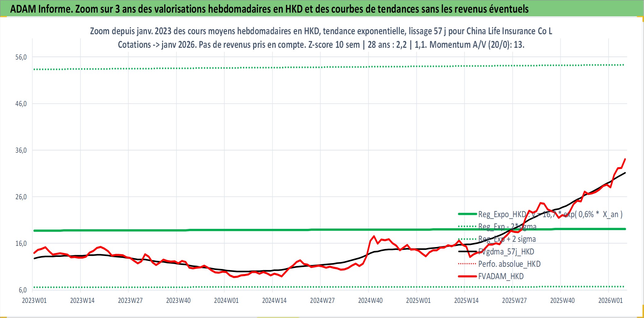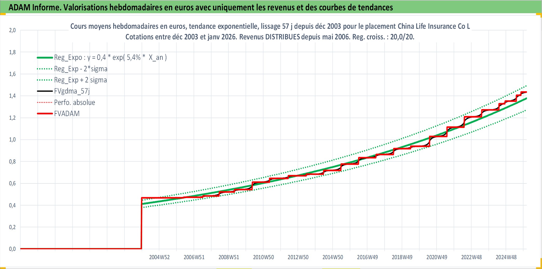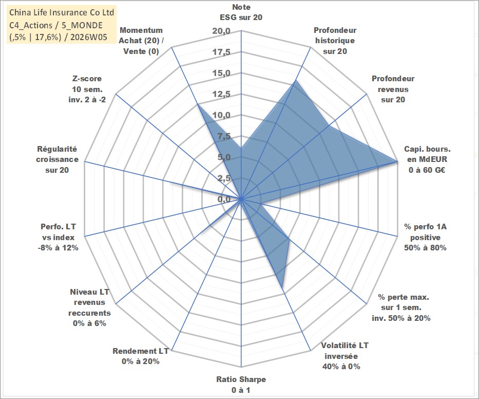 Site dédié aux investisseursPage dédiée sur site financeAnalyse des valorisations hebdomadaires de l'action China Life Insurance Co Ltd. Cet actif est cote en HKD. Les valorisations sont en contrevaleur EURO et couvrent les semaines 2003W51 a 2026W05. Les revenus de cet actif financier sont pris en compte depuis la semaine 2006W20. La note globale ESG de cet actif est estimee a 6.0 (apres rebasage entre 0 et 20).