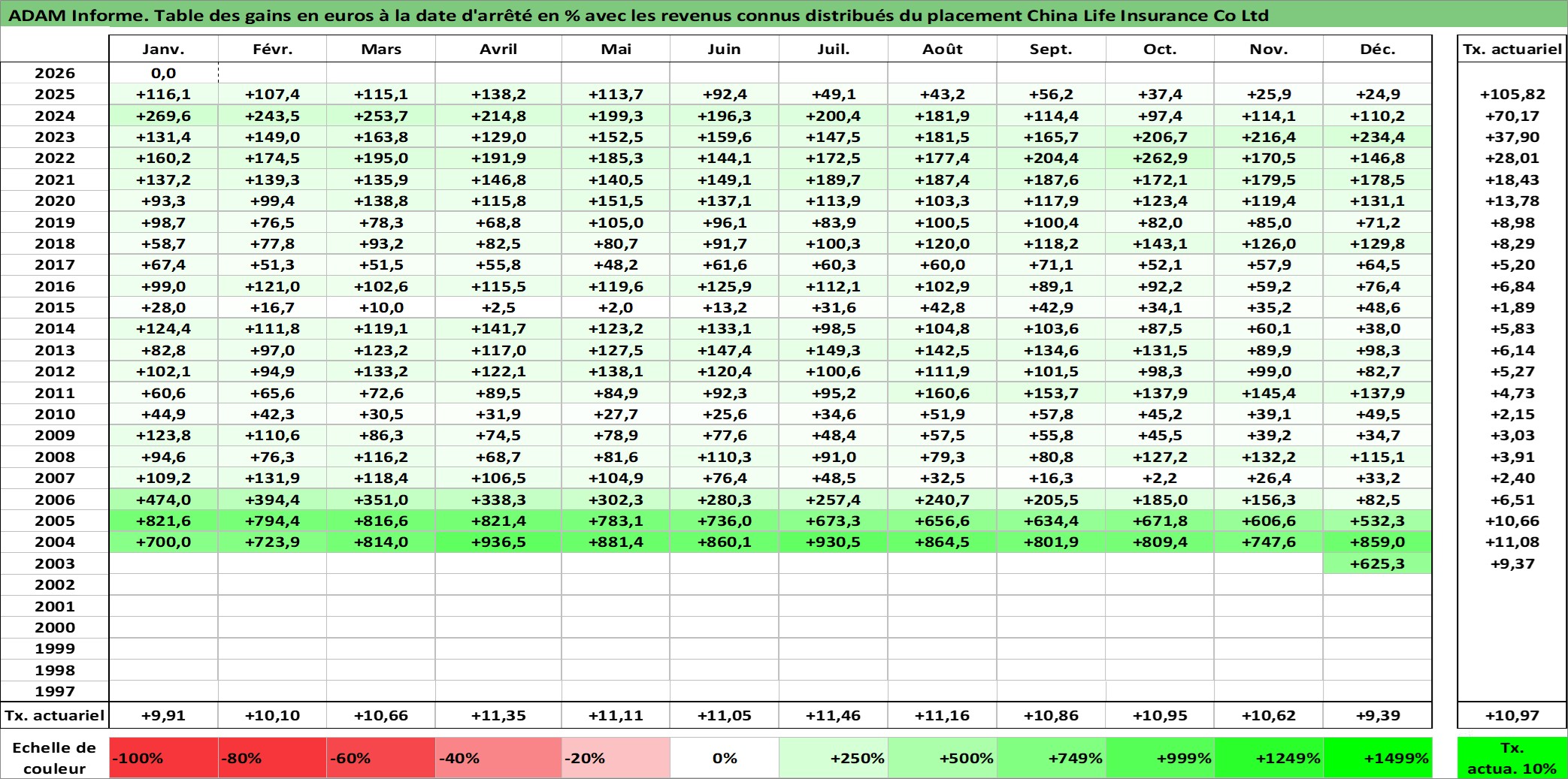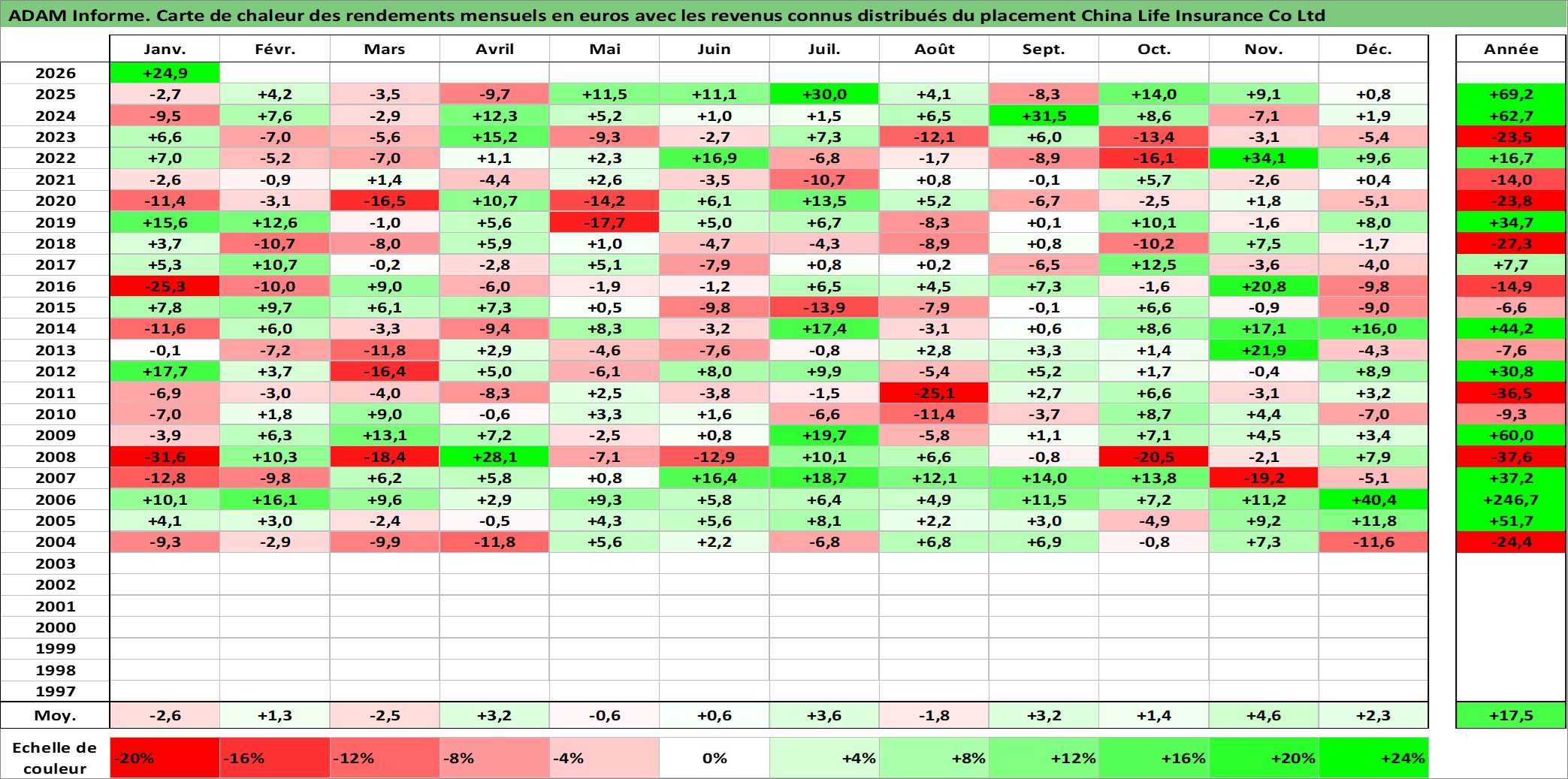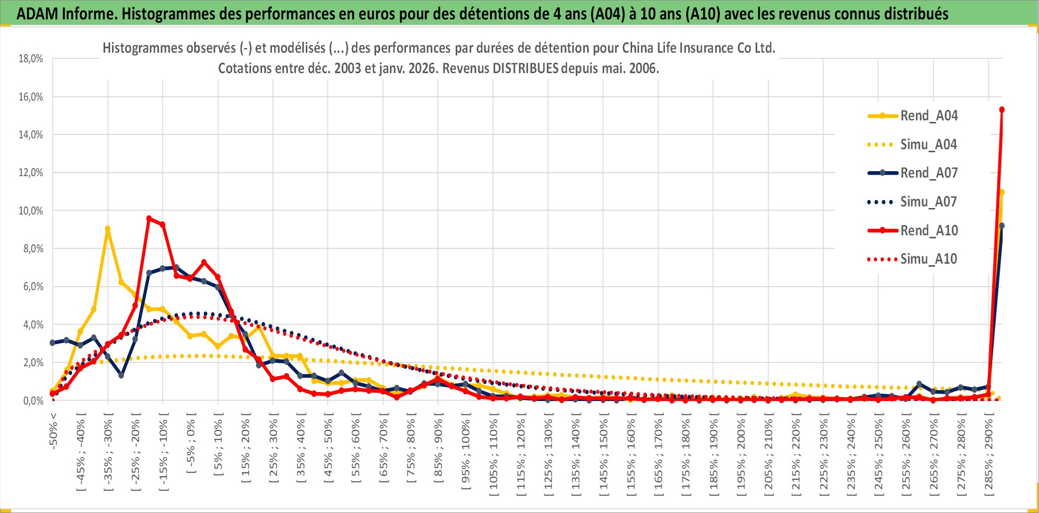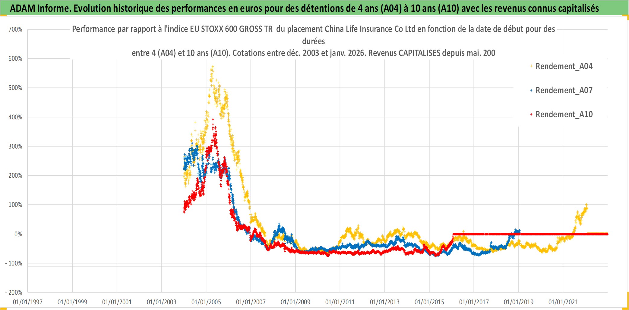Site dédié aux investisseursPage dédiée sur site financeAnalyse des valorisations hebdomadaires de l'action China Life Insurance Co Ltd. Cet actif est cote en HKD. Les valorisations sont en contrevaleur EURO et couvrent les semaines 2003W51 a 2026W05. Les revenus de cet actif financier sont pris en compte depuis la semaine 2006W20. La note globale ESG de cet actif est estimee a 6.0 (apres rebasage entre 0 et 20).