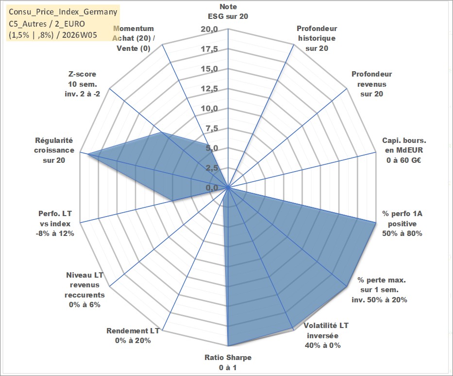 Site dédié aux investisseursPage dédiée sur site financeAnalyse des valorisations hebdomadaires de l'action Consu_Price_Index_Germany. Cet actif est cote en EUR. Les valorisations couvrent les semaines 1997W01 a 2026W05. Les revenus de cet actif financier ne sont pas connus car non existants ou non disponibles sur le site Yahoo Finance. La note ESG de cet actif n'est pas connue.