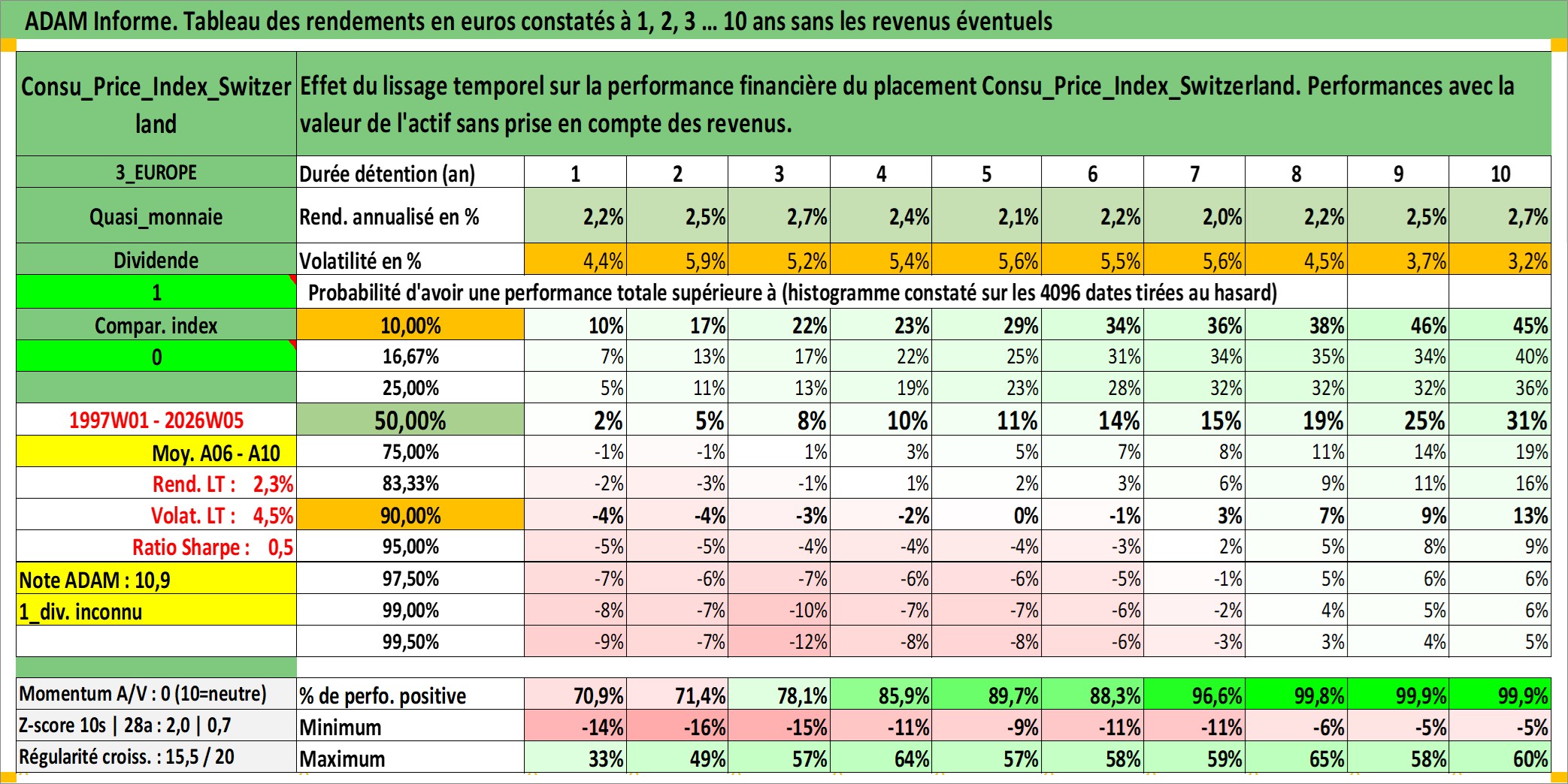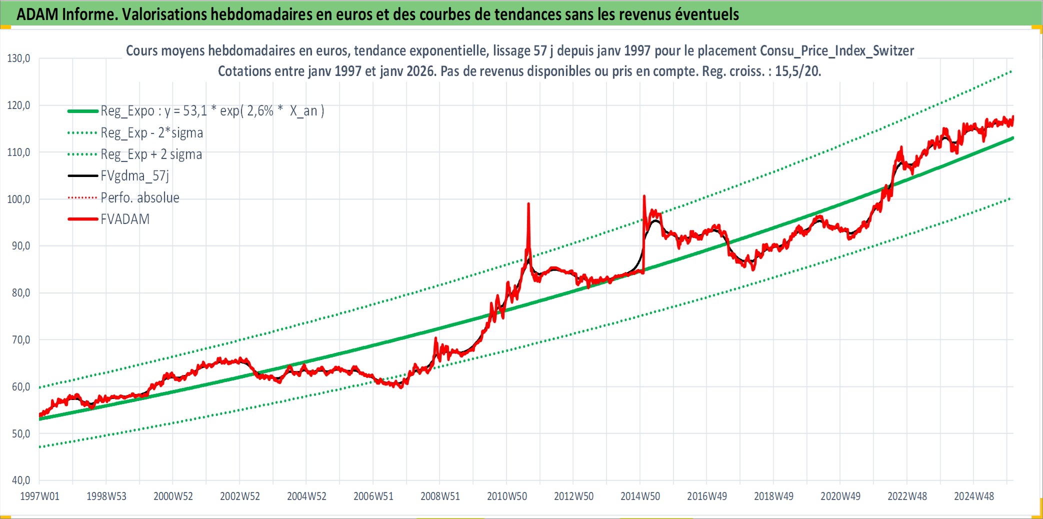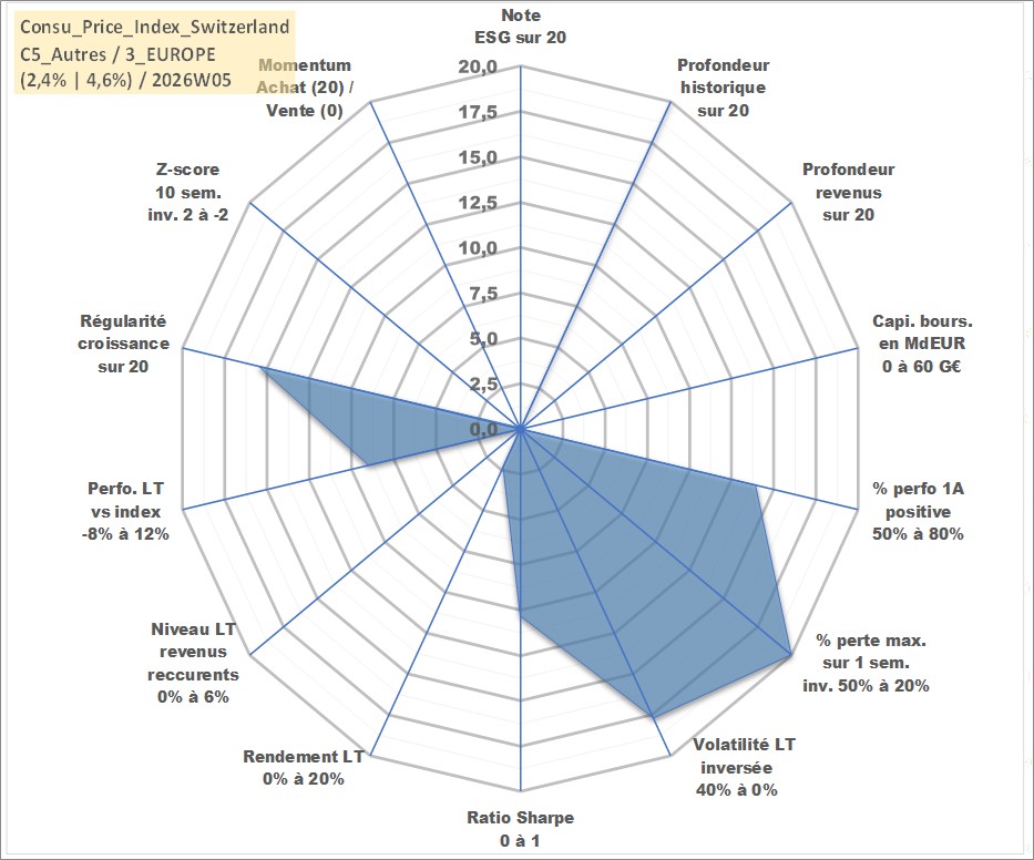 Site dédié aux investisseursPage dédiée sur site financeAnalyse des valorisations hebdomadaires de l'action Consu_Price_Index_Switzerland. Cet actif est cote en CHF. Les valorisations sont en contrevaleur EURO et couvrent les semaines 1997W01 a 2026W05. Les revenus de cet actif financier ne sont pas connus car non existants ou non disponibles sur le site Yahoo Finance. La note ESG de cet actif n'est pas connue.
