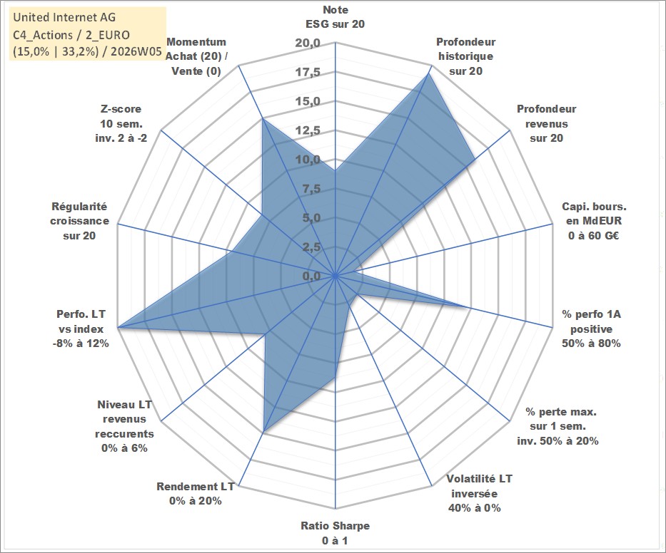 Site dédié aux investisseursPage dédiée sur site financeAnalyse des valorisations hebdomadaires de l'action United Internet AG. Cet actif est cote en EUR. Les valorisations couvrent les semaines 1998W42 a 2026W05. Les revenus de cet actif financier sont pris en compte depuis la semaine 2003W21. La note globale ESG de cet actif est estimee a 9.0 (apres rebasage entre 0 et 20).